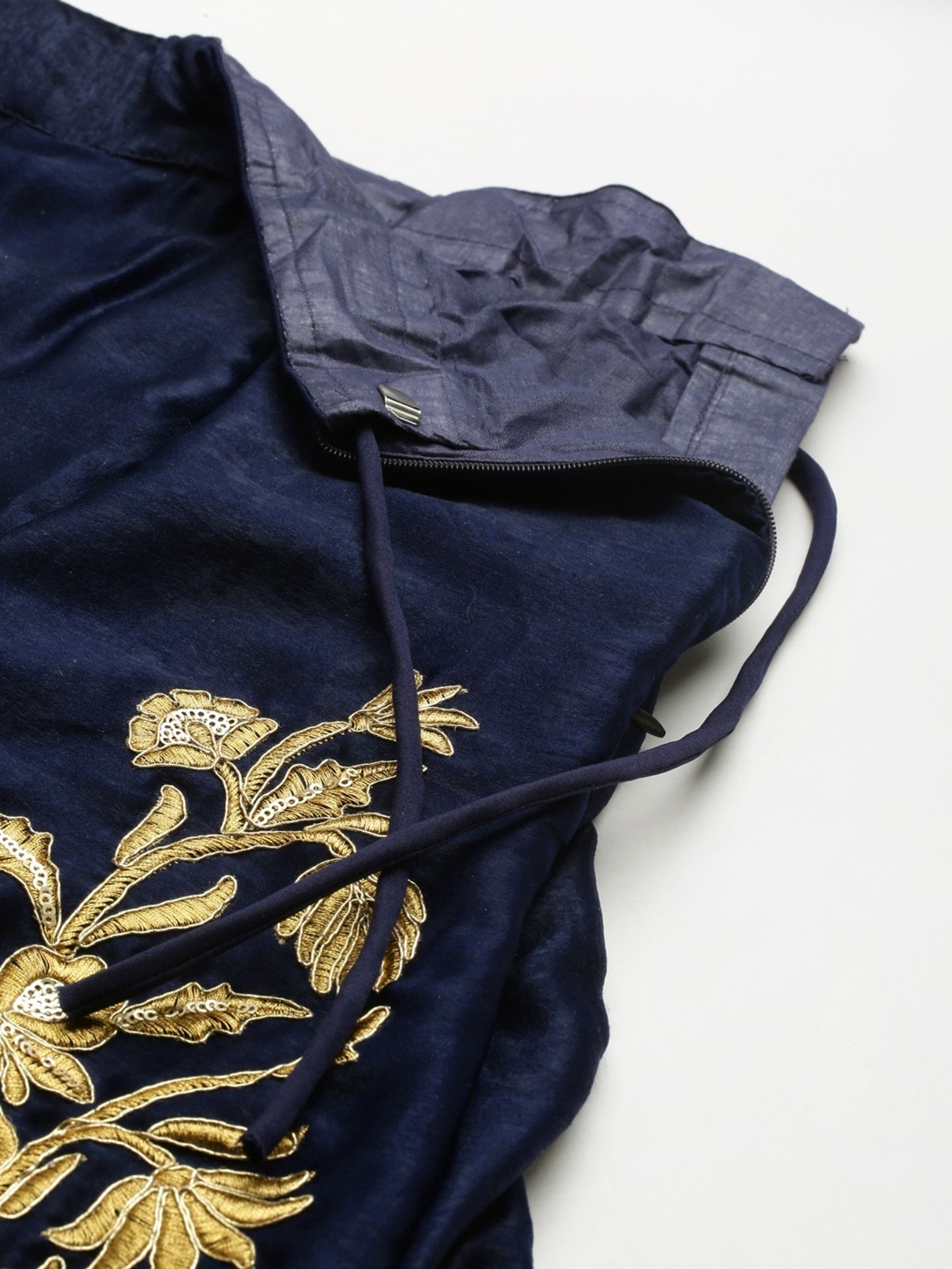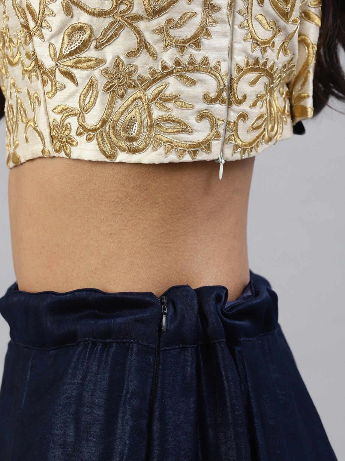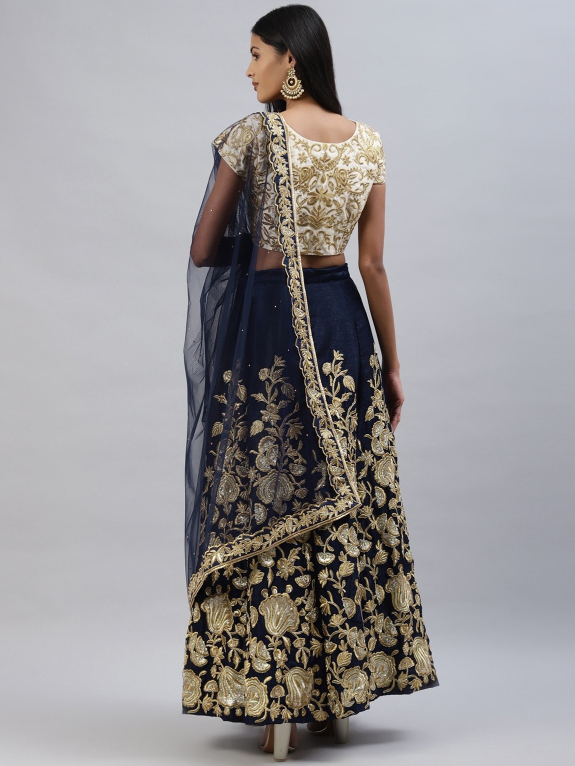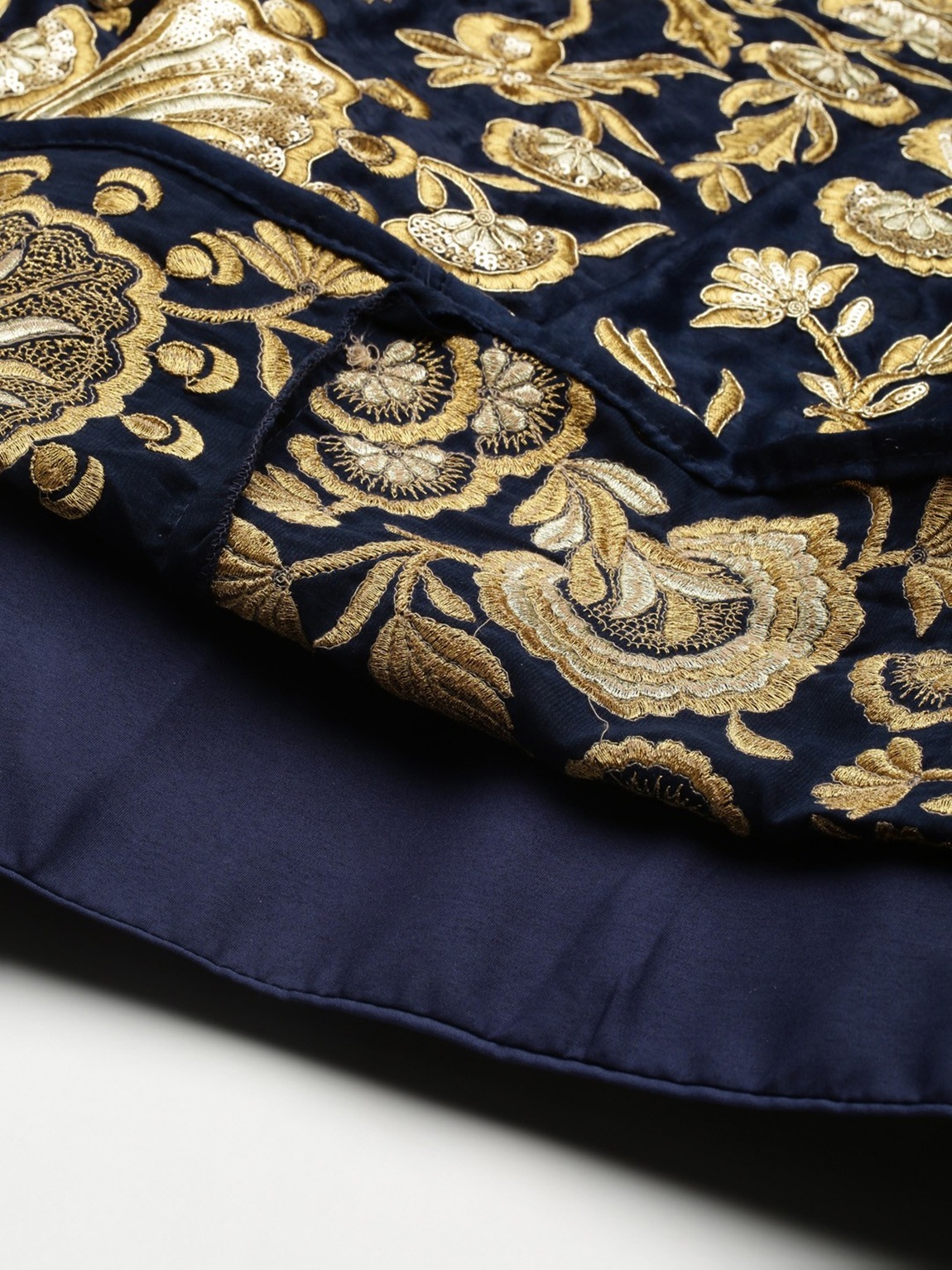Elevate your ethnic look with this navy blue velvet lehenga featuring embroidered work. Designed for festive occasions and celebrations, it offers a graceful flow and timeless appeal.Crafted from lightweight velvet fabric with a semi-stitched finish, this lehenga ensures comfort and easy customization. Dry clean recommended.