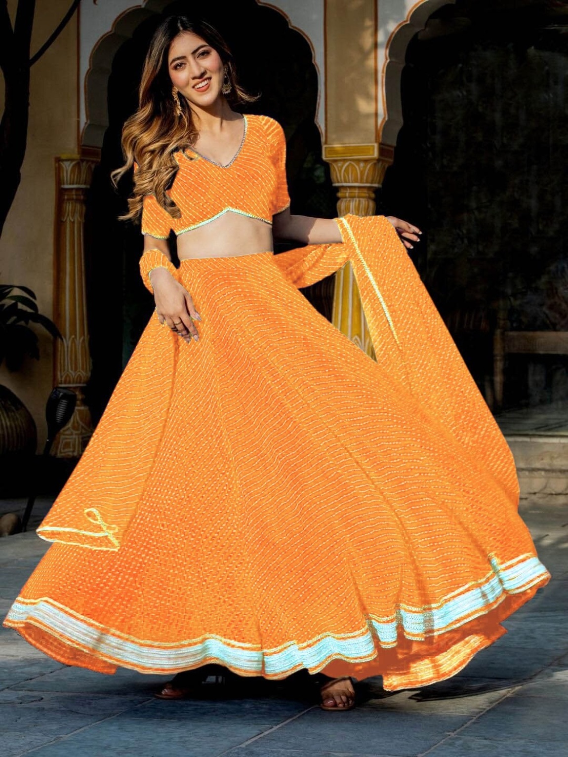 Elevate your ethnic look with this orange georgette lehenga featuring lehariya work. Designed for festive occasions and celebrations, it offers a graceful flow and timeless appeal.Crafted from lightweight georgette fabric with a semi-stitched finish, this lehenga ensures comfort and easy customization. Dry clean recommended.