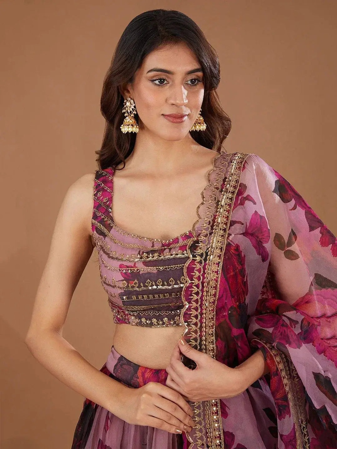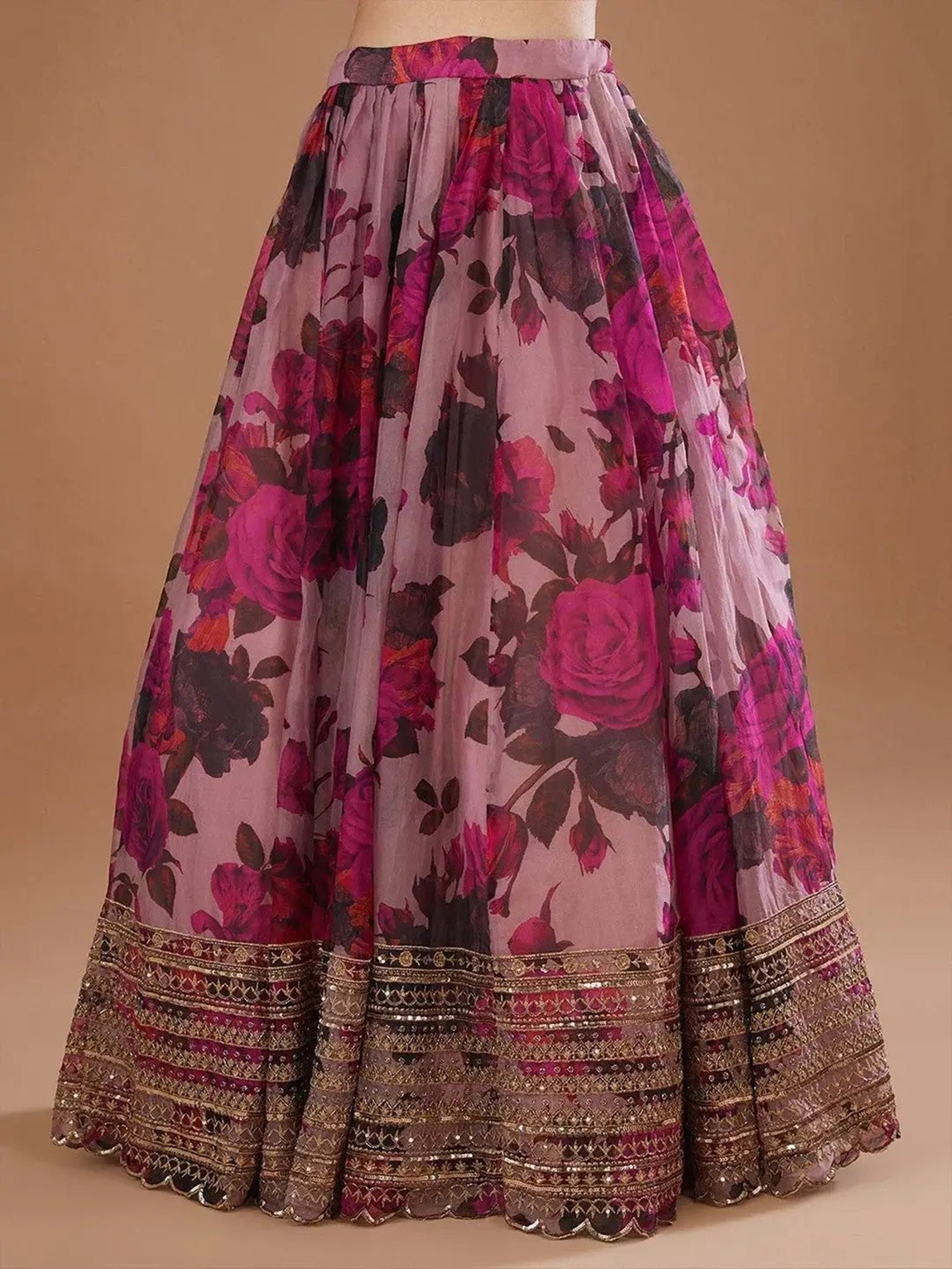 Elevate your ethnic look with this pink organza lehenga featuring sequence work,floral work embroidery work. Designed for festive occasions and celebrations, it offers a graceful flow and timeless appeal.Crafted from lightweight organza fabric with a semi-stitched finish, this lehenga ensures comfort and easy customization. Dry clean recommended.