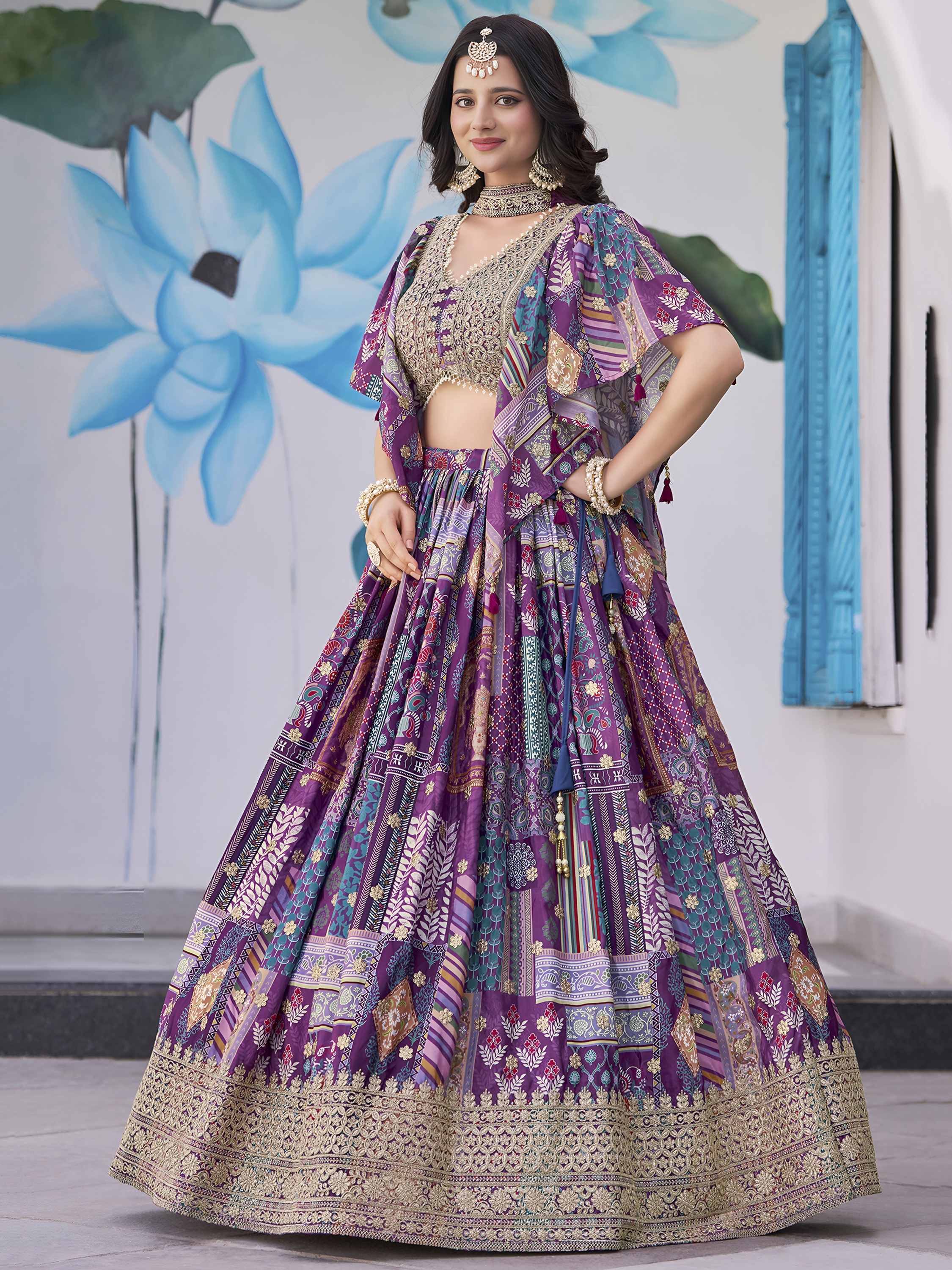 Elevate your ethnic look with this purple chinnon lehenga featuring dori embroidery work. Designed for festive occasions and celebrations, it offers a graceful flow and timeless appeal.Crafted from lightweight chinnon fabric with a semi-stitched finish, this lehenga ensures comfort and easy customization. Dry clean recommended.
