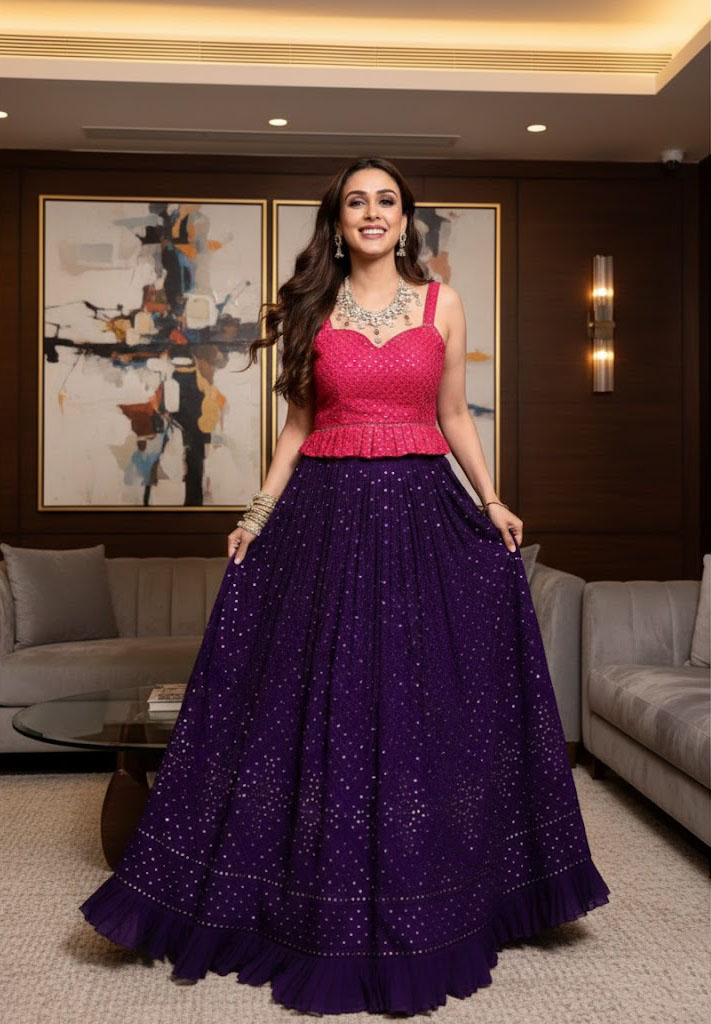 Women's Purple Faux Georgette 3MM Sequins with Thread Embroidered Lehenga Choli with Dupatta