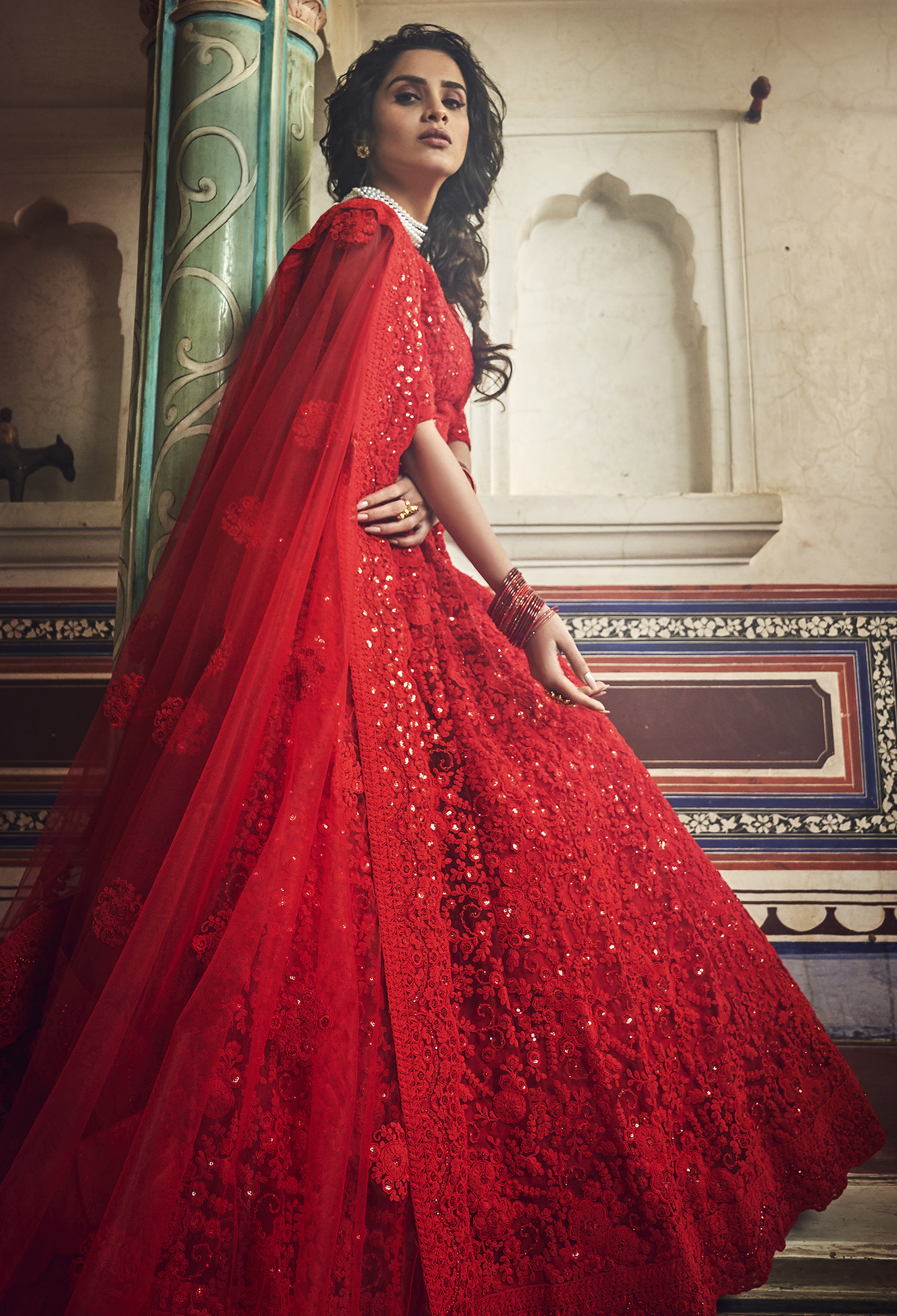 Elevate your ethnic look with this red net lehenga featuring thread embroidery work. Designed for festive occasions and celebrations, it offers a graceful flow and timeless appeal.Crafted from lightweight net fabric with a semi-stitched finish, this lehenga ensures comfort and easy customization. Dry clean recommended.