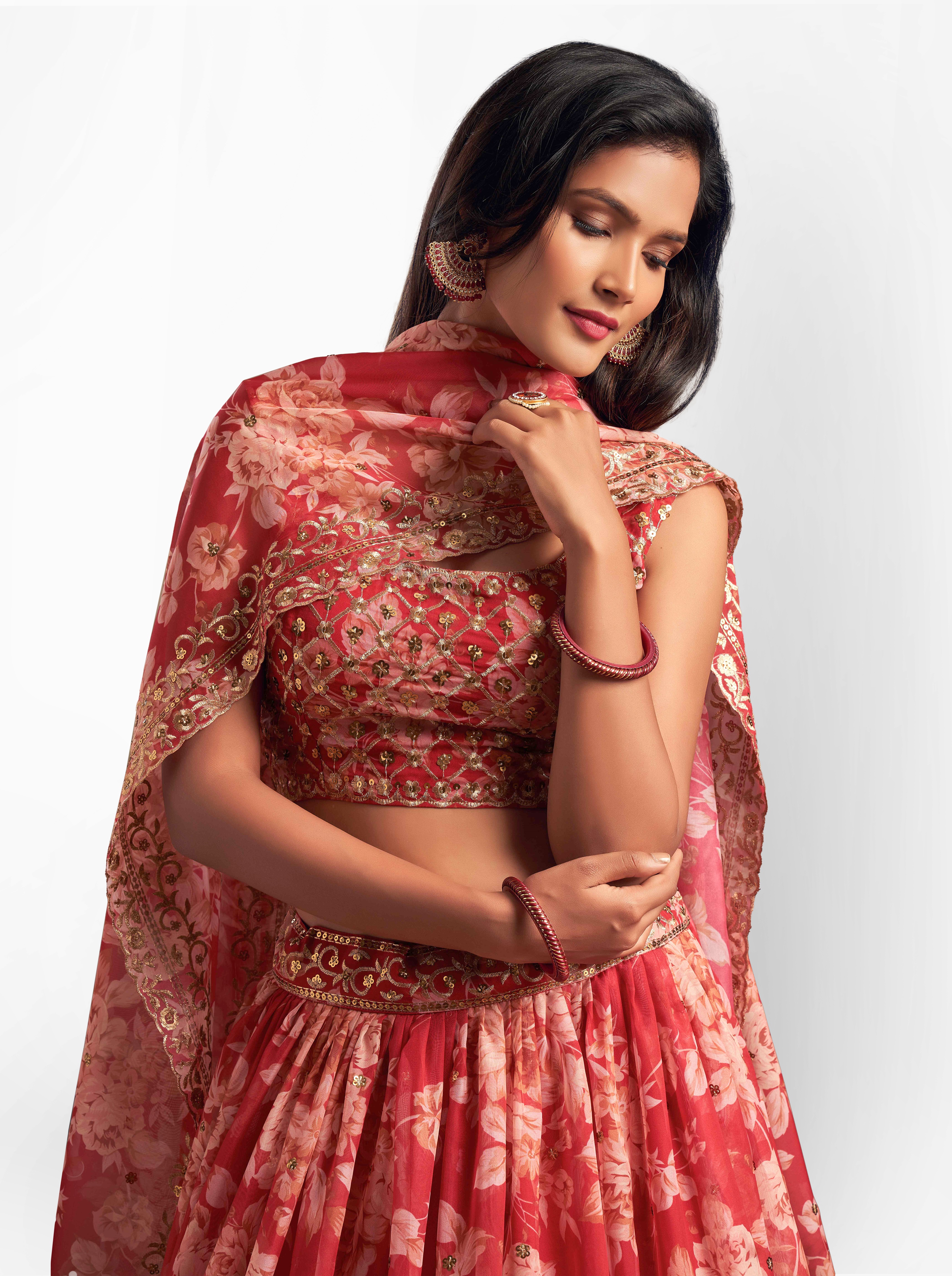 Elevate your ethnic look with this red organza lehenga featuring sequence work,floral work embroidery work. Designed for festive occasions and celebrations, it offers a graceful flow and timeless appeal.Crafted from lightweight organza fabric with a semi-stitched finish, this lehenga ensures comfort and easy customization. Dry clean recommended.