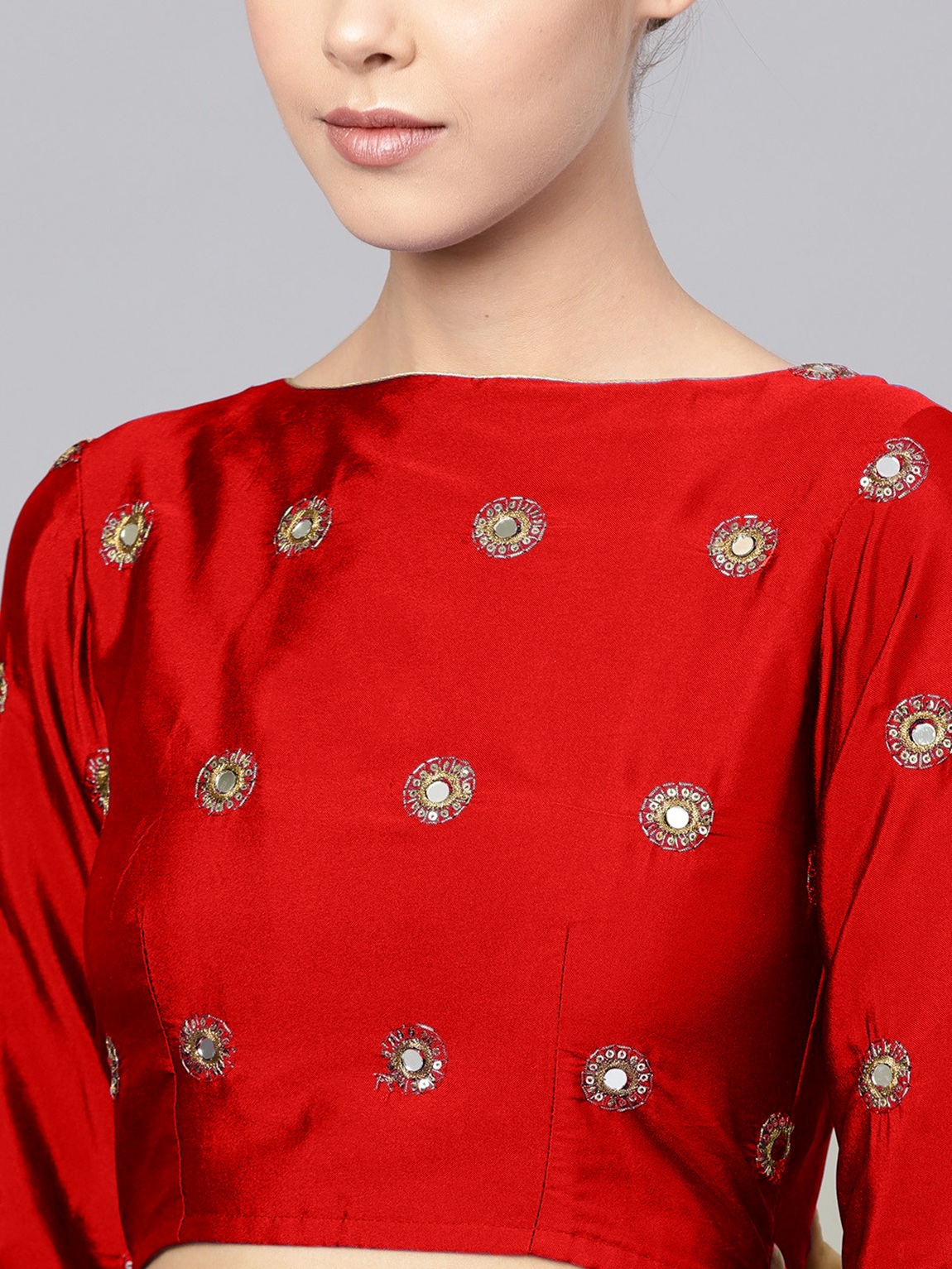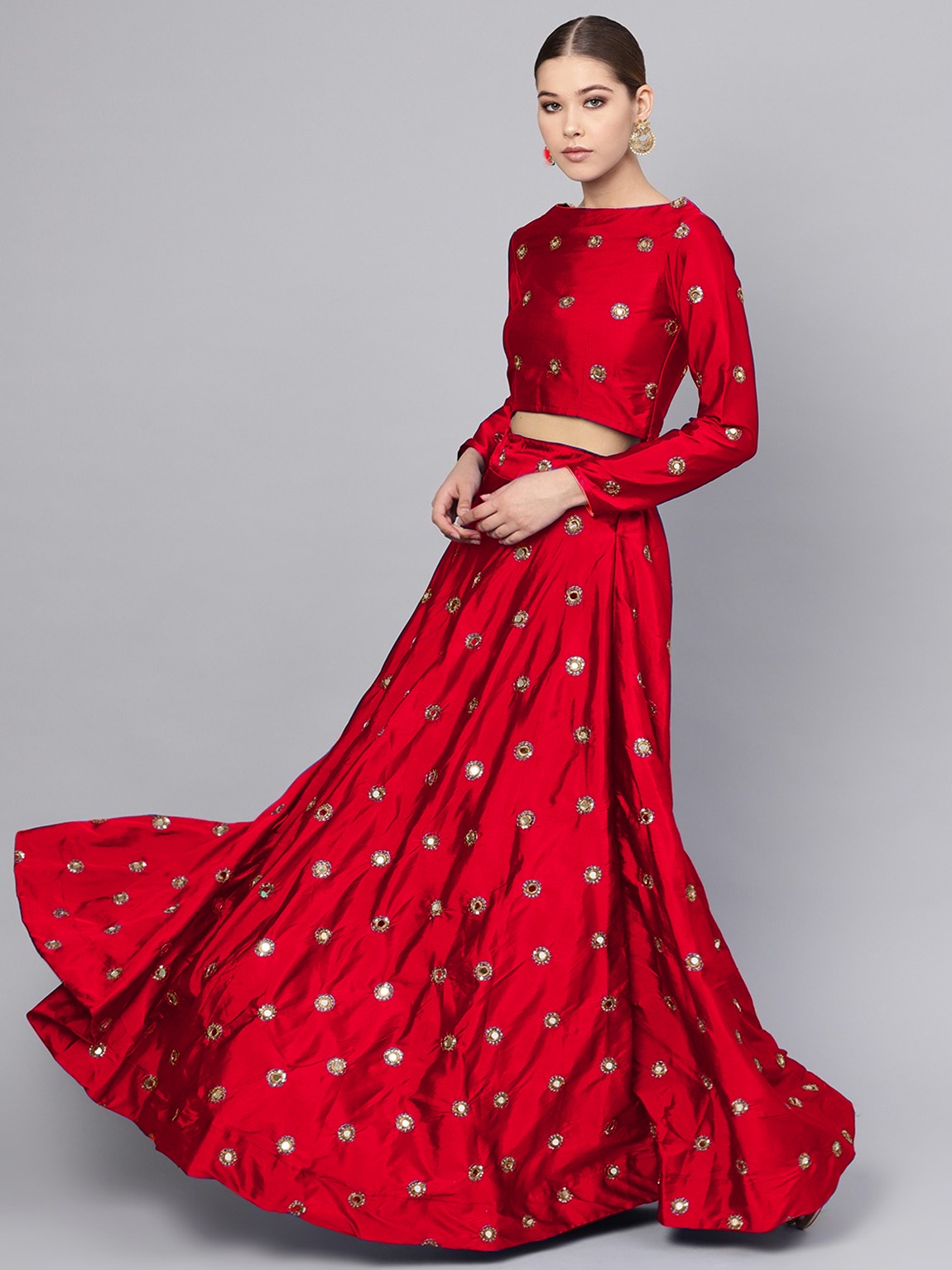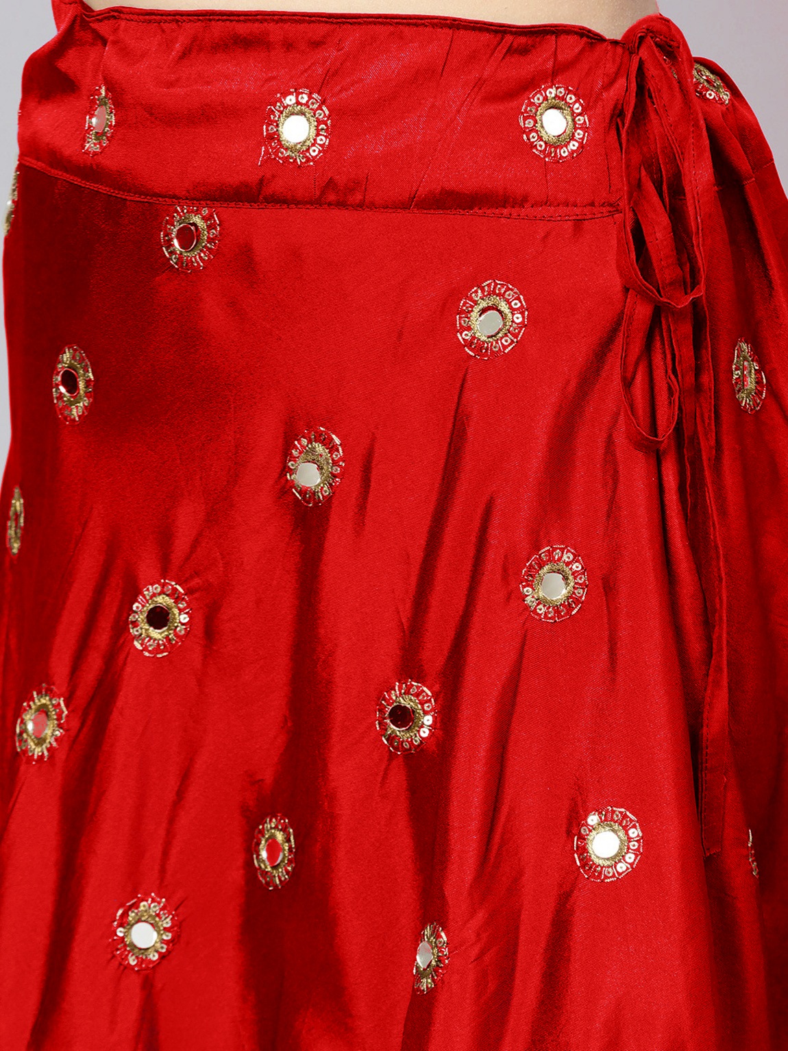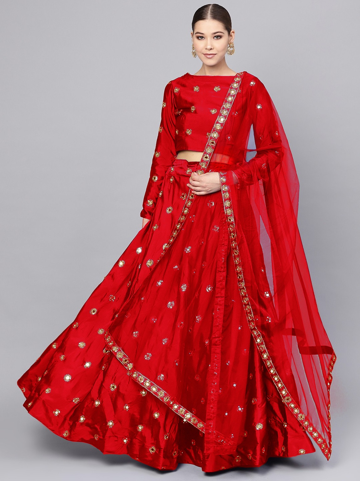 Elevate your ethnic look with this red taffeta lehenga featuring mirror work. Designed for festive occasions and celebrations, it offers a graceful flow and timeless appeal.Crafted from lightweight taffeta fabric with a semi-stitched finish, this lehenga ensures comfort and easy customization. Dry clean recommended.