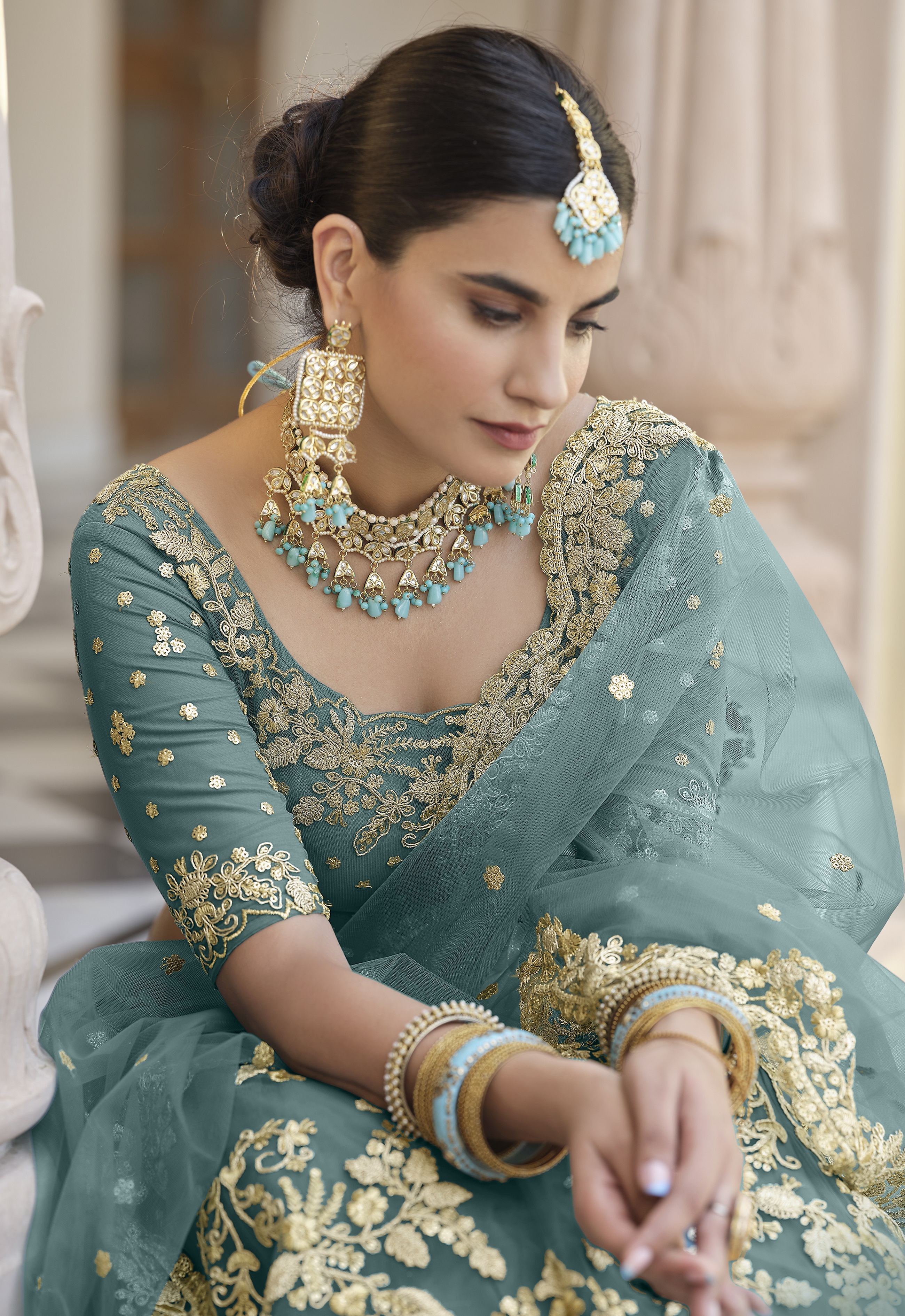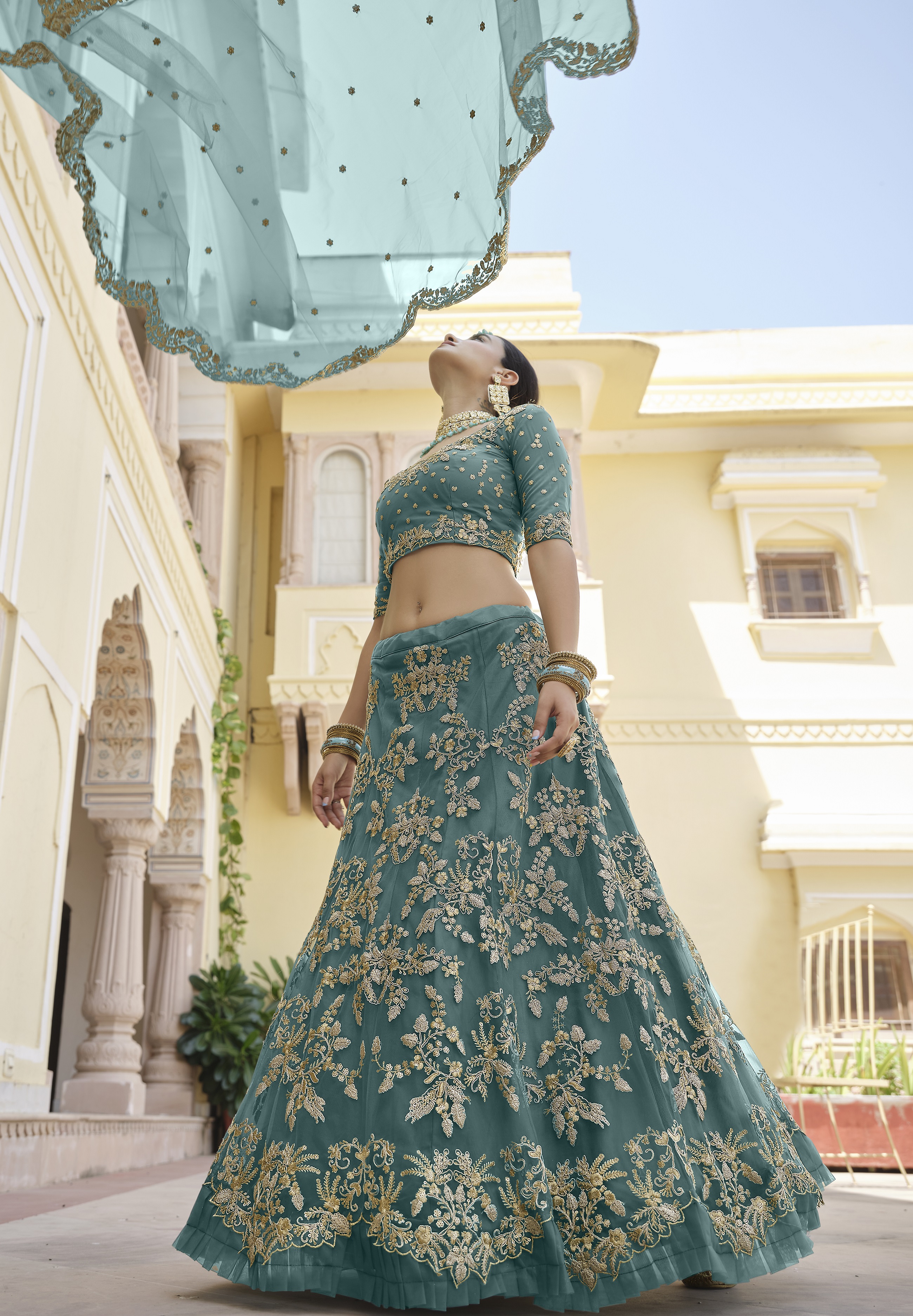 Womens Turquoise Net Zari Work Lehenga Set