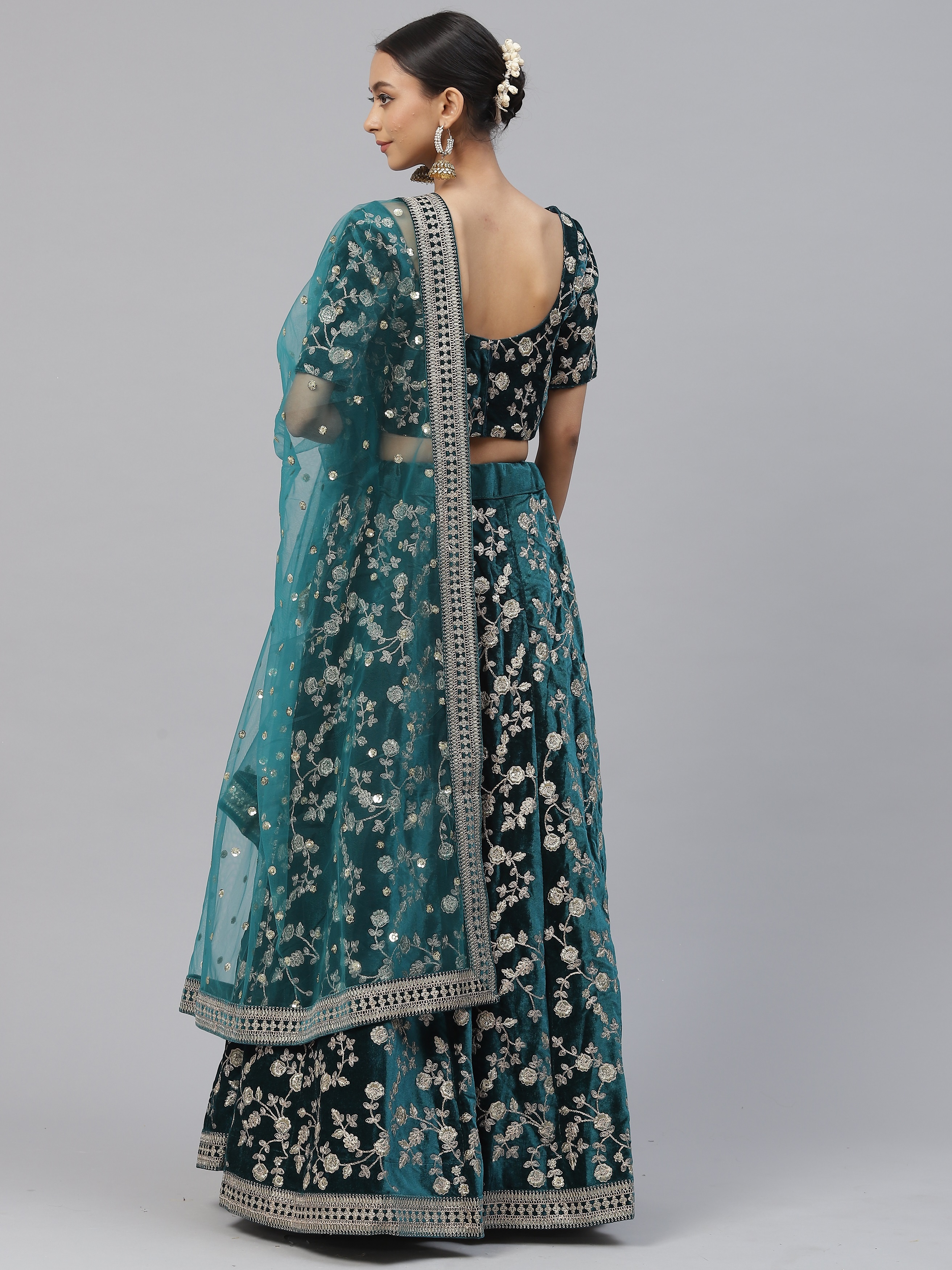 Elevate your ethnic look with this turquoise velvet lehenga featuring dori embroidery work. Designed for festive occasions and celebrations, it offers a graceful flow and timeless appeal.Crafted from lightweight velvet fabric with a semi-stitched finish, this lehenga ensures comfort and easy customization. Dry clean recommended.
