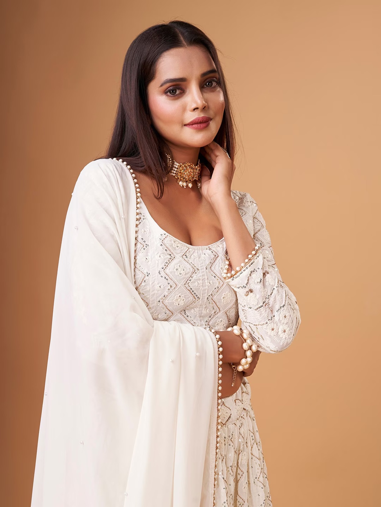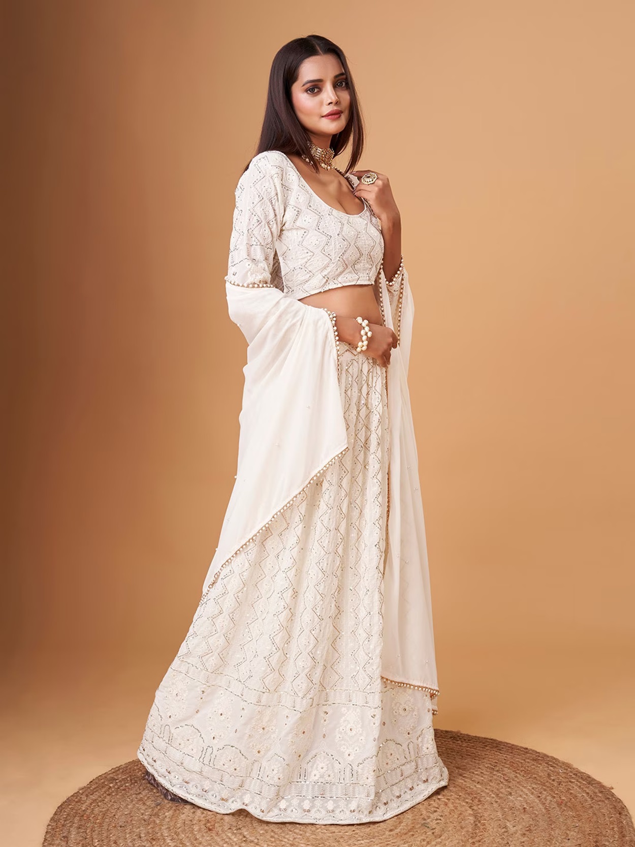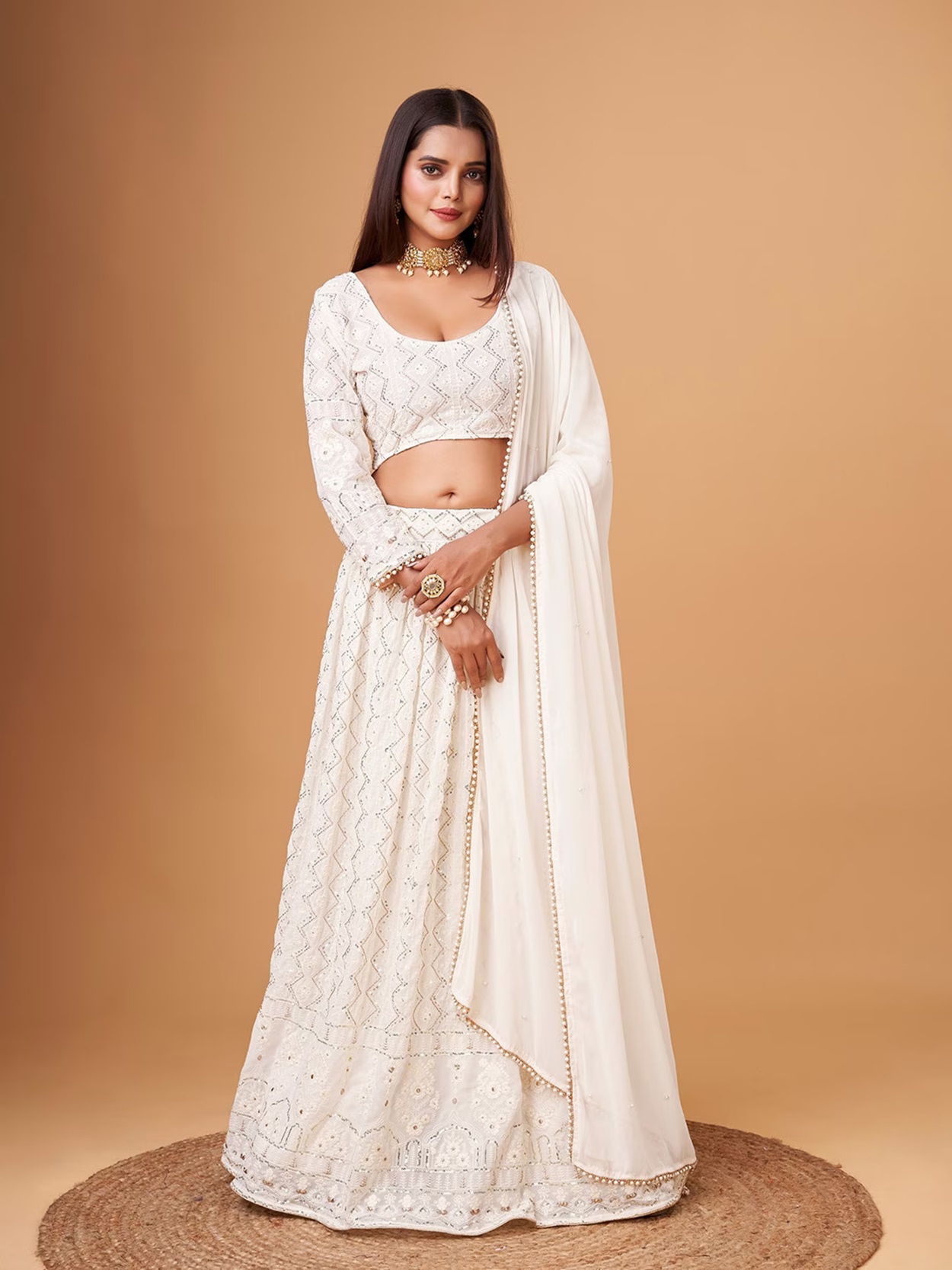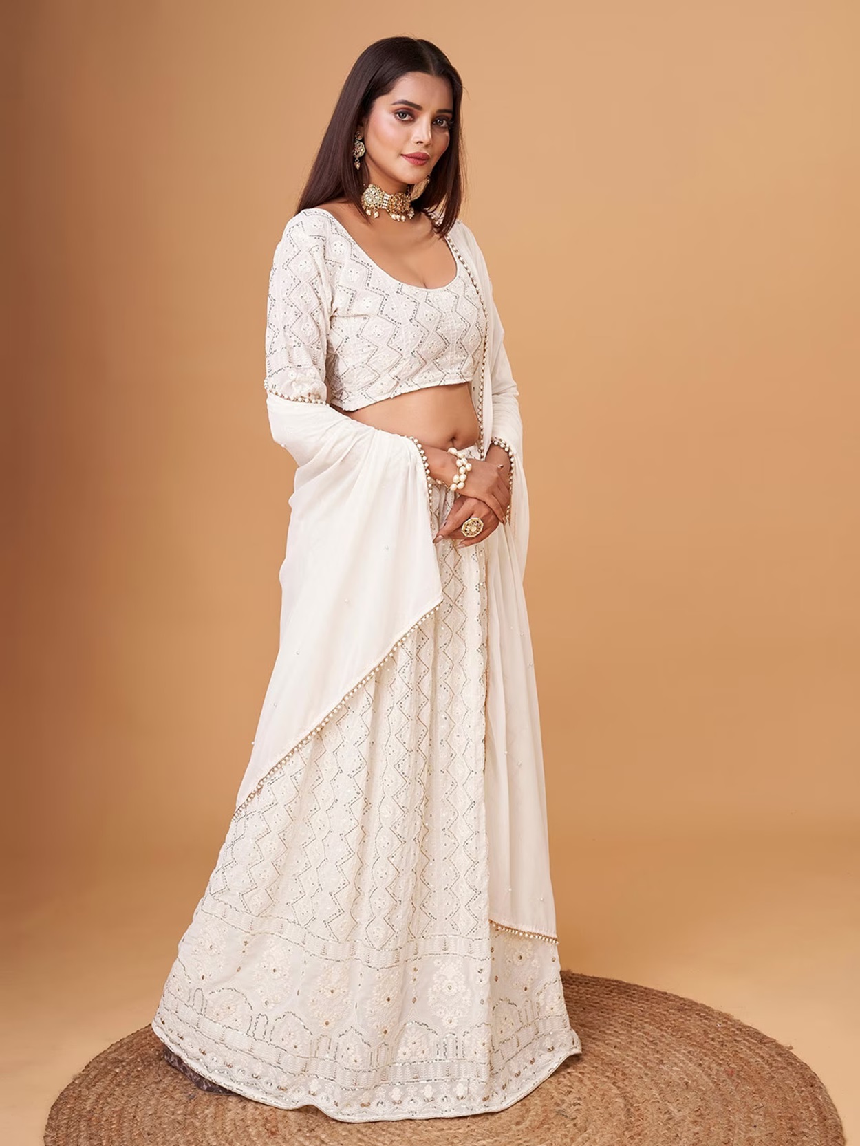 Womens White Faux Georgette Thread Embroidery Lehenga Set