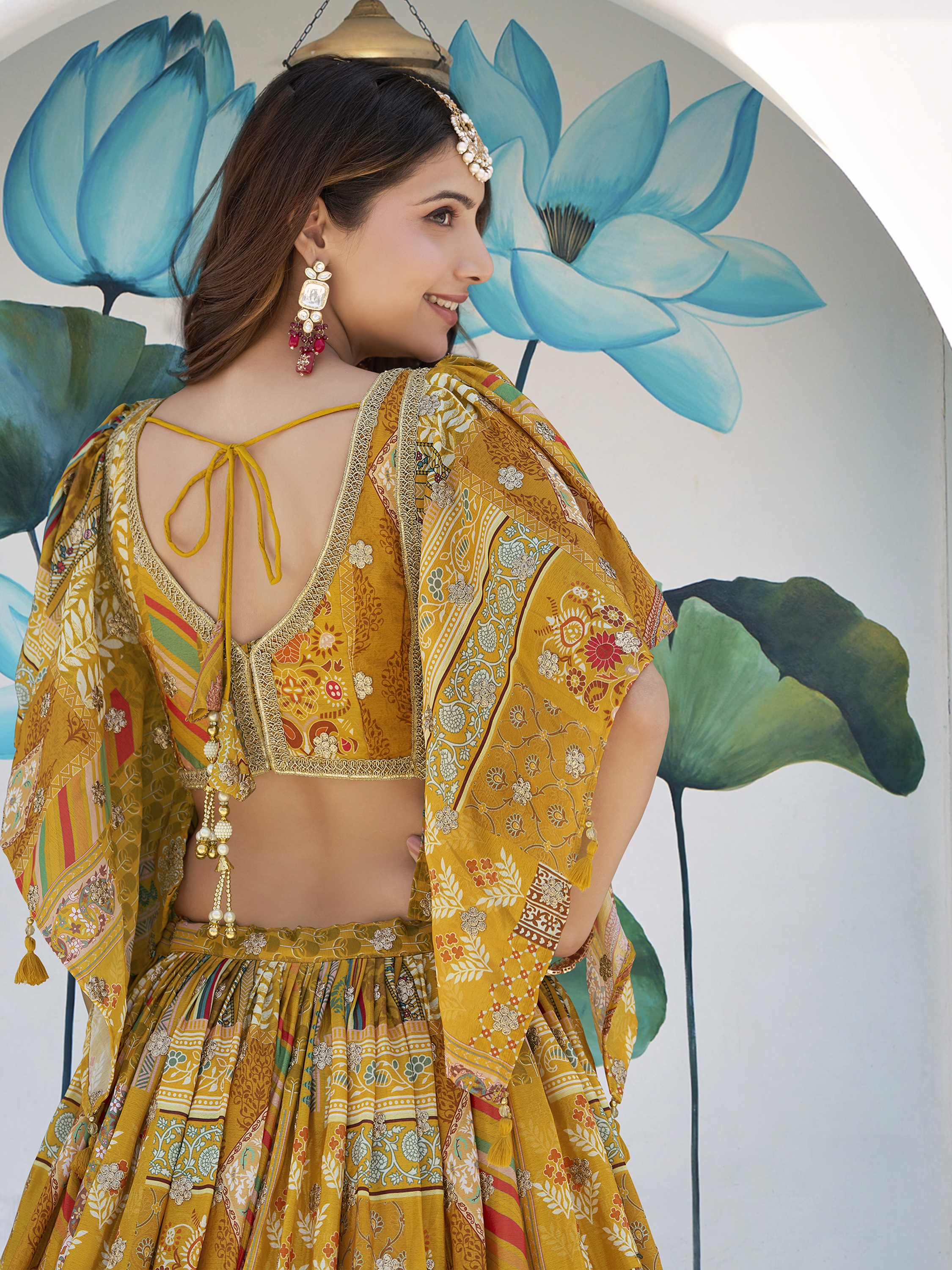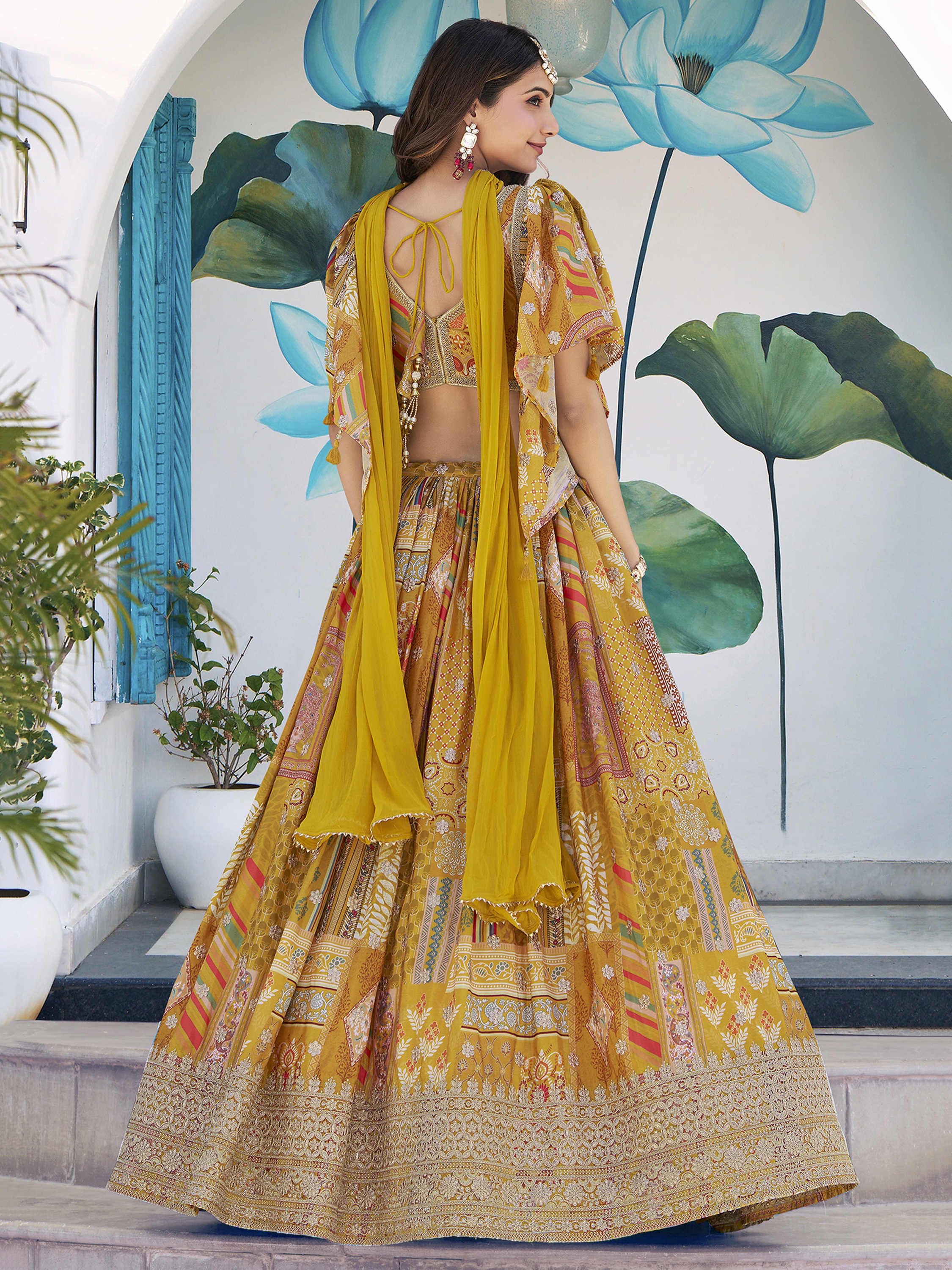 Womens Yellow Chinnon Dori Embroidery Lehenga Set