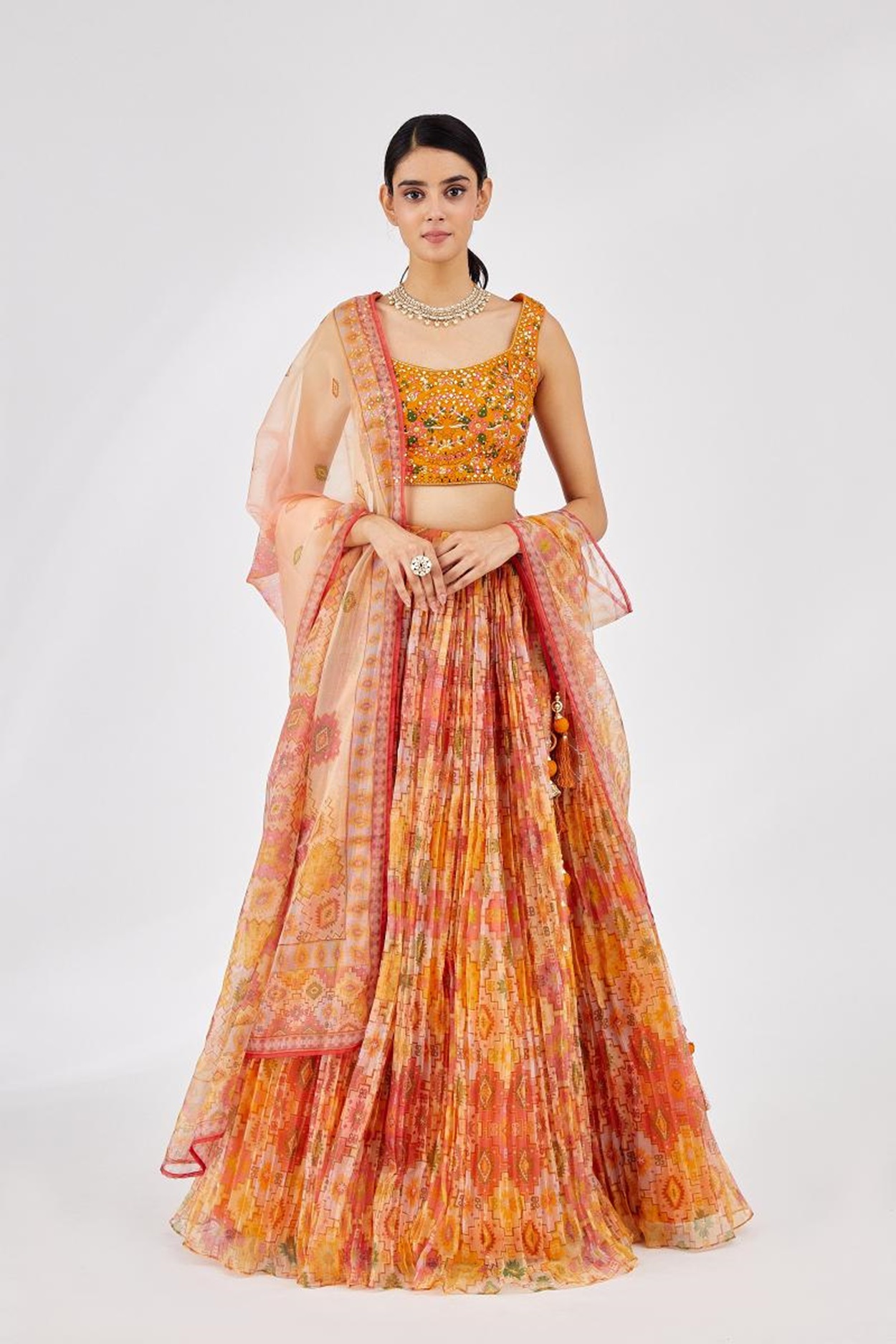 Elevate your ethnic look with this yellow organza lehenga featuring digital print work. Designed for festive occasions and celebrations, it offers a graceful flow and timeless appeal.Crafted from lightweight organza fabric with a semi-stitched finish, this lehenga ensures comfort and easy customization. Dry clean recommended.