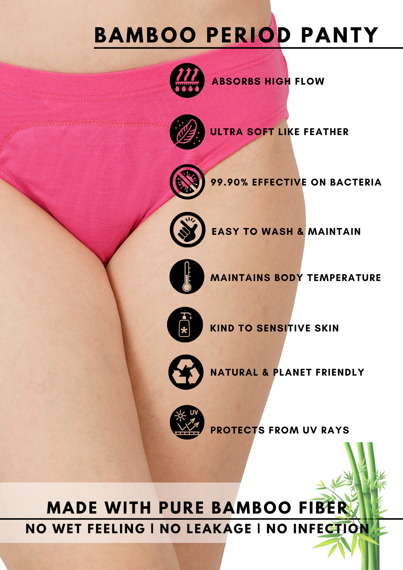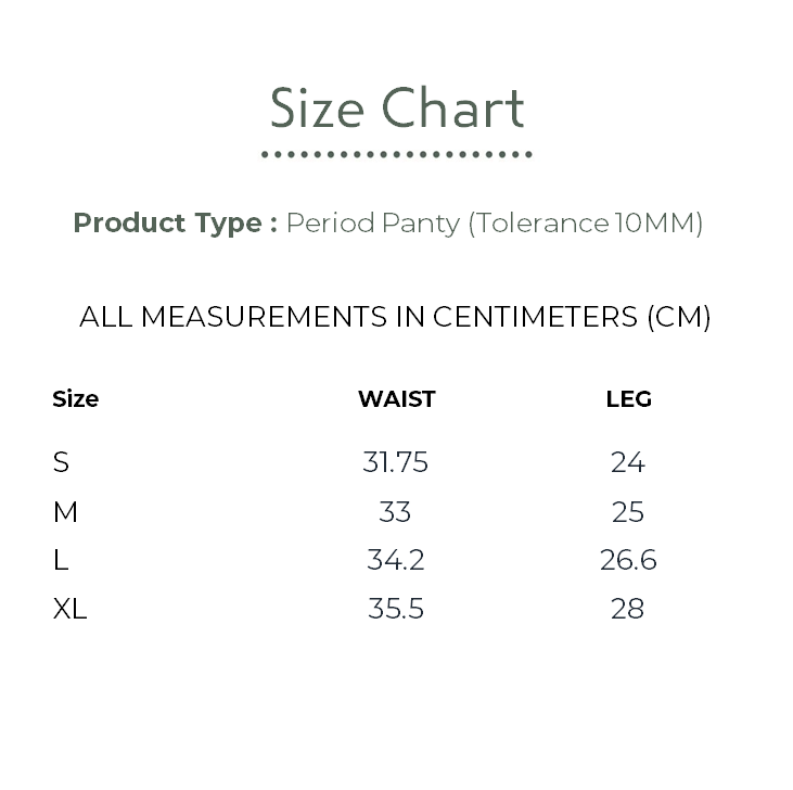 PRODUCT DISCRIPTION : Package contains: 1 Piece Of Super Absorbent Bamboo Panty. No Pads! No Struggle! Pad free, hygienic, planet-friendly women's menstrual panty in Bamboo-Spandex. Ditch unnatural napkins and plastic pads. Adapt naturally Bamboo panties for dry and hygienic menstrual cycles. Absorbs heavy flow till 8-10 hours. Soft, smooth, pad free, absorbing Bamboo menstrual/panty. Bamboo fabric keeps skin dry and infection free. Panty infused with absorbent layers. No need to use napkin/pad. Easy to wash. Use regular detergent and water, make it dry under proper sunlight. Bamboo panty, ultra-soft elastic to provide you genuine coverage & comfort. Soft & stretchable fabric gives you the best fit without any "panty lines". Smooth fabric and flattering fit make you fall in love to wear it all day long. Super breathable bamboo fabric regulates your body temperature properly. Protects you from itching & infections, caused by heavy sweating, or bacterial growth. Bamboo fabric is naturally anti-odor which makes it a great choice for sensitive skin type. COMPOSITION- Bamboo- Spandex.