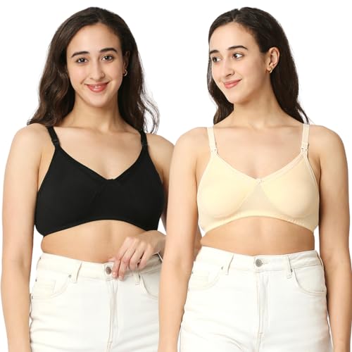 Mee Mee Women's 4 Ways Lycra Maternity Bra | Adjustable Straps, Non-Padded, Non-Wired Nursing Bra | Full Cup Feeding Bra | Post Pregnancy Easy to Breastfeed | Skin and Black, Pack of 2