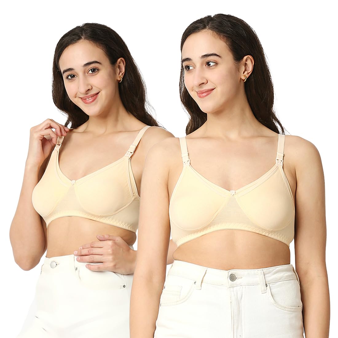 A feeding bra also known as a nursing bra is specially designed to provide comfort support and convenience for breastfeeding mothers. Unlike regular bras it features easy-access panels or cups that can be unclipped or pulled down to allow for quick and discreet breastfeeding or pumping. These bras are essential for new mothers as they make the process of breastfeeding smoother and more comfortable both at home and on the go. Made of 100% cotton with extra-soft elastic for ease of wear Front clasp with drop clip to breastfeed quickly. Non-wired for utmost comfort Equipped with thicker straps broader sides and a deeper center front for complete support Non-wired for utmost comfort Ergonomically designed fabric to aid in breastfeeding. Machine washable. Available in ALL sizes - 34 36 38 130 and cup sizes - B C D and neutral colors to suit your preferences.