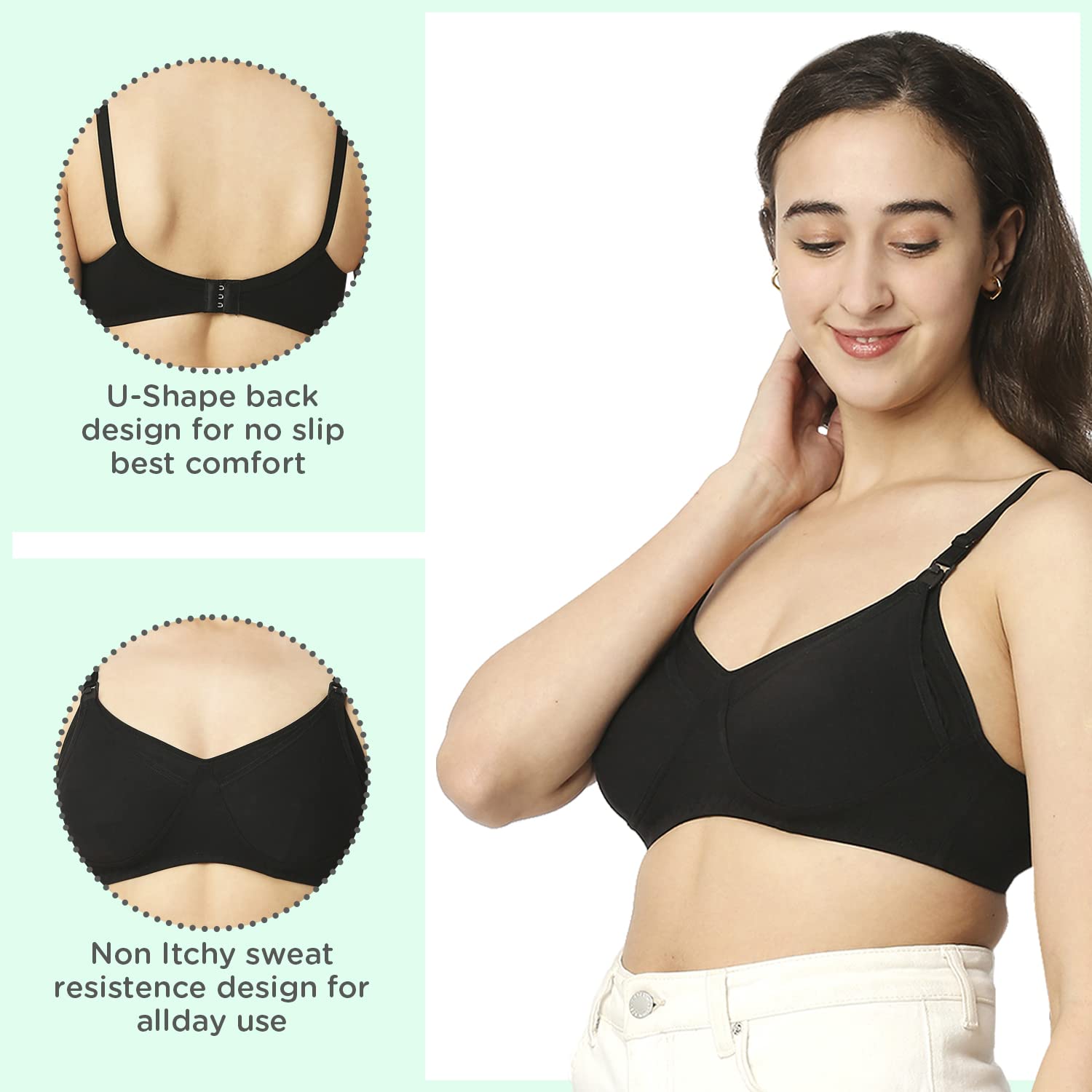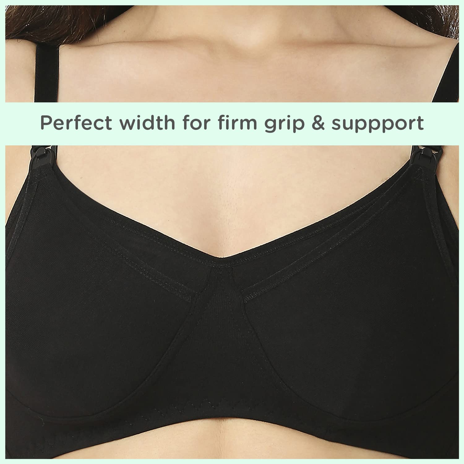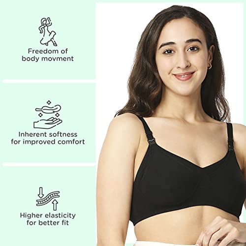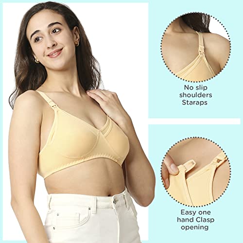 Made of 100% cotton with extra-soft elastic for ease of wear Front clasp with drop clip to breastfeed quickly. Non-wired for utmost comfort Equipped with thicker straps broader sides and a deeper center front for complete support Non-wired for utmost comfort Ergonomically designed fabric to aid in breastfeeding. Machine washable. Double layer fabric in the cups protects and provides care for milk ducts mammary glands & areola region. Inner seams keep breasts firm & help maintain shape. Available in ALL sizes - 34 36 38 40 and cup sizes - B C D and neutral colours to suit your preferences