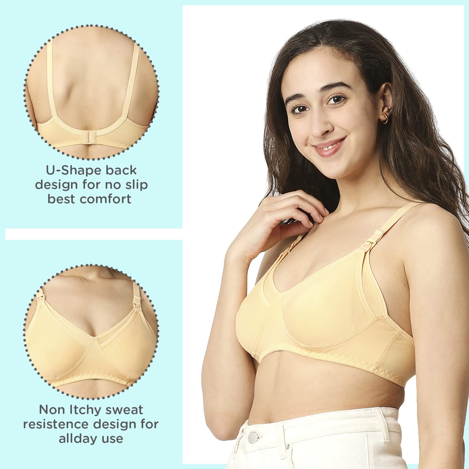 Made of 100% cotton with extra-soft elastic for ease of wear Front clasp with drop clip to breastfeed quickly. Non-wired for utmost comfort Equipped with thicker straps broader sides and a deeper center front for complete support Non-wired for utmost comfort Ergonomically designed fabric to aid in breastfeeding. Machine washable. Double layer fabric in the cups protects and provides care for milk ducts mammary glands & areola region. Inner seams keep breasts firm & help maintain shape. Available in ALL sizes - 34 36 38 40 and cup sizes - B C D and neutral colours to suit your preferences
