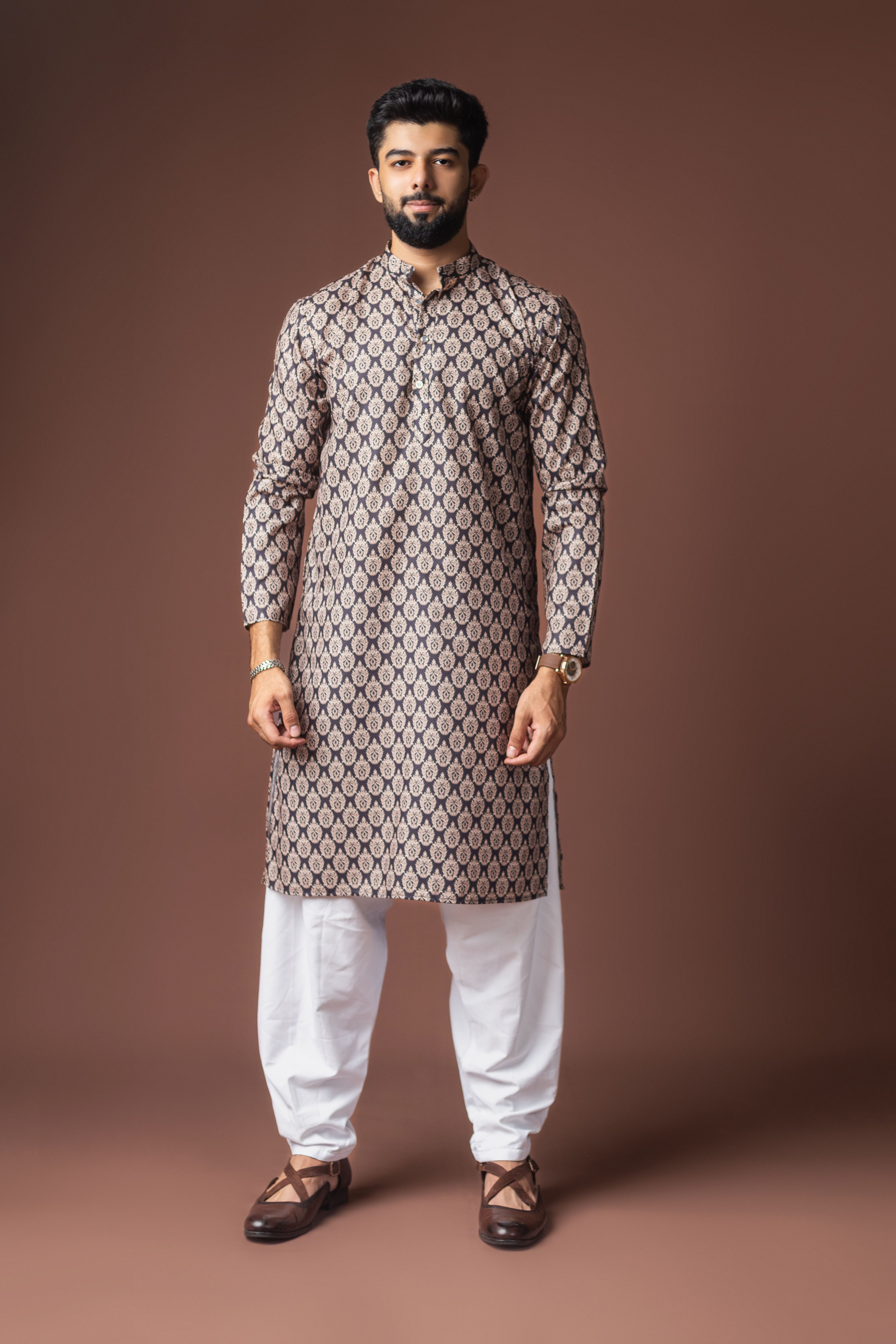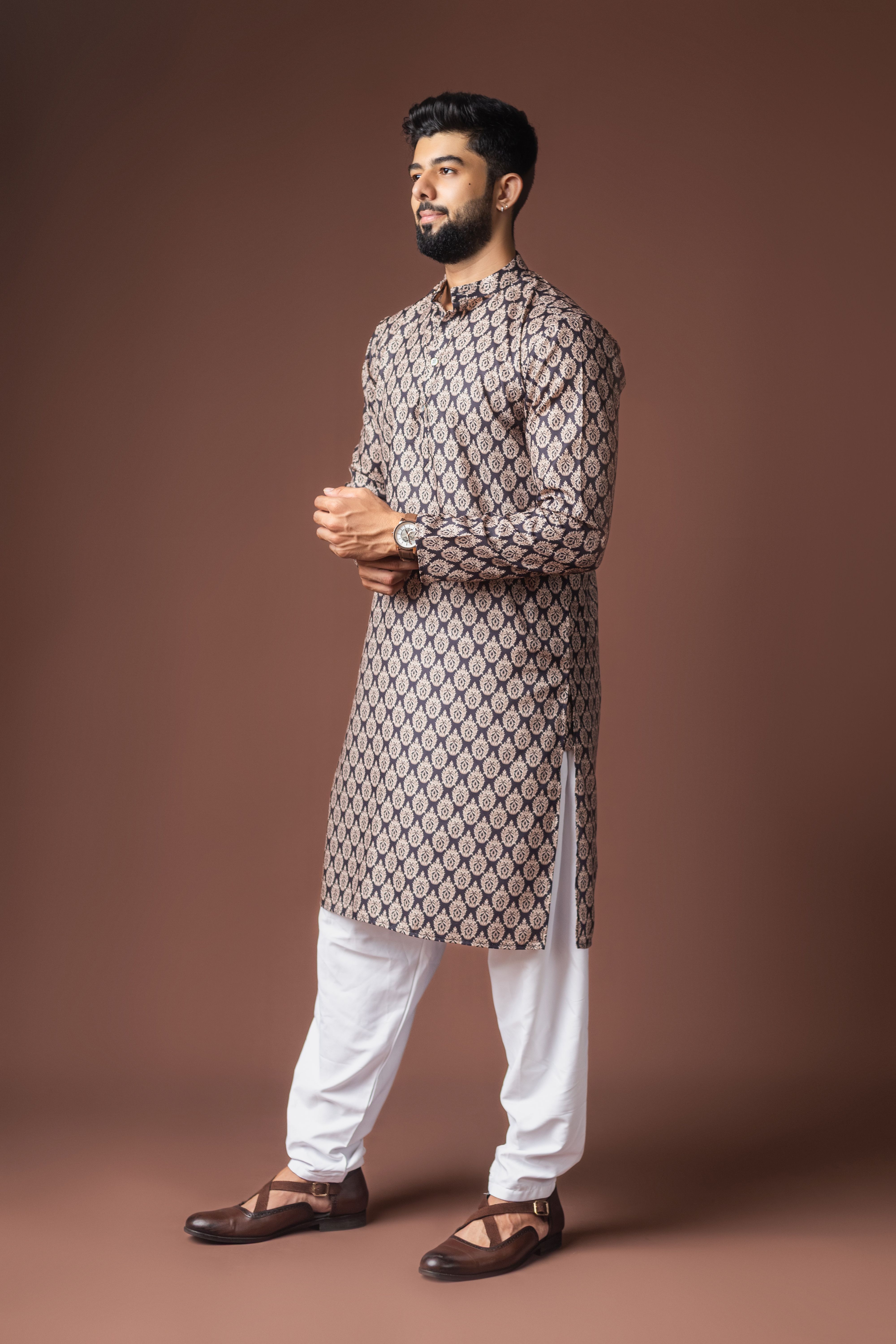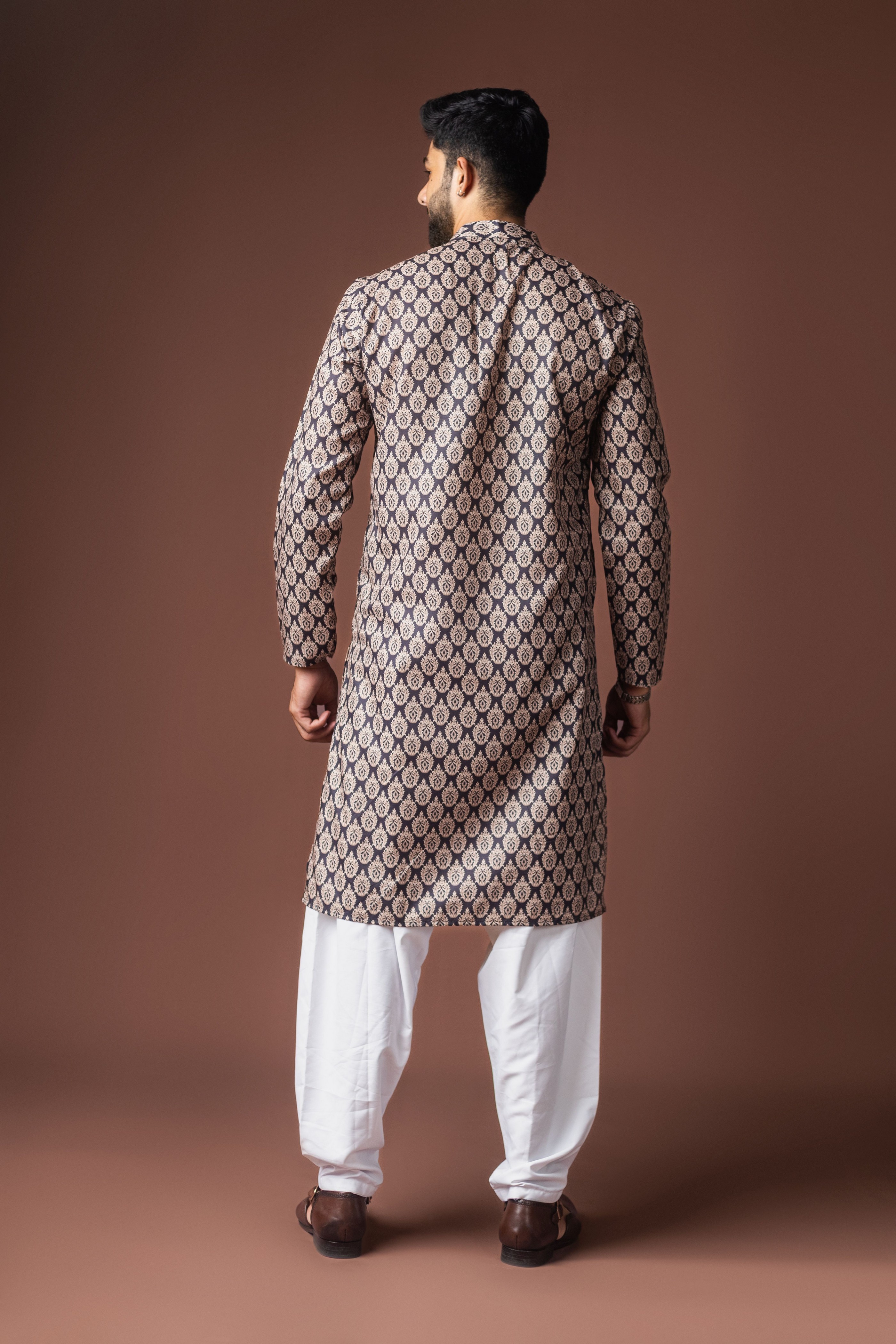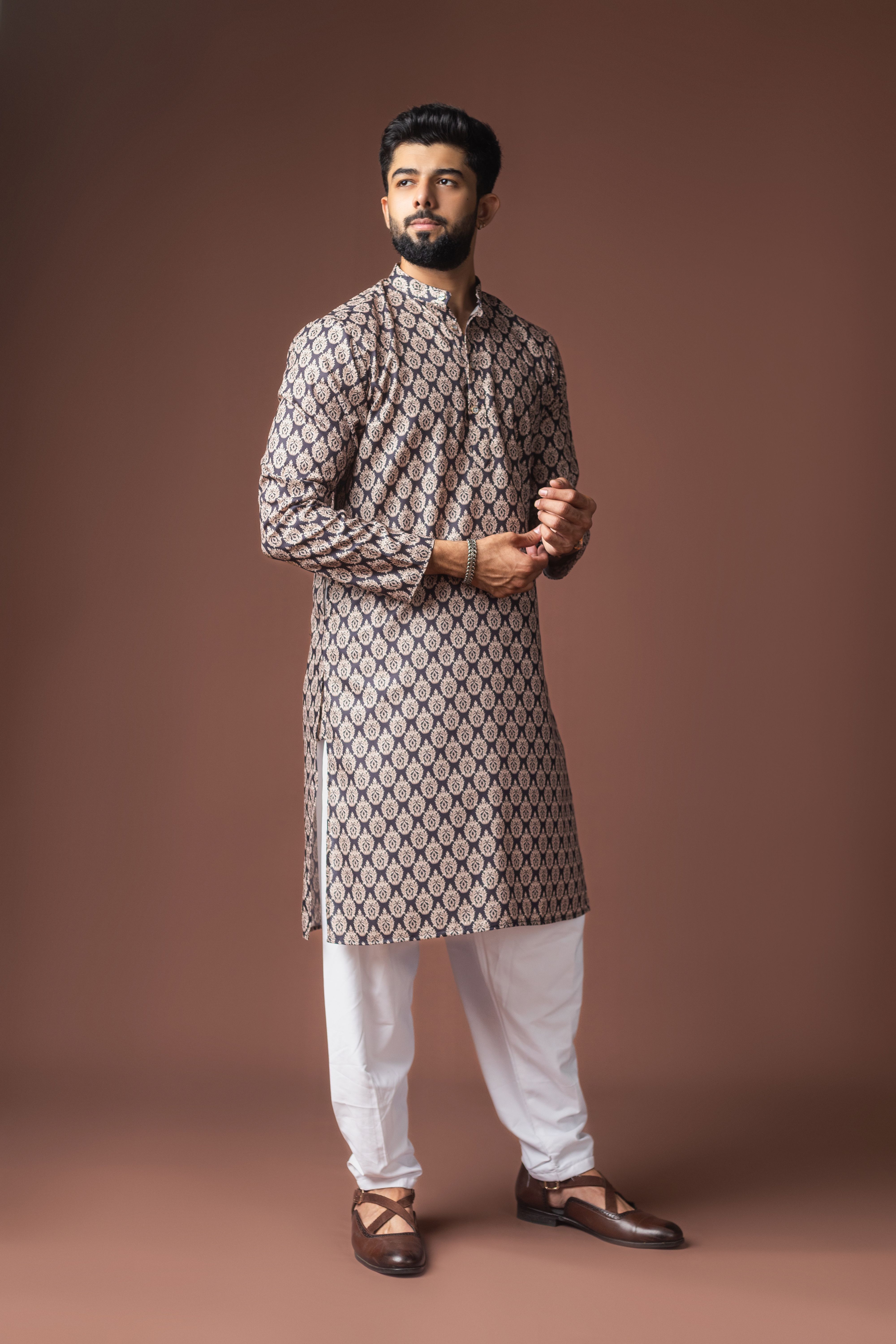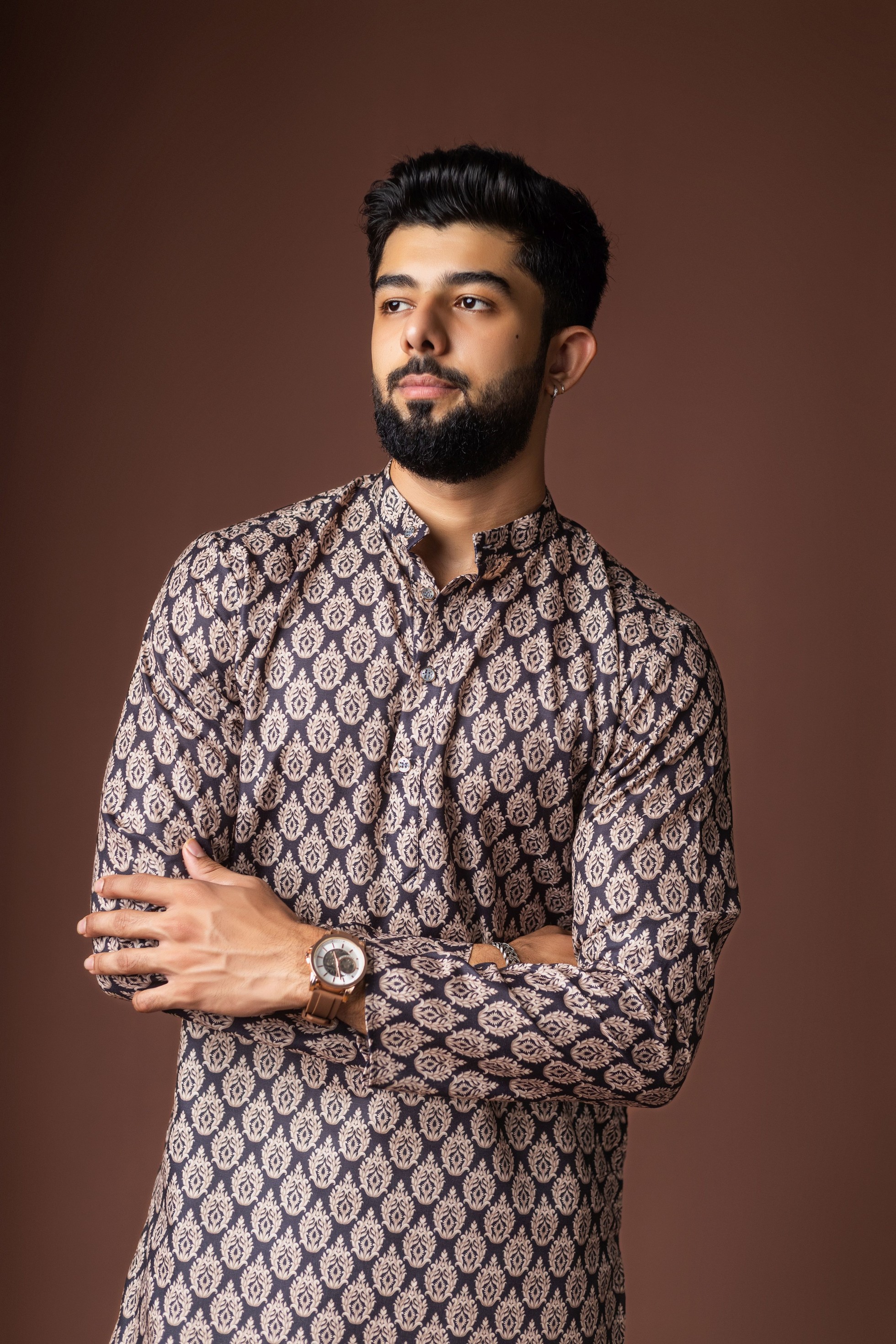 Black Color Blended Linen Designer Printed Stylish Kurta Payjama For Mens'