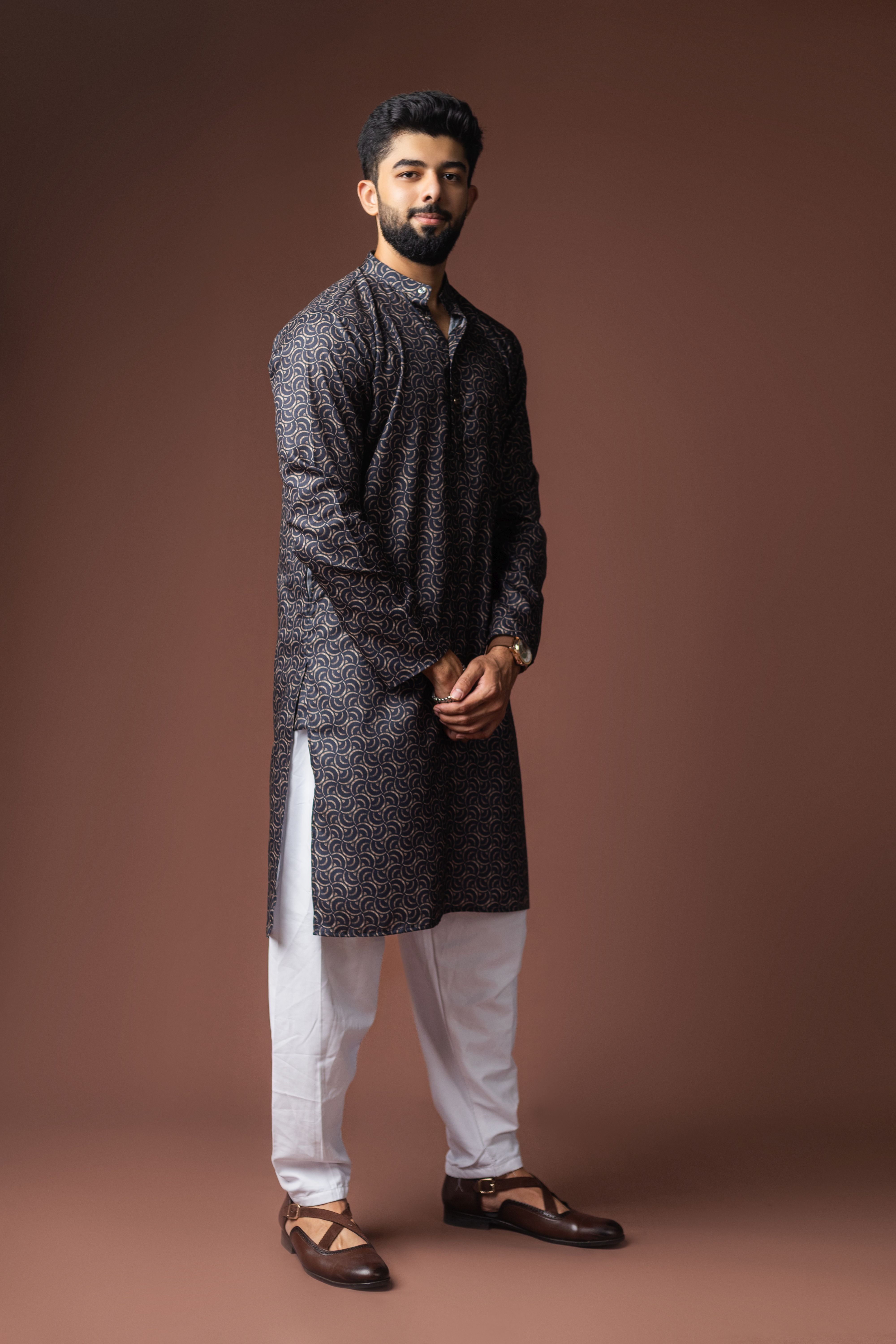 Black Color Blended Linen Fabric Designer Printed Festive Wear Men's Kurta Payjama