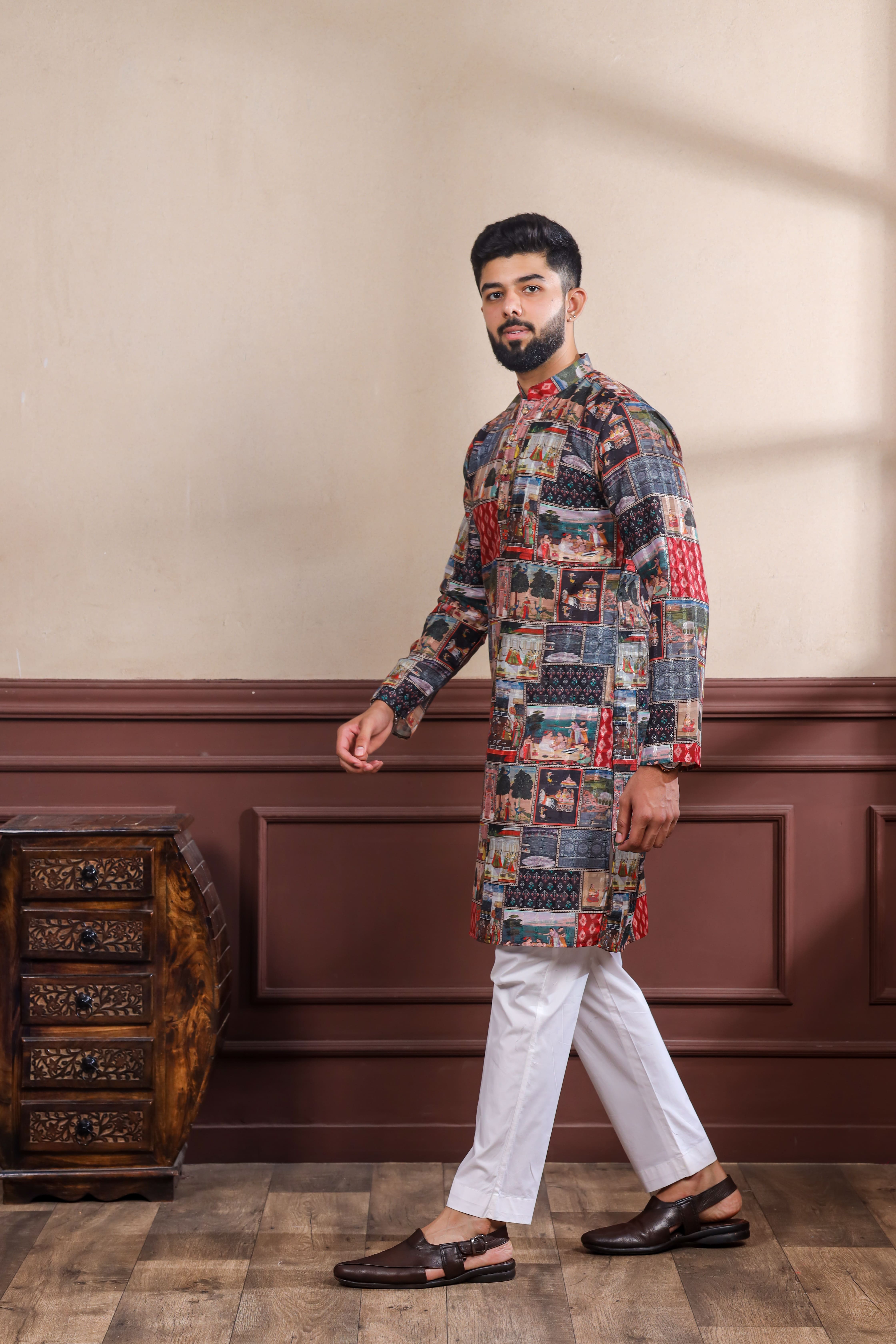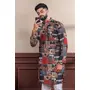 Black Color Ethnic Woven Patta With Digital Printed Ceremonial Kurta Payjama For Men's