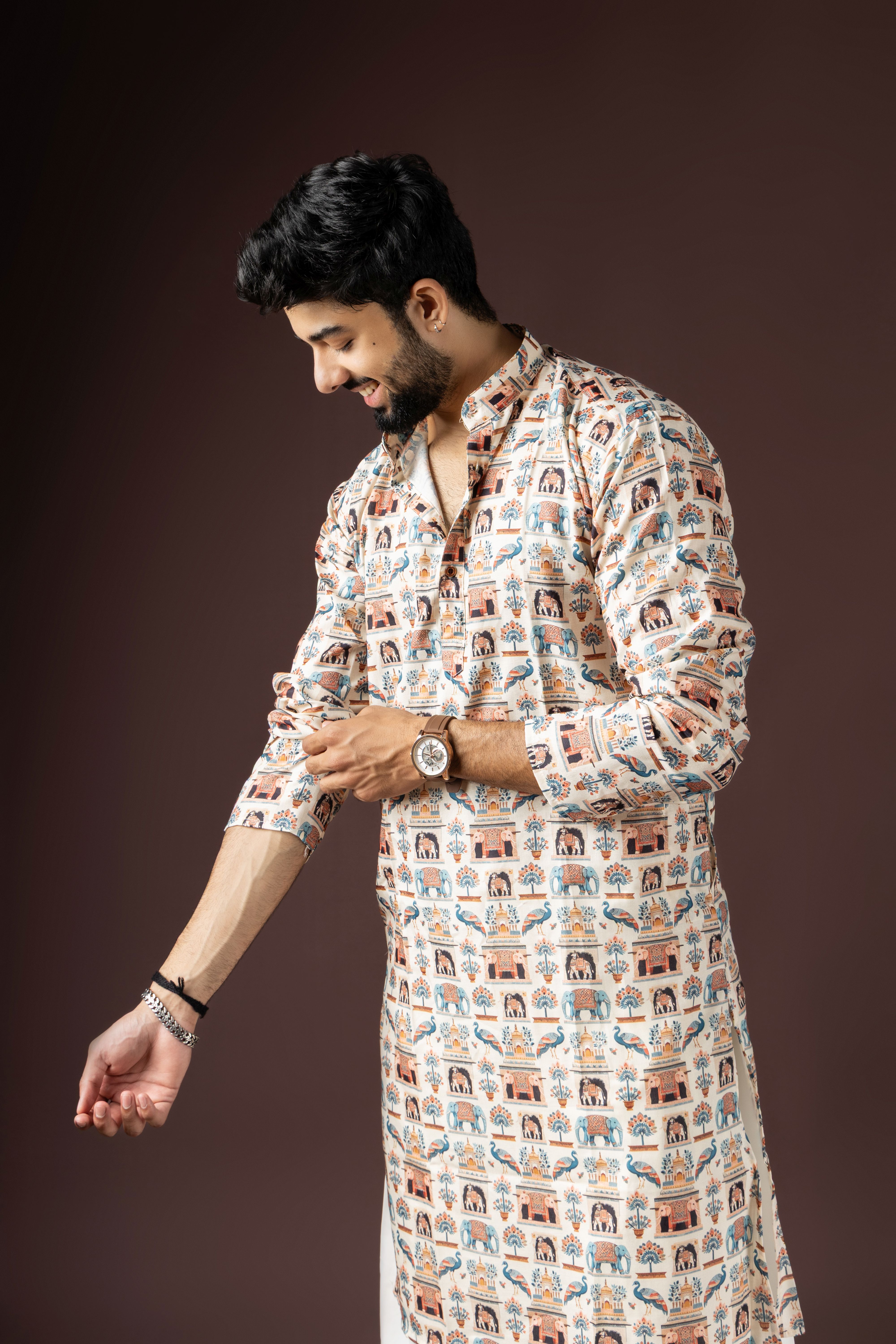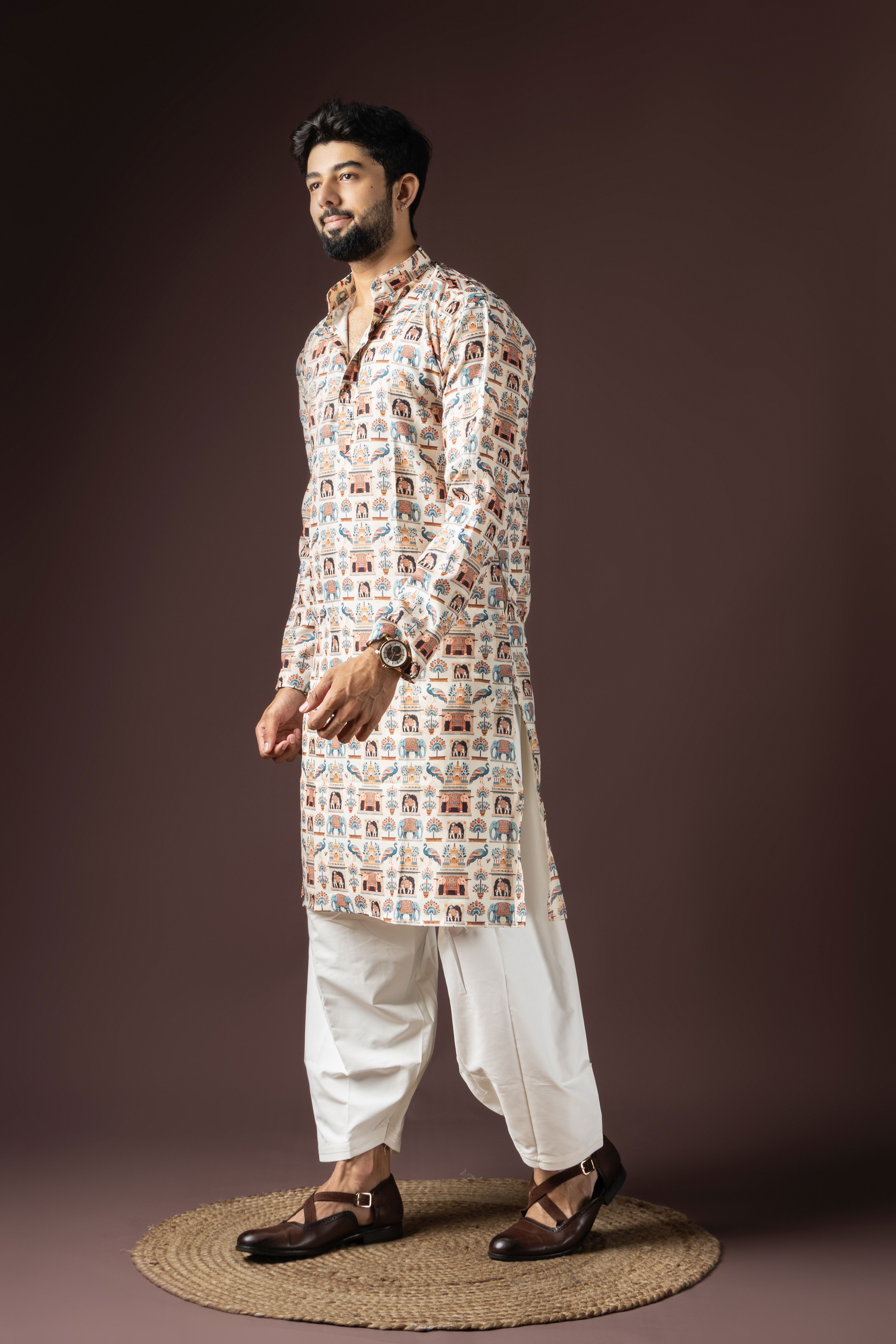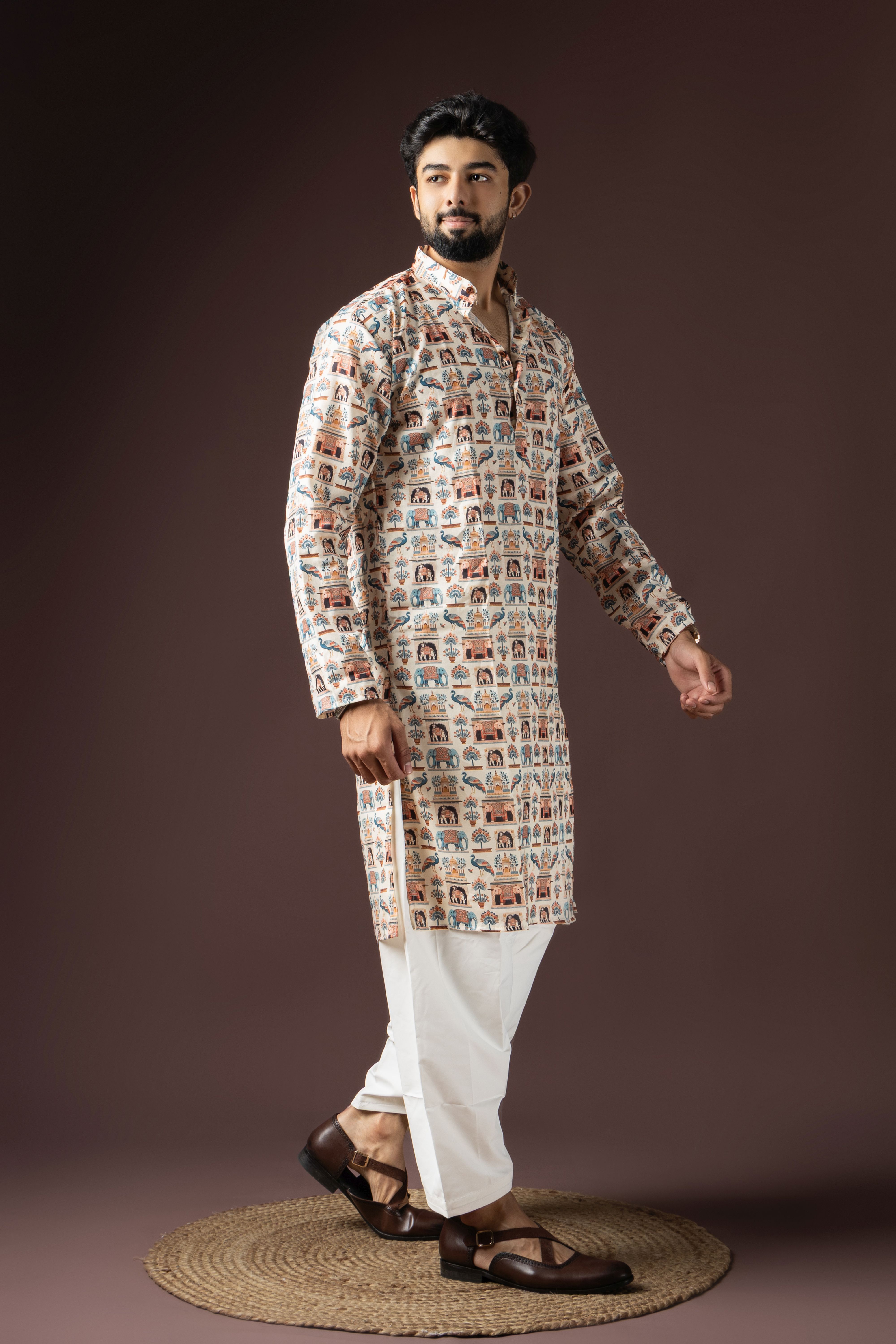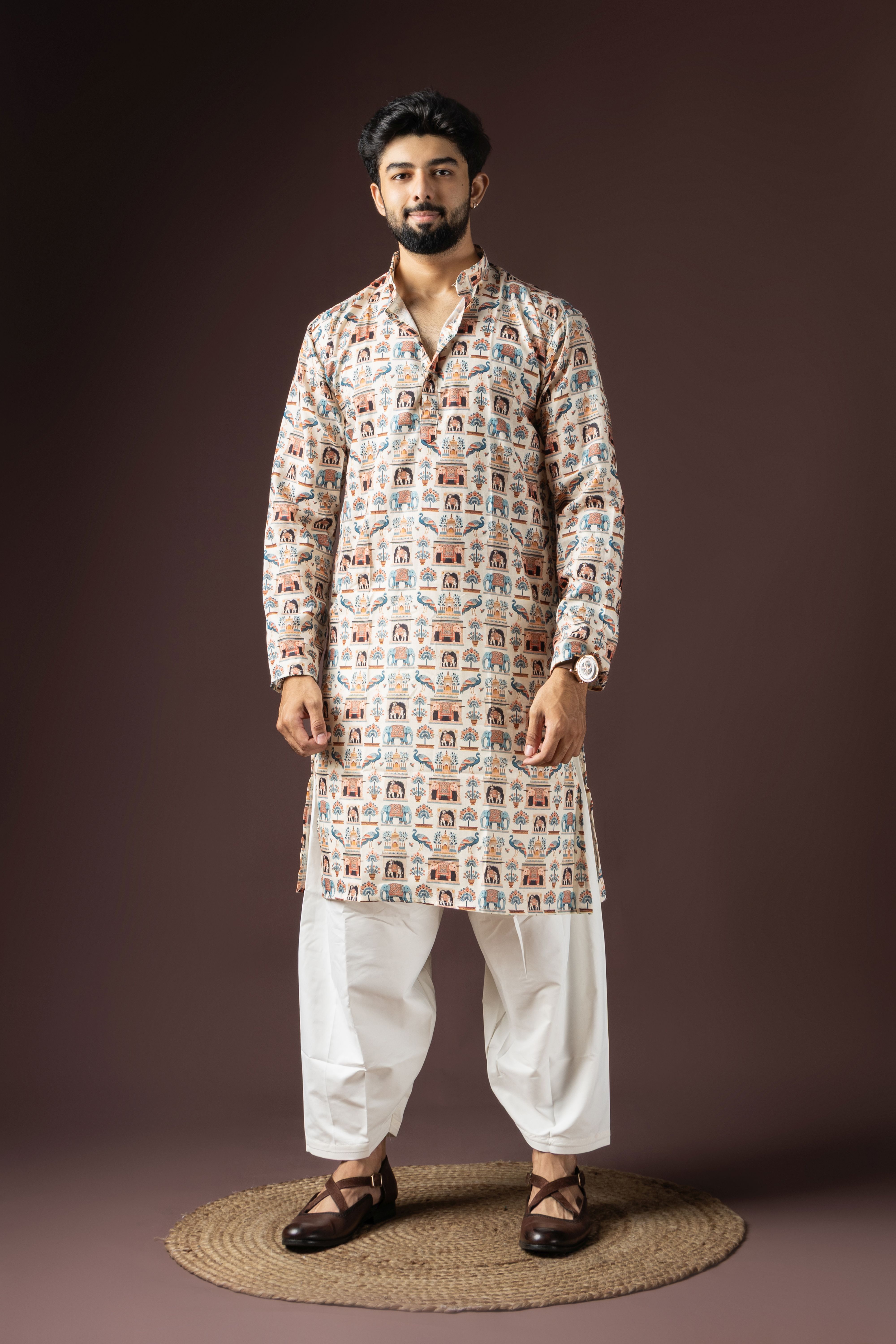 Cream Color Beautiful Printed Blended Cotton Fabric Ceremonial Men's Kurta Payjama