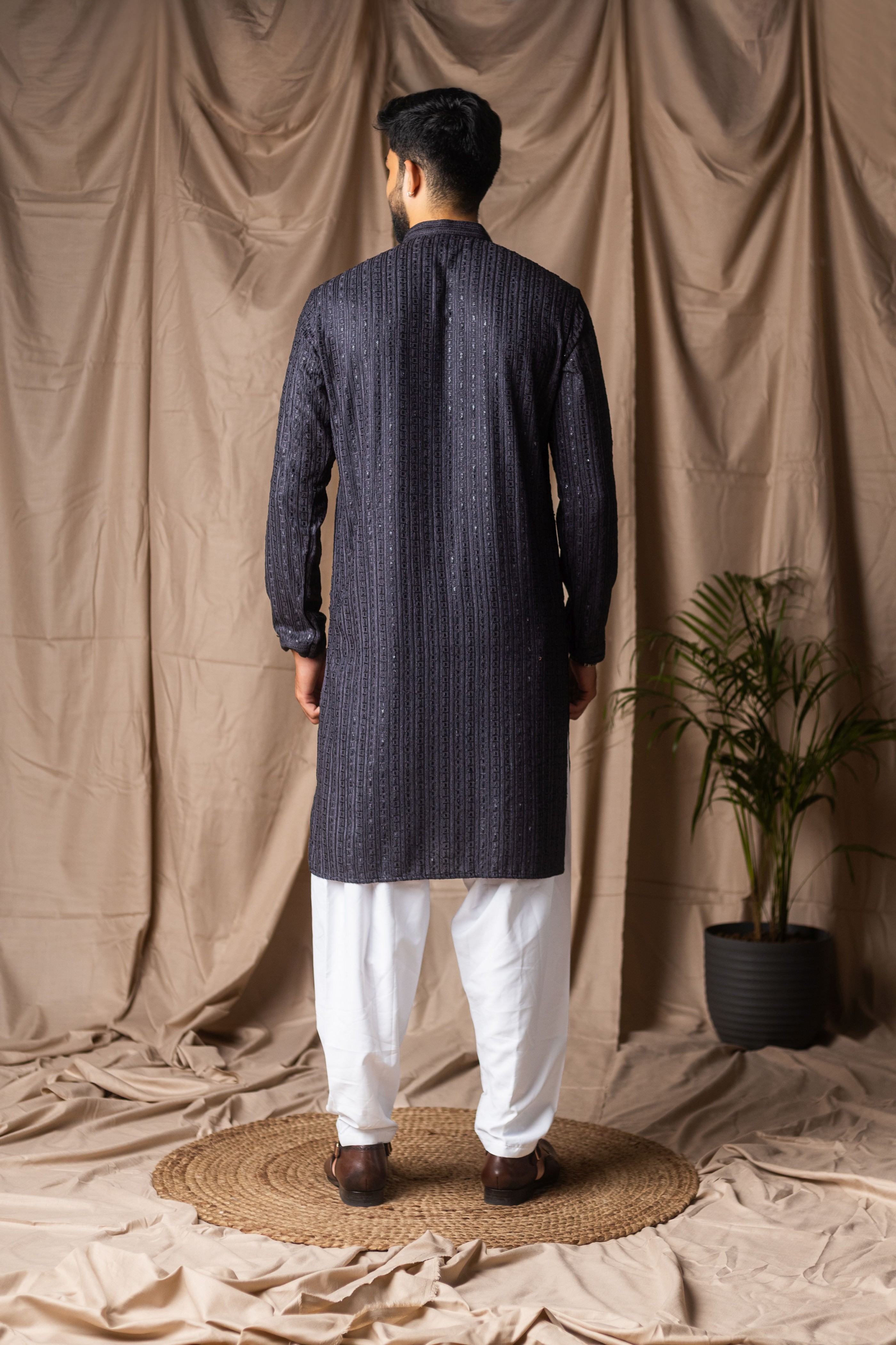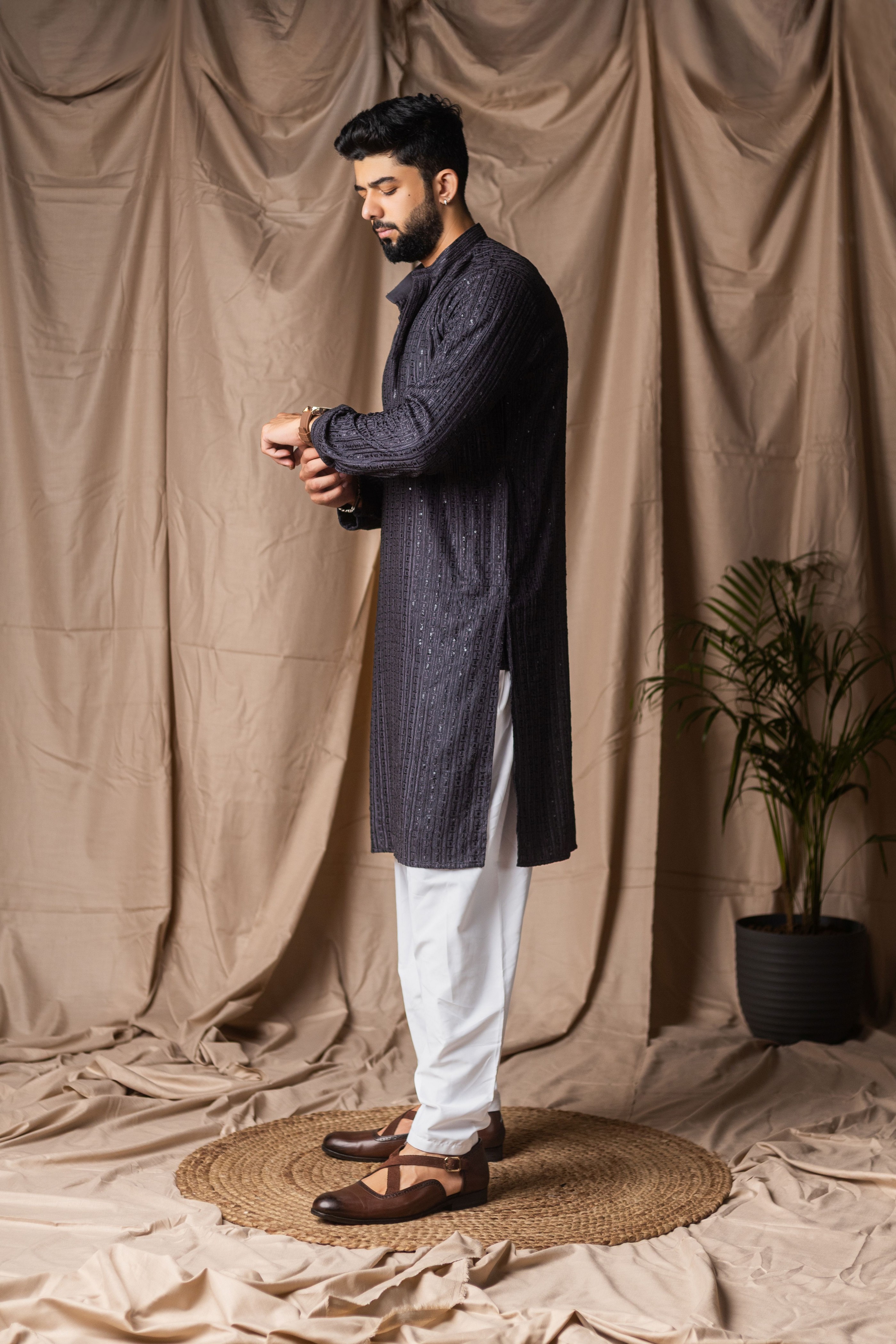Dark Grey Color Rayon Fabric Festive Wear Ethnic Men's Embroidered Kurta Payjama