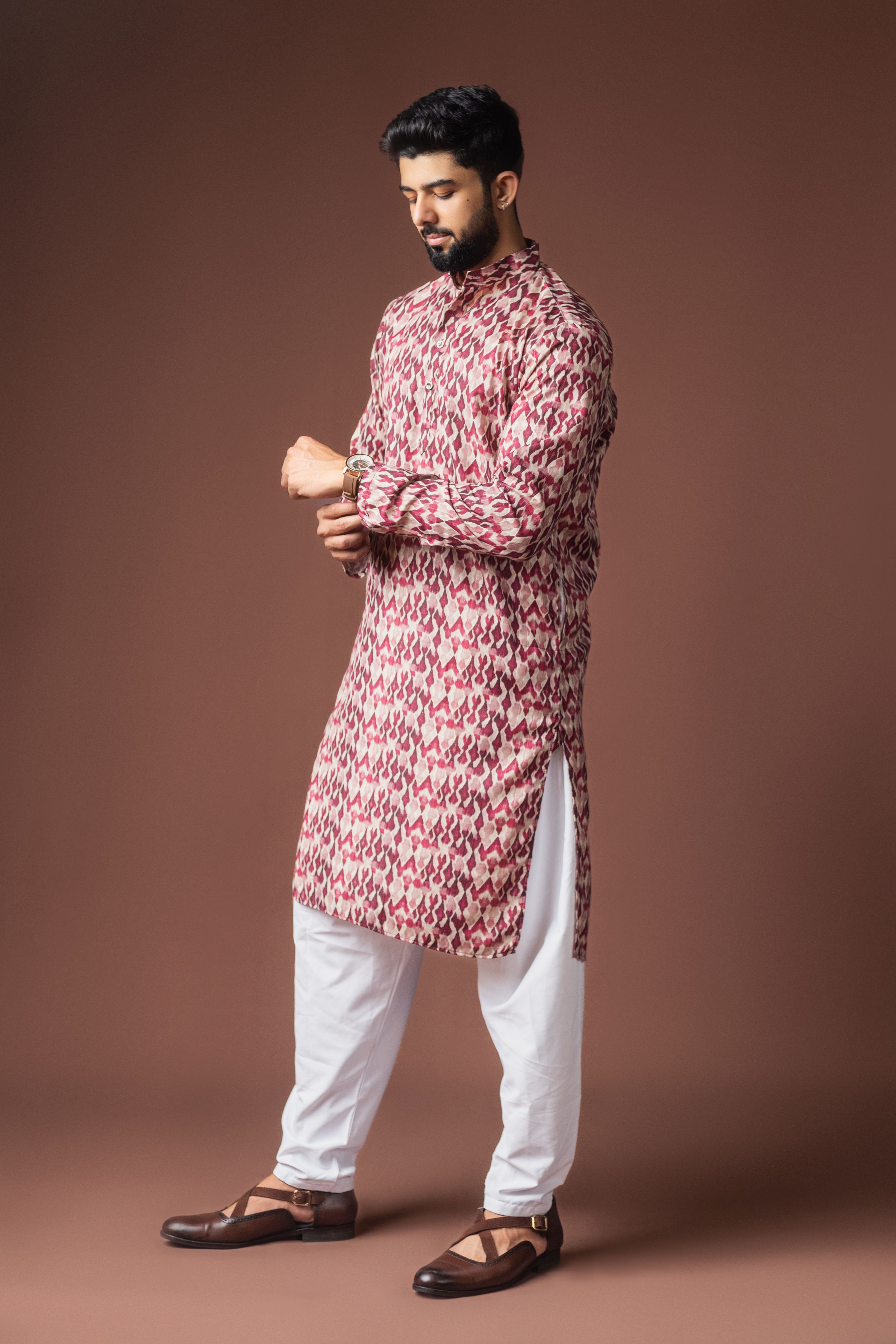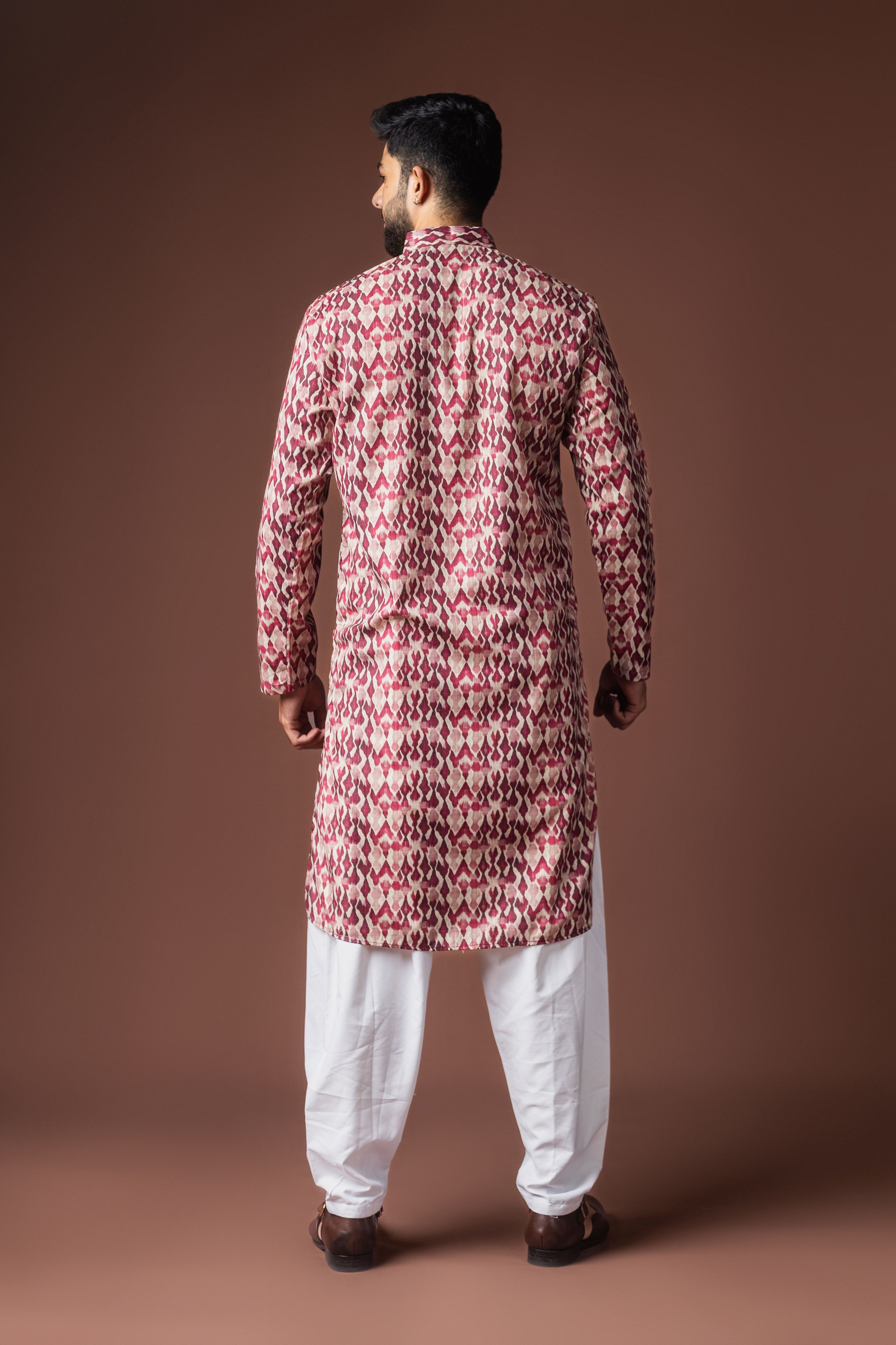 Dusty Rose Color Blended Linen Designer Printed Stylish Kurta Payjama For Mens'
