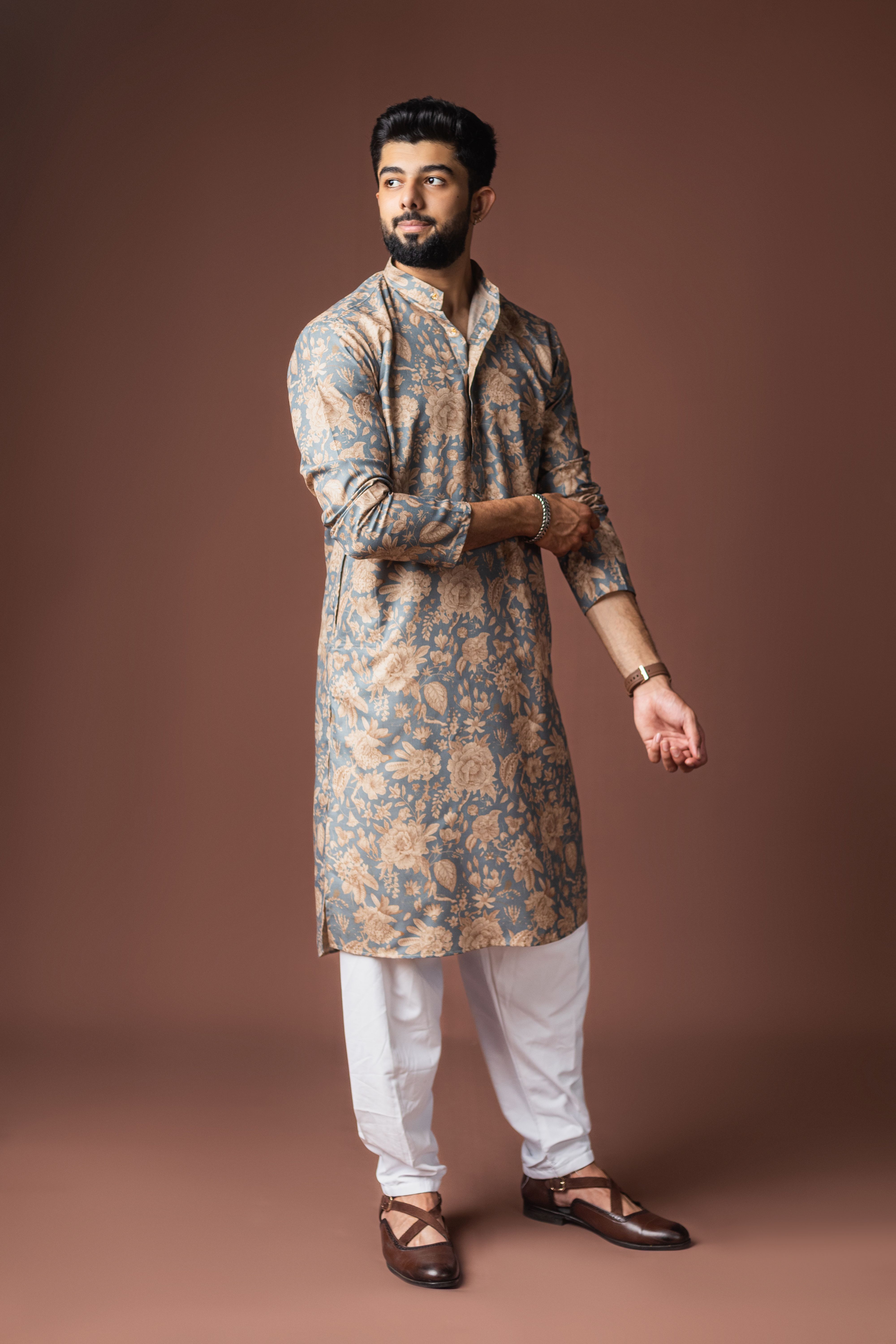 Grey Color Blended Linen Designer Printed Stylish Kurta Payjama For Mens'
