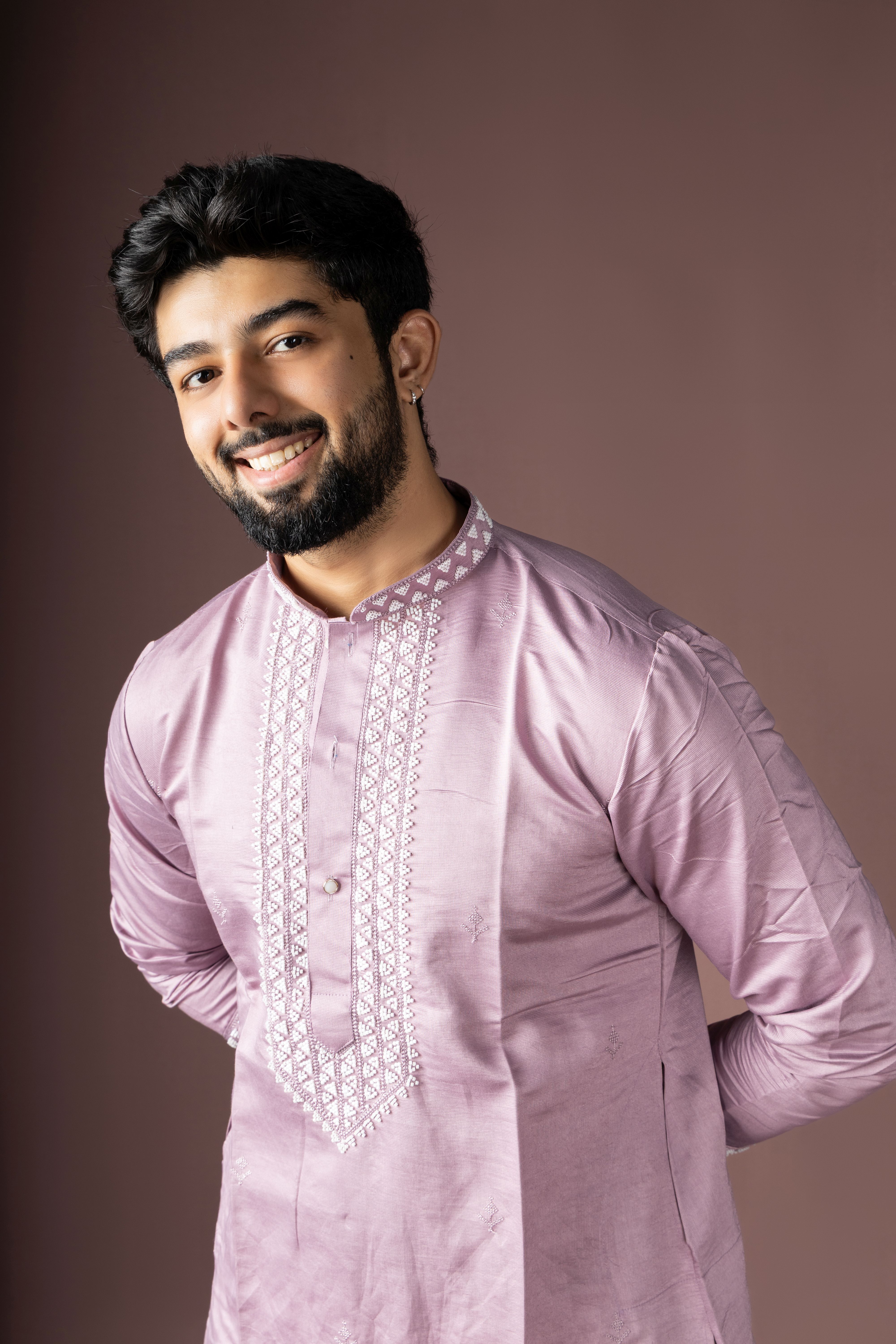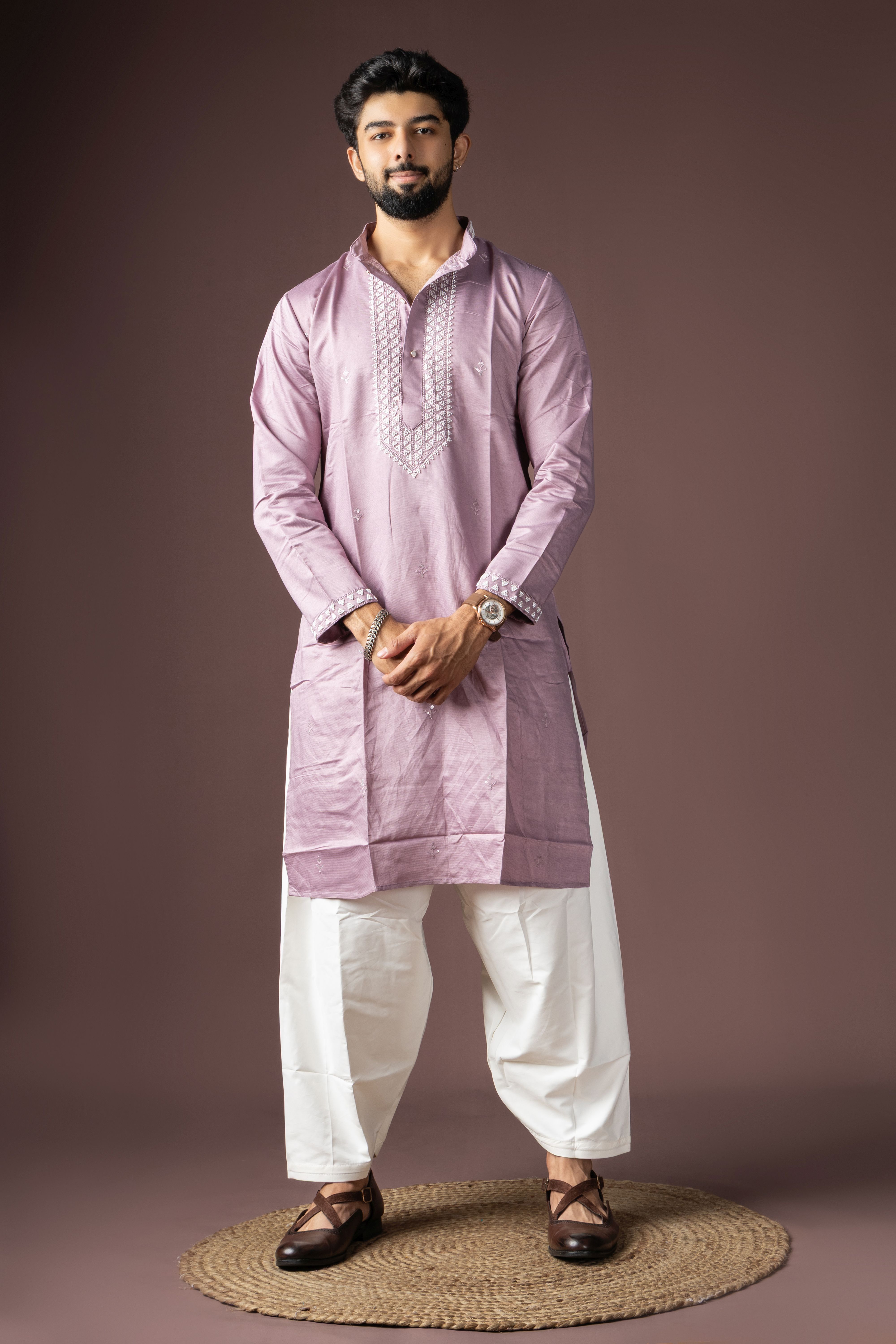 Lavendar Color Beautiful Printed Silk Fabric Ceremonial Men's Kurta Payjama