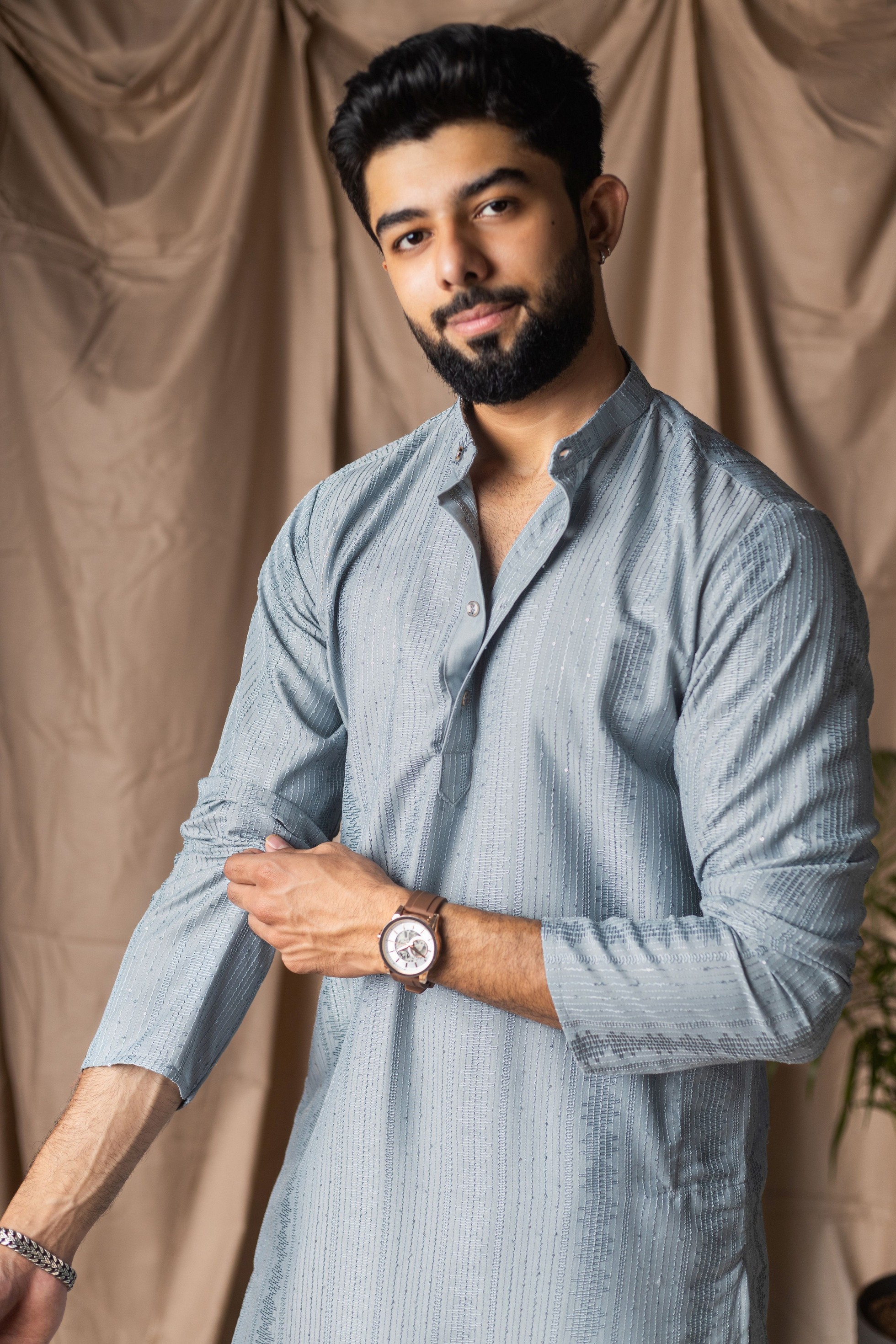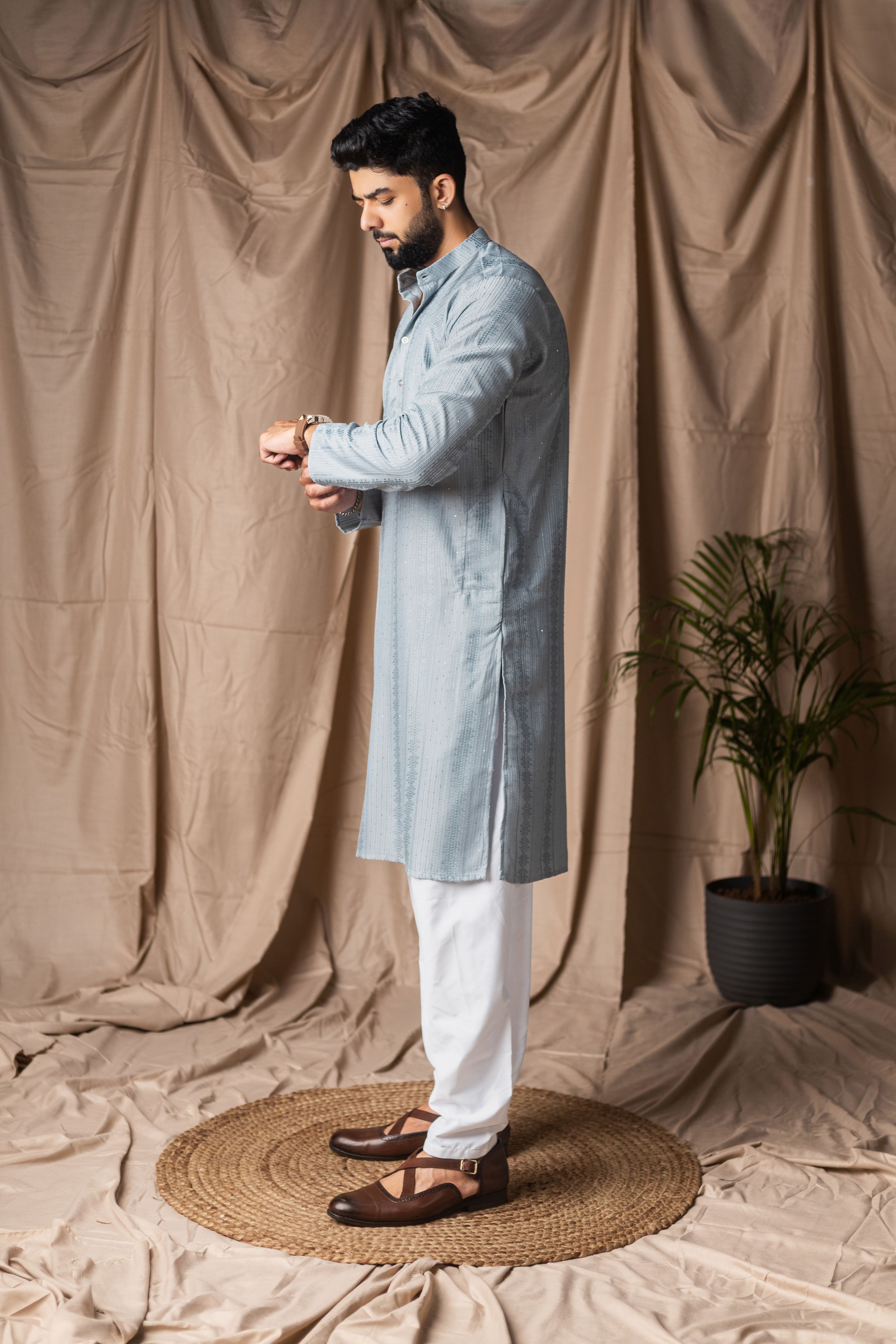 Light Blue Color Beautiful Thread Embroidery Work Rayon Fabric Ceremonial Men's Kurta Payjama