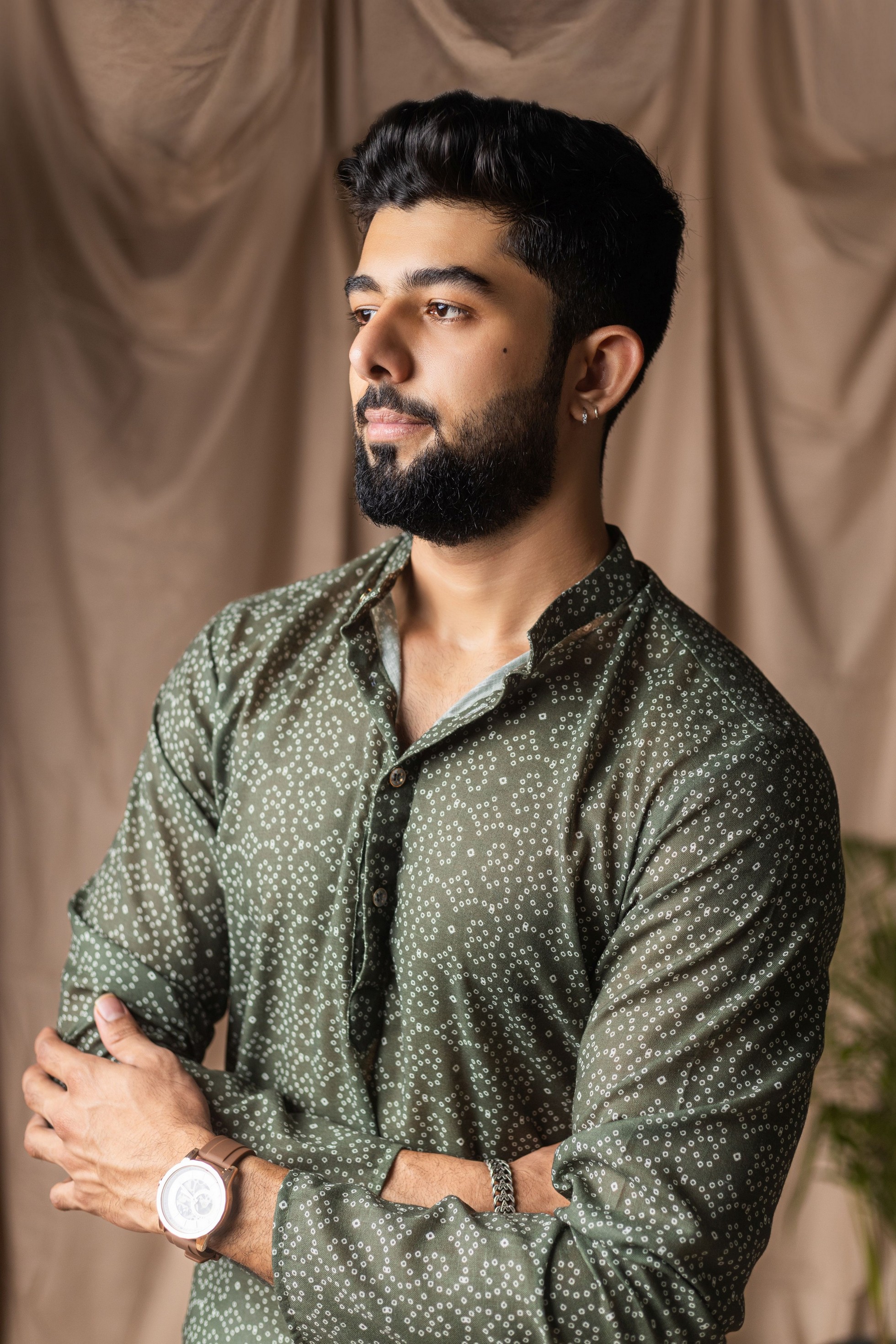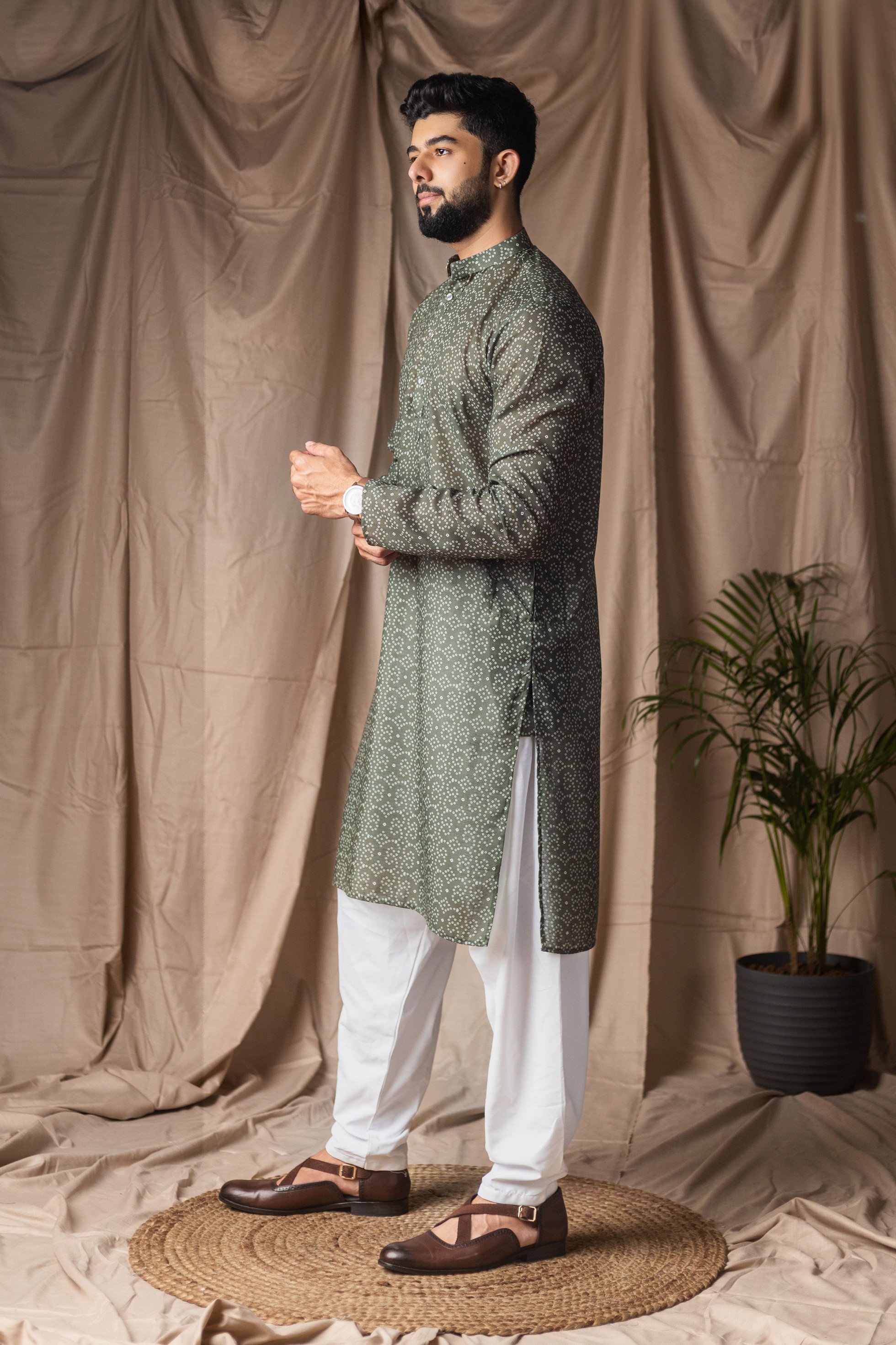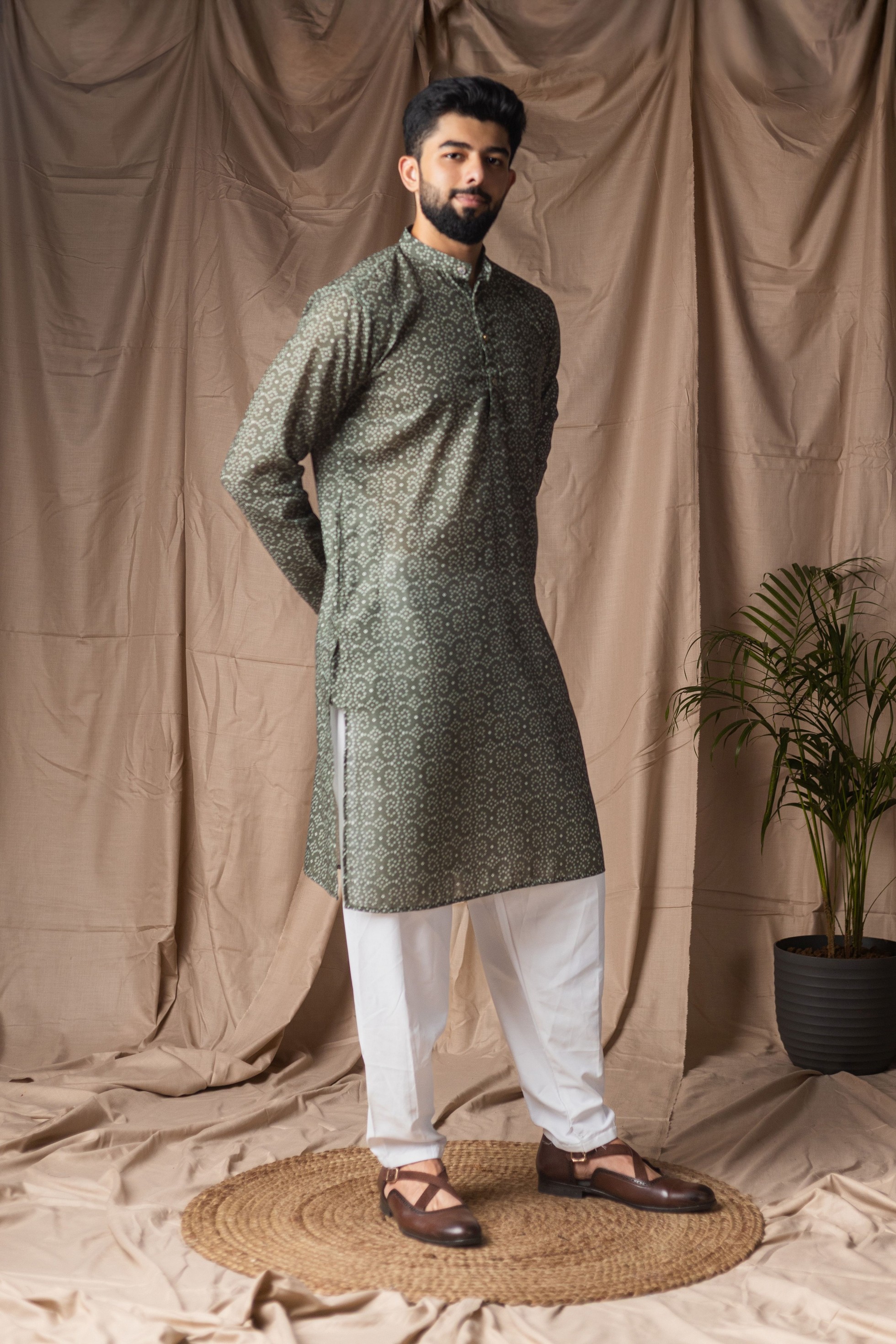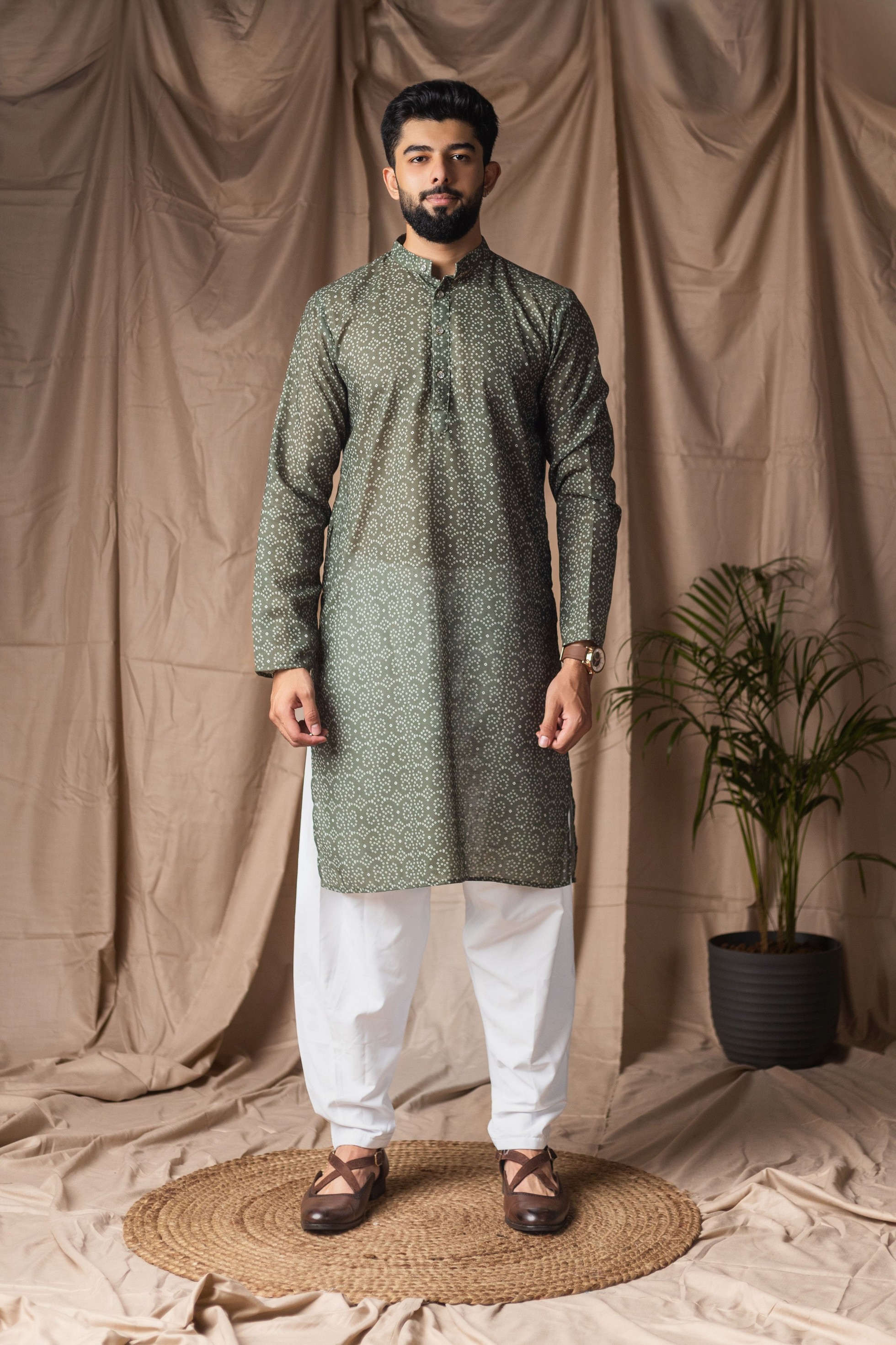 Mehandi Green Color Blended Linen Designer Printed Stylish Kurta Payjama For Mens'