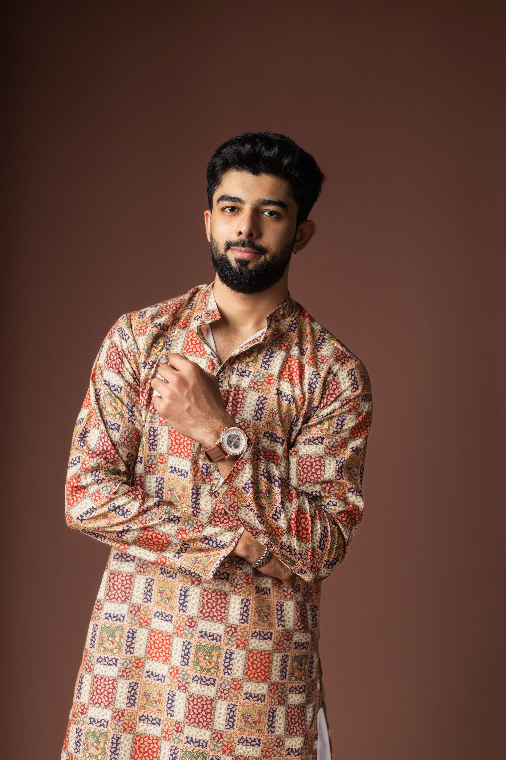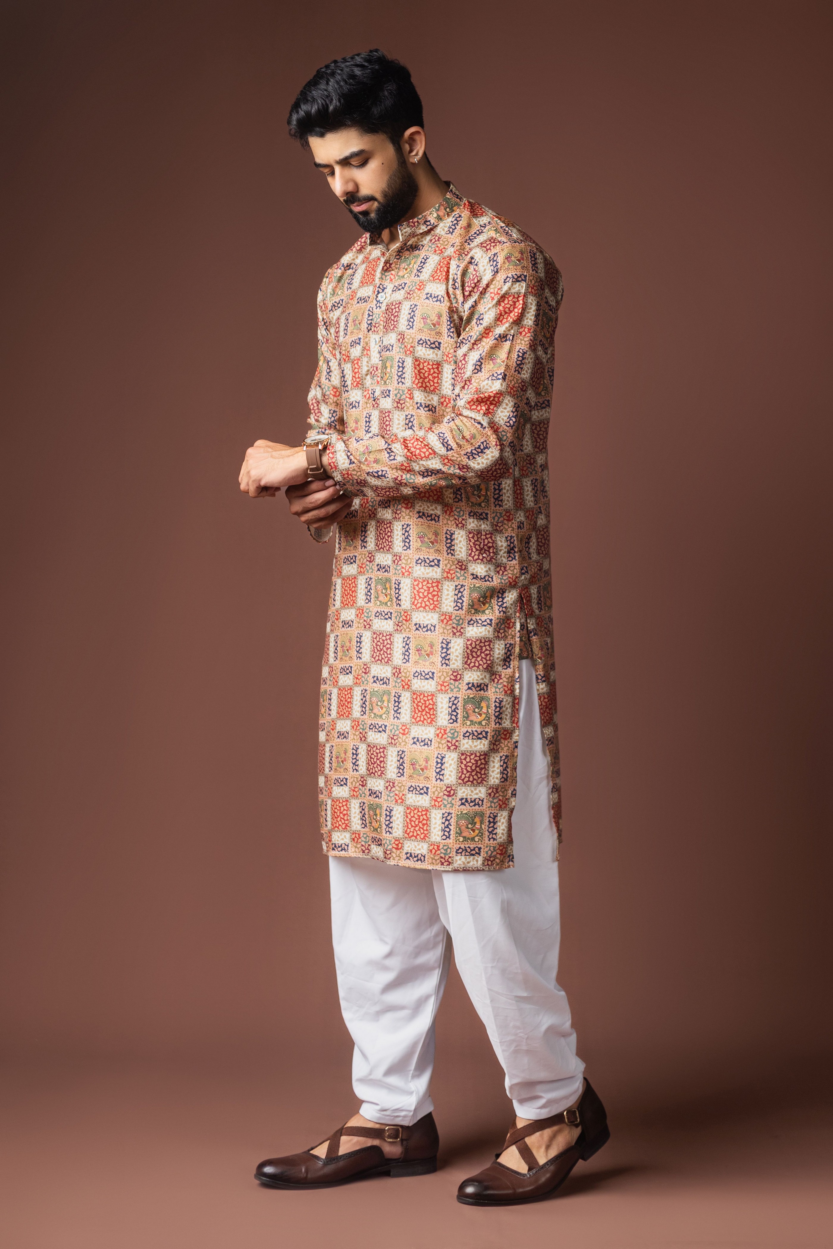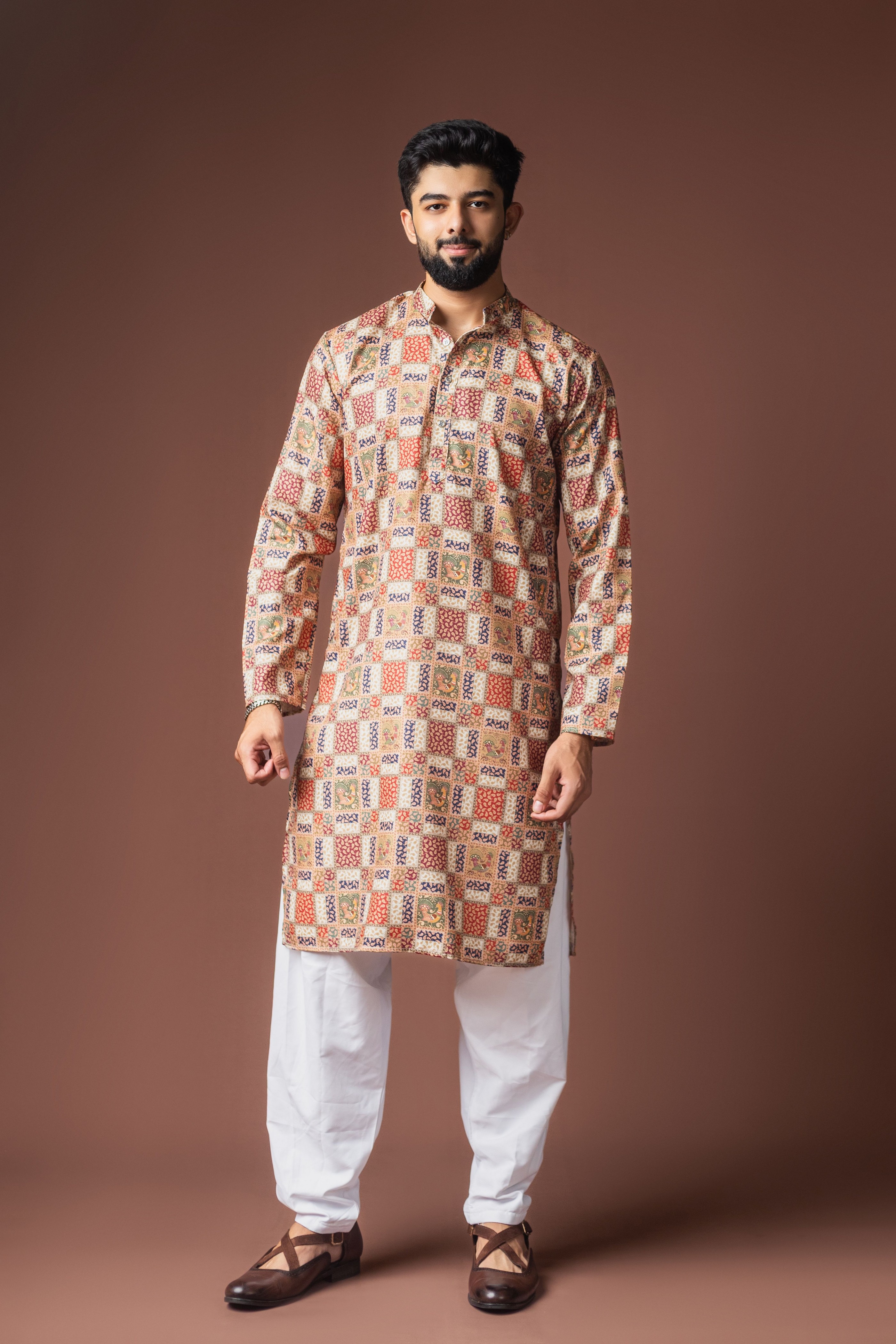 Multy Color Blended Linen Fabric Designer Printed Festive Wear Men's Kurta Payjama