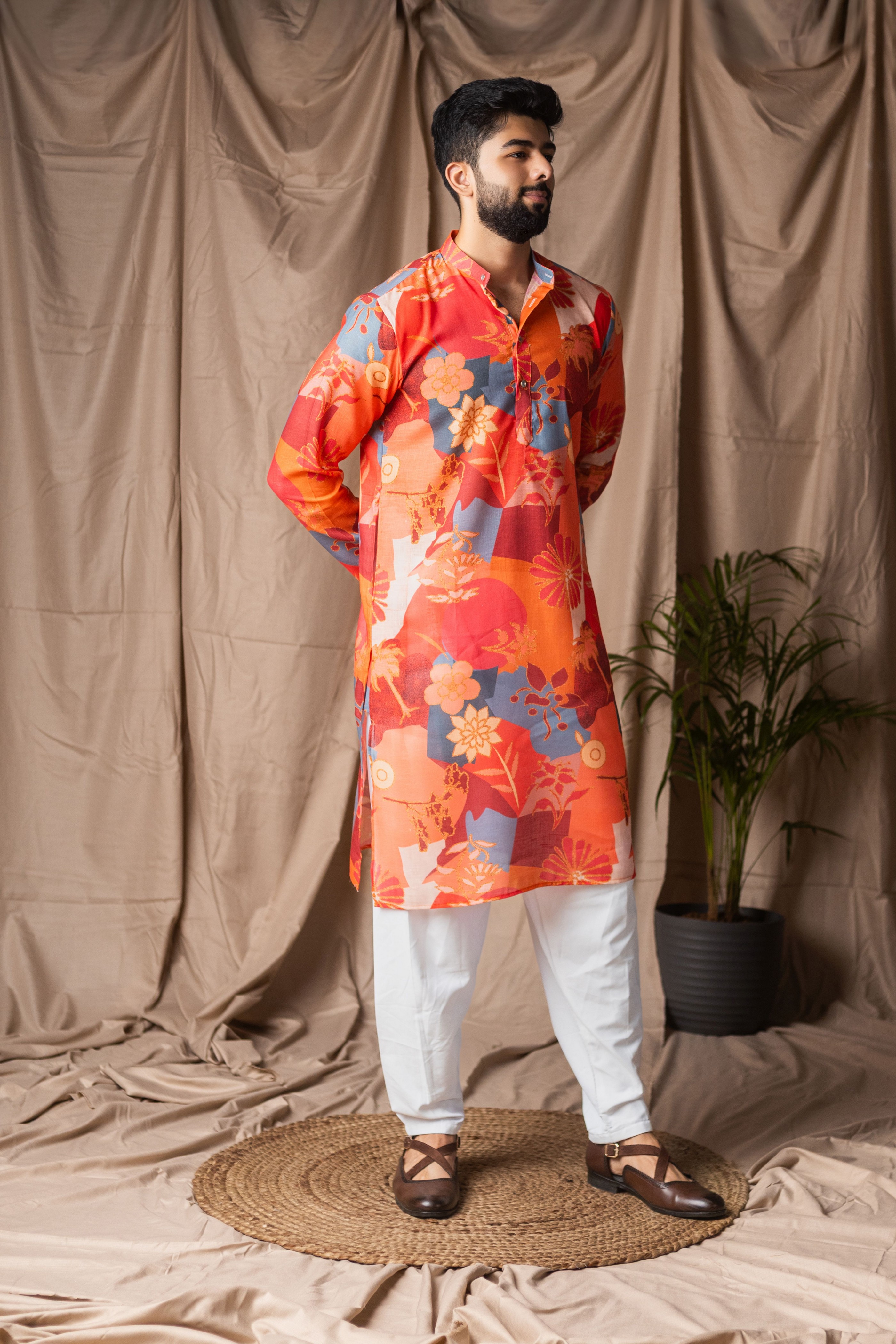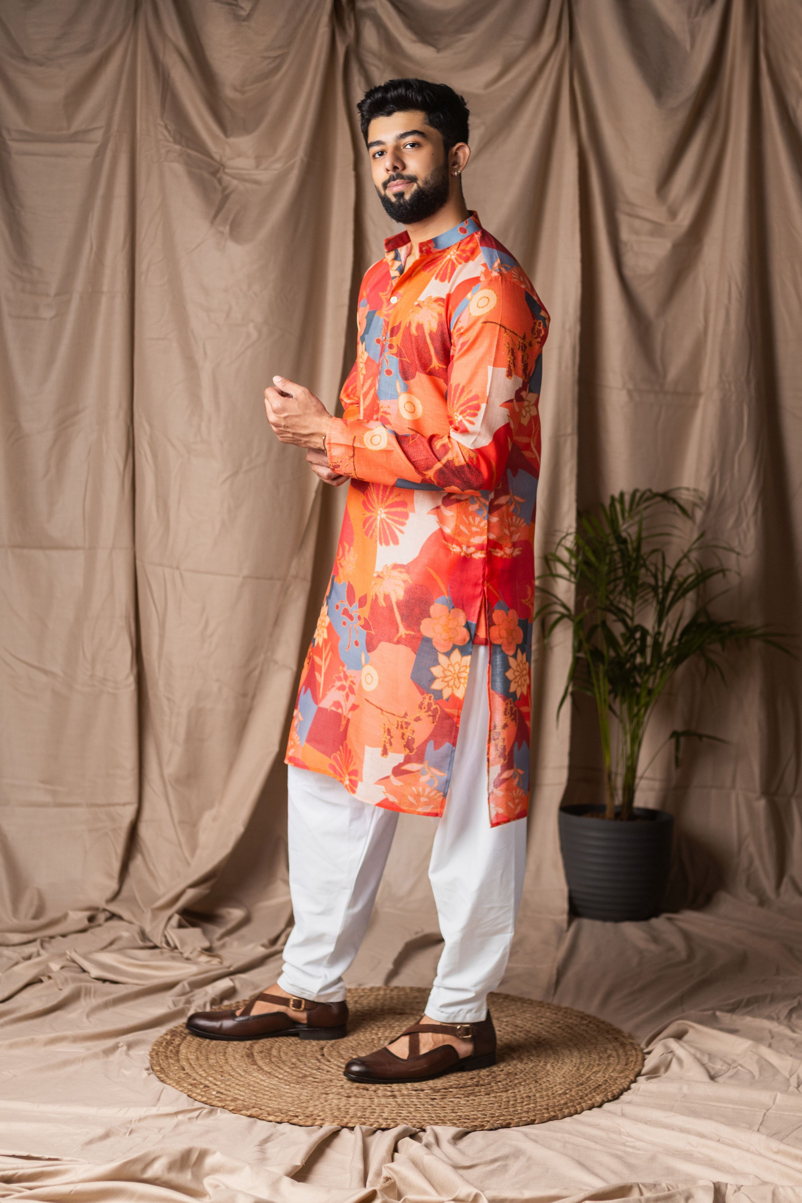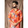 Orange Color Blended Linen Designer Printed Stylish Kurta Payjama For Mens'