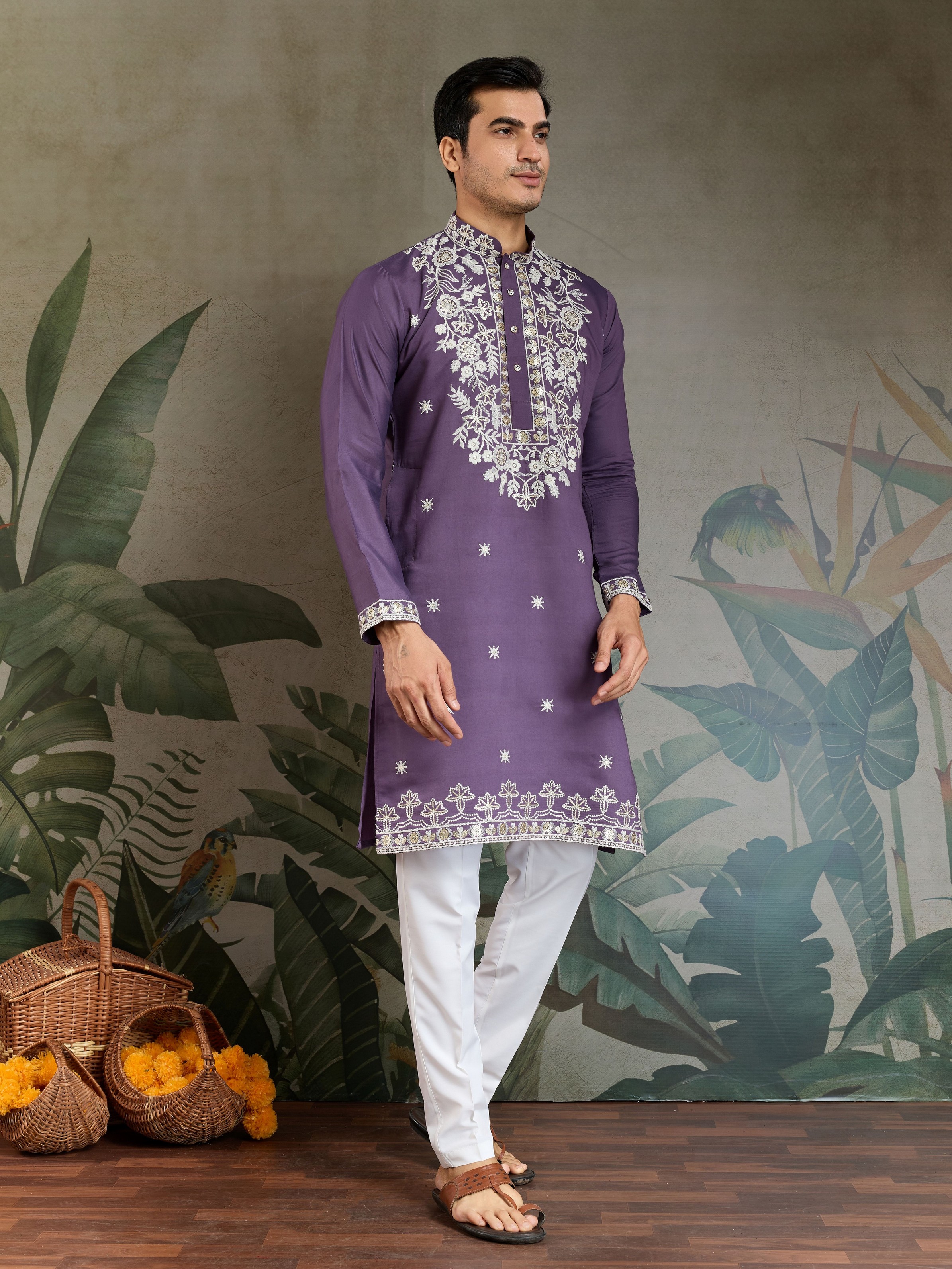 Pastel Purple Color Rayon Fabric Sequins Embroidery Work Ethnic Ceremonial Wear Men's Kurta