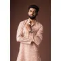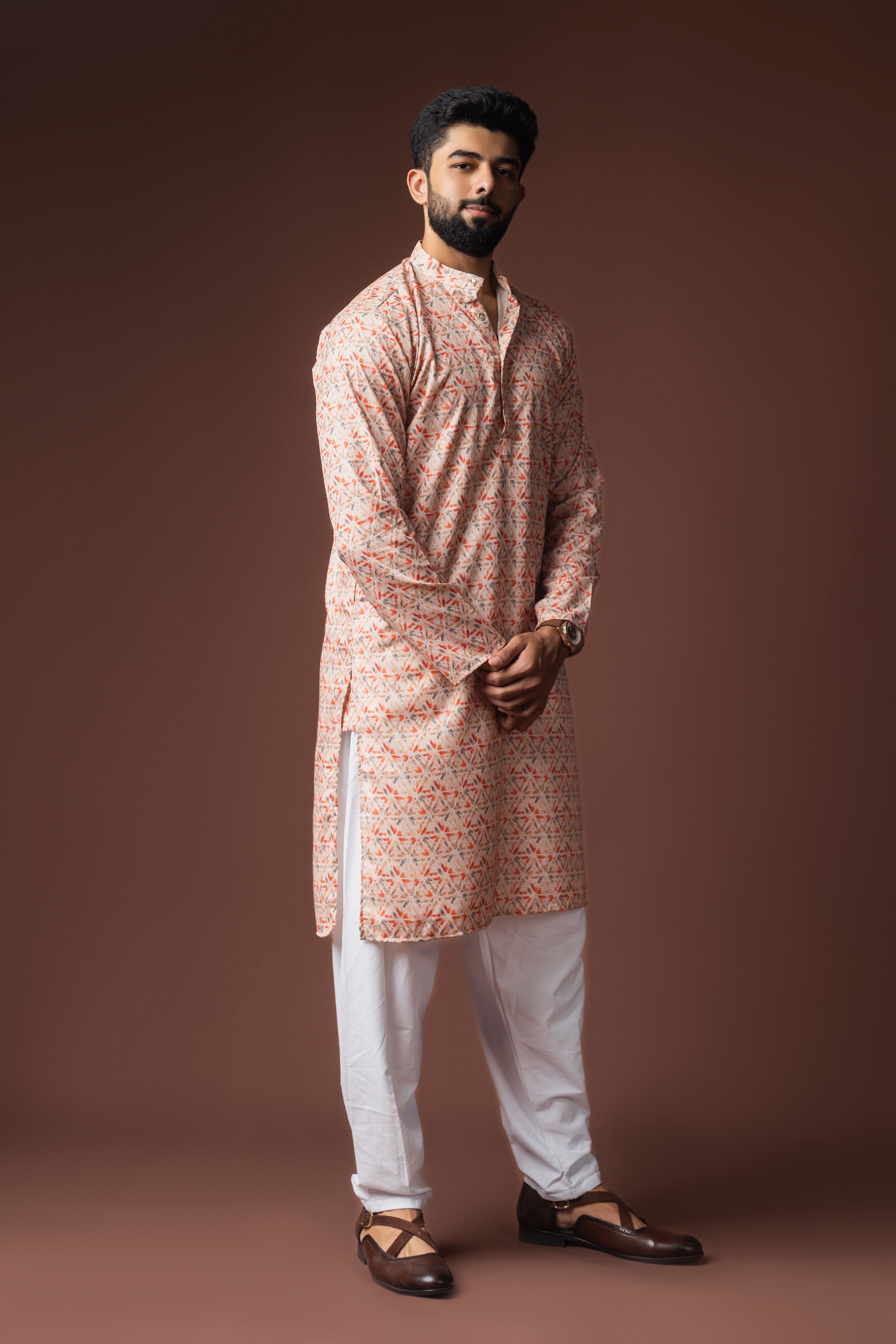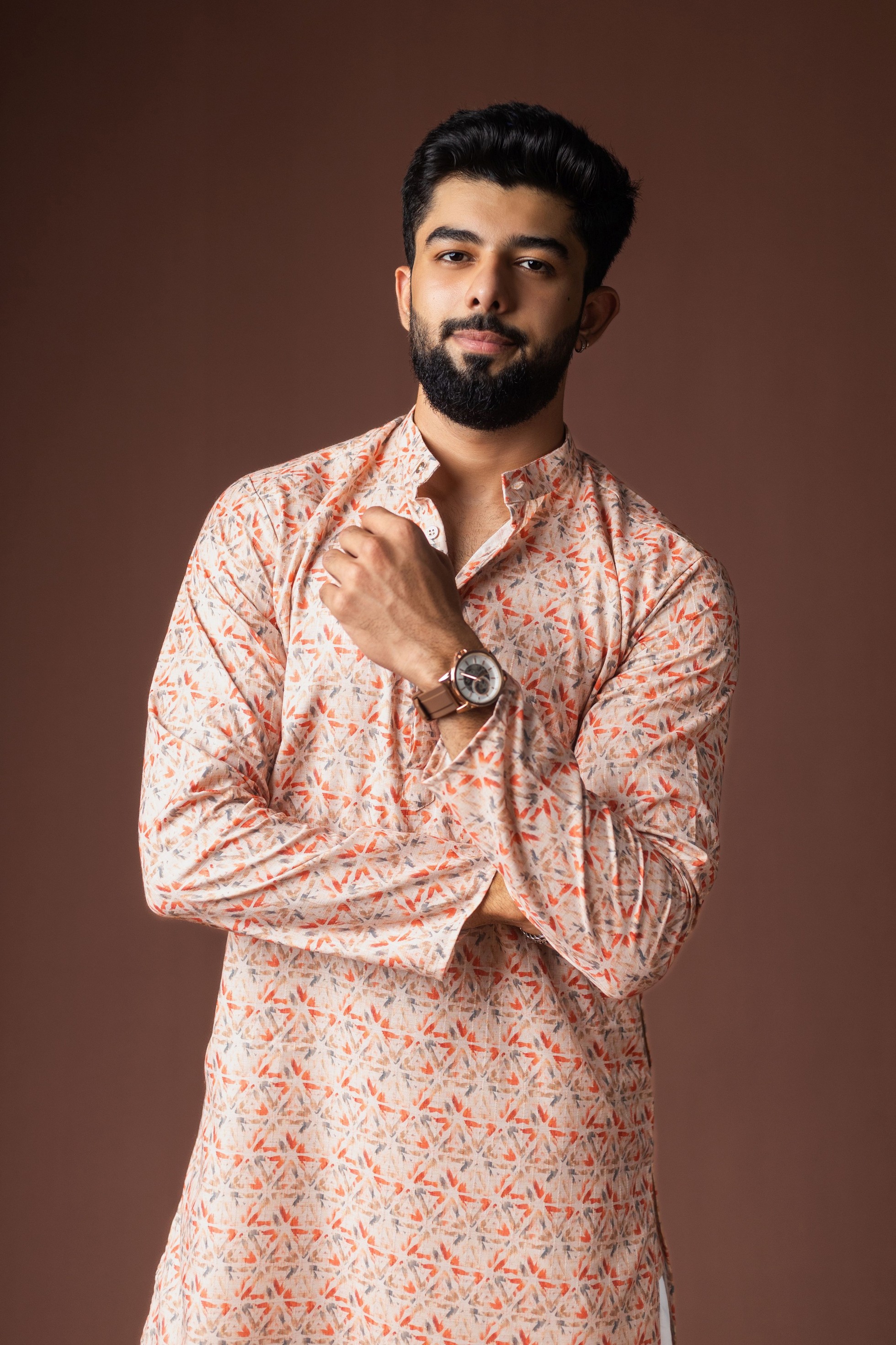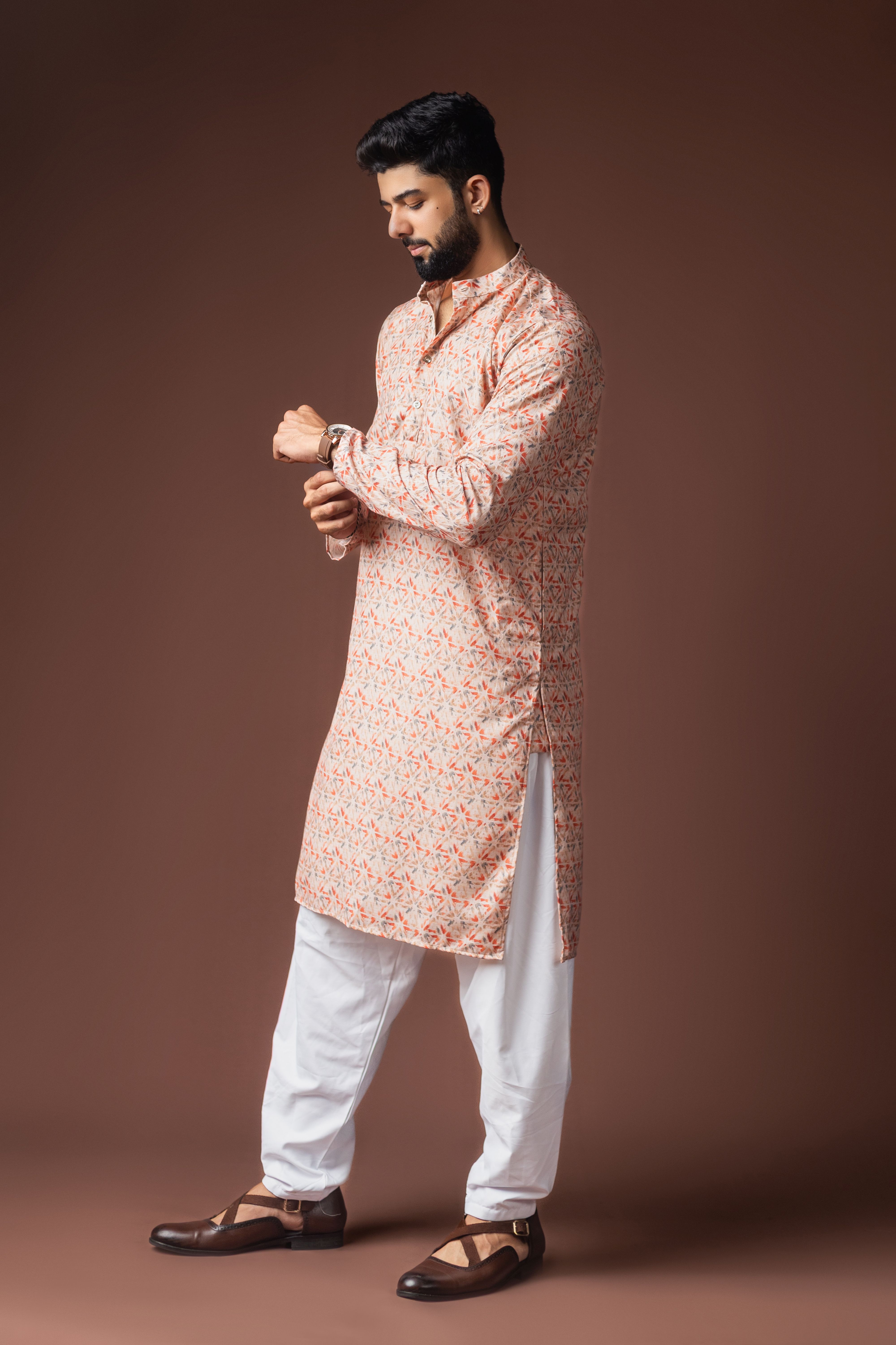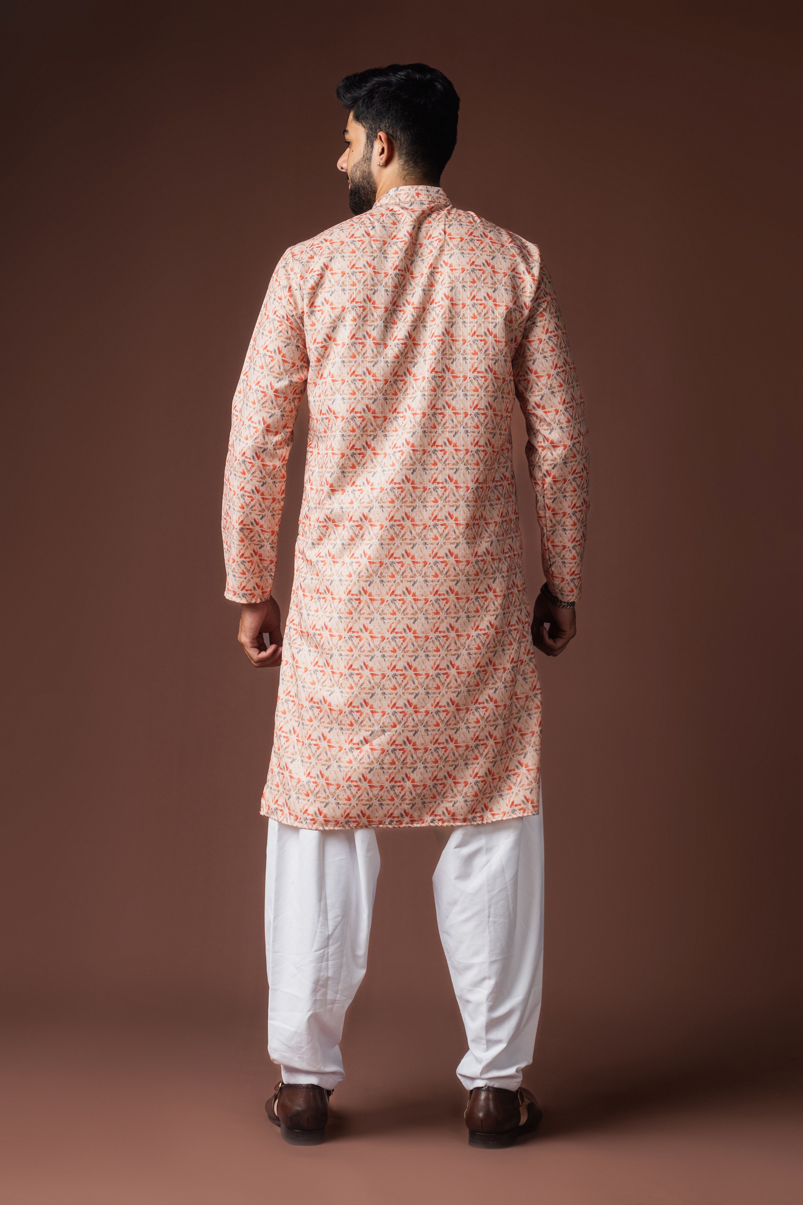 Peach Color Blended Linen Fabric Designer Printed Festive Wear Men's Kurta Payjama