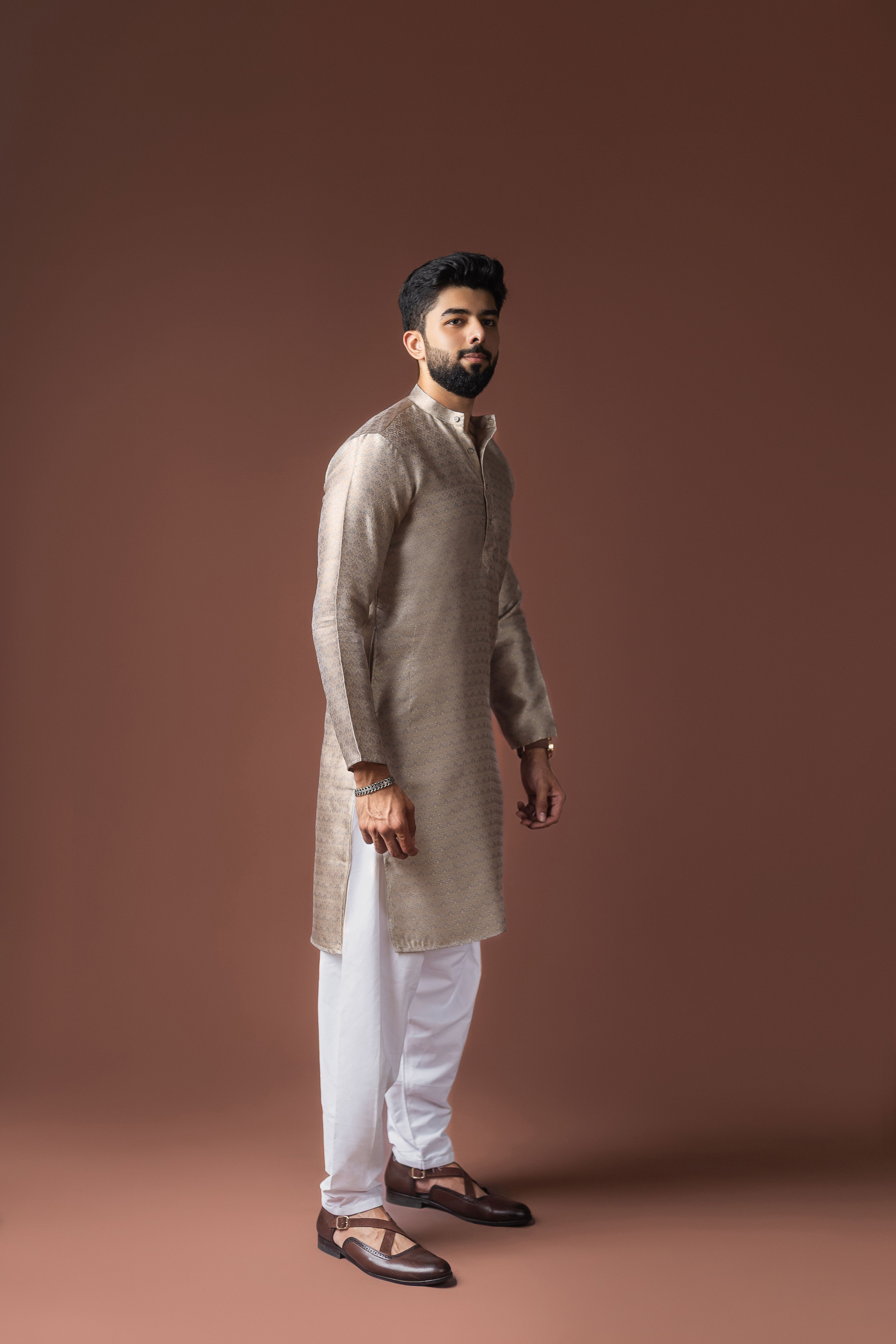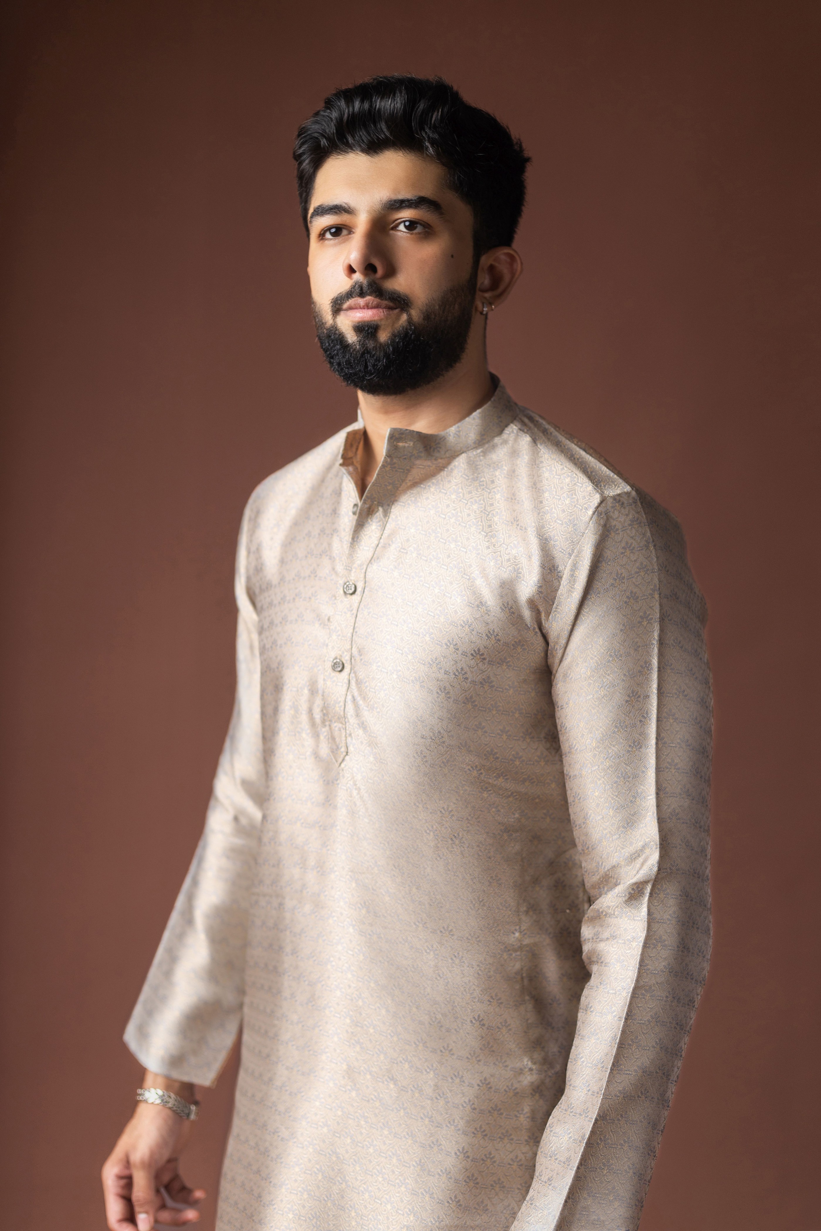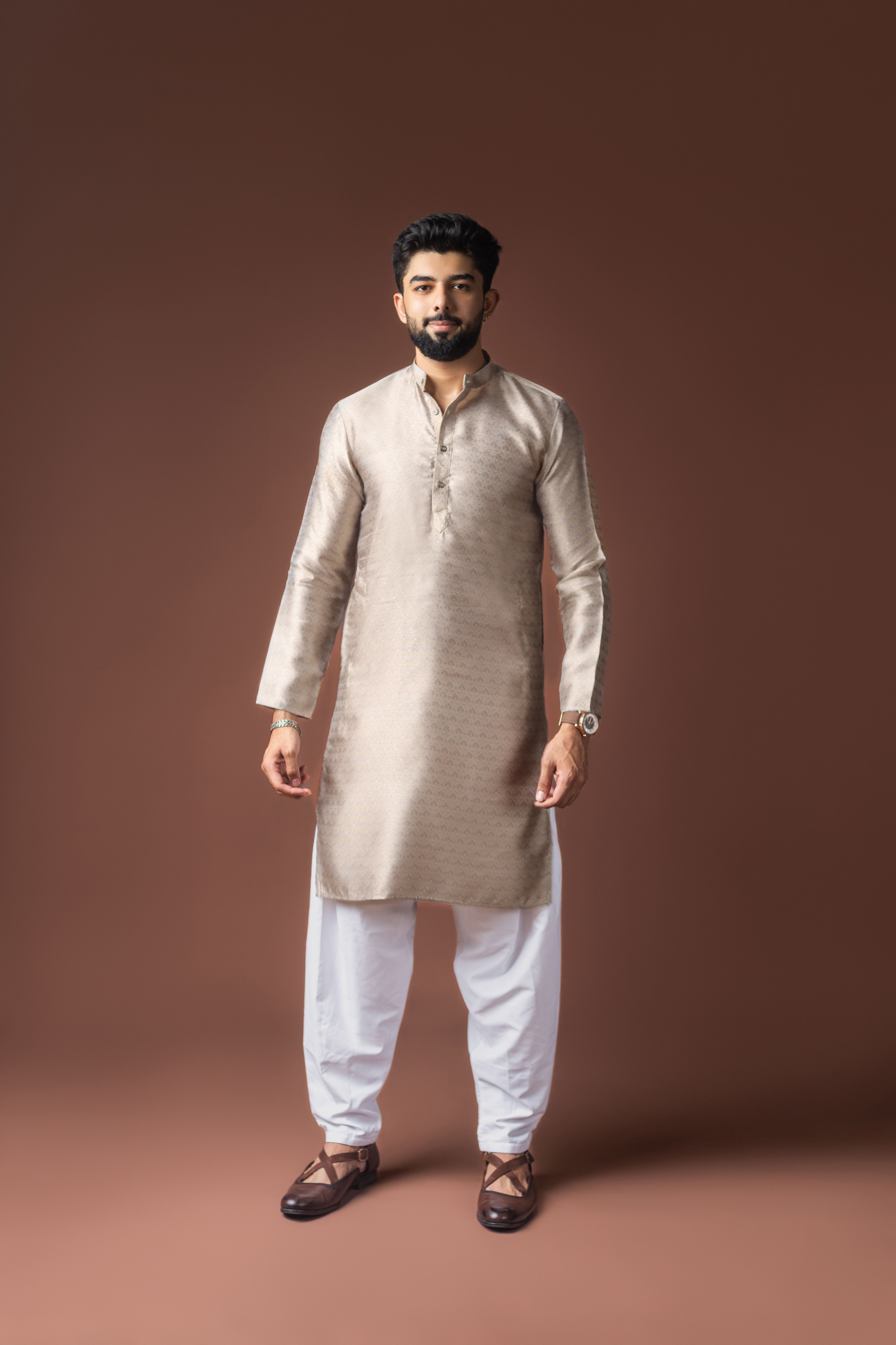 Silver Color Jacquard Designer Ethnic Men's Kurta Payjama For Festive Looks
