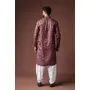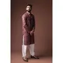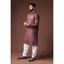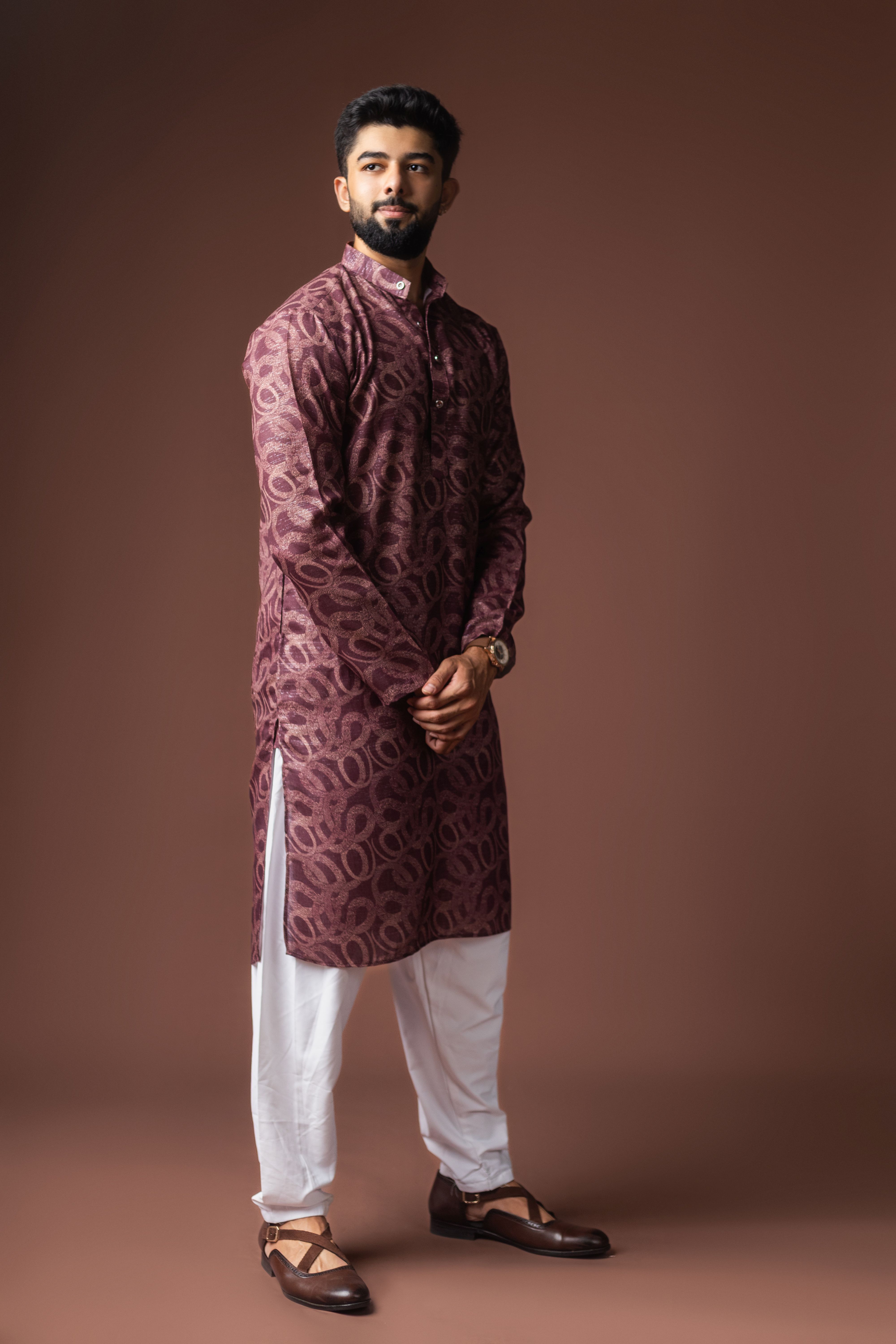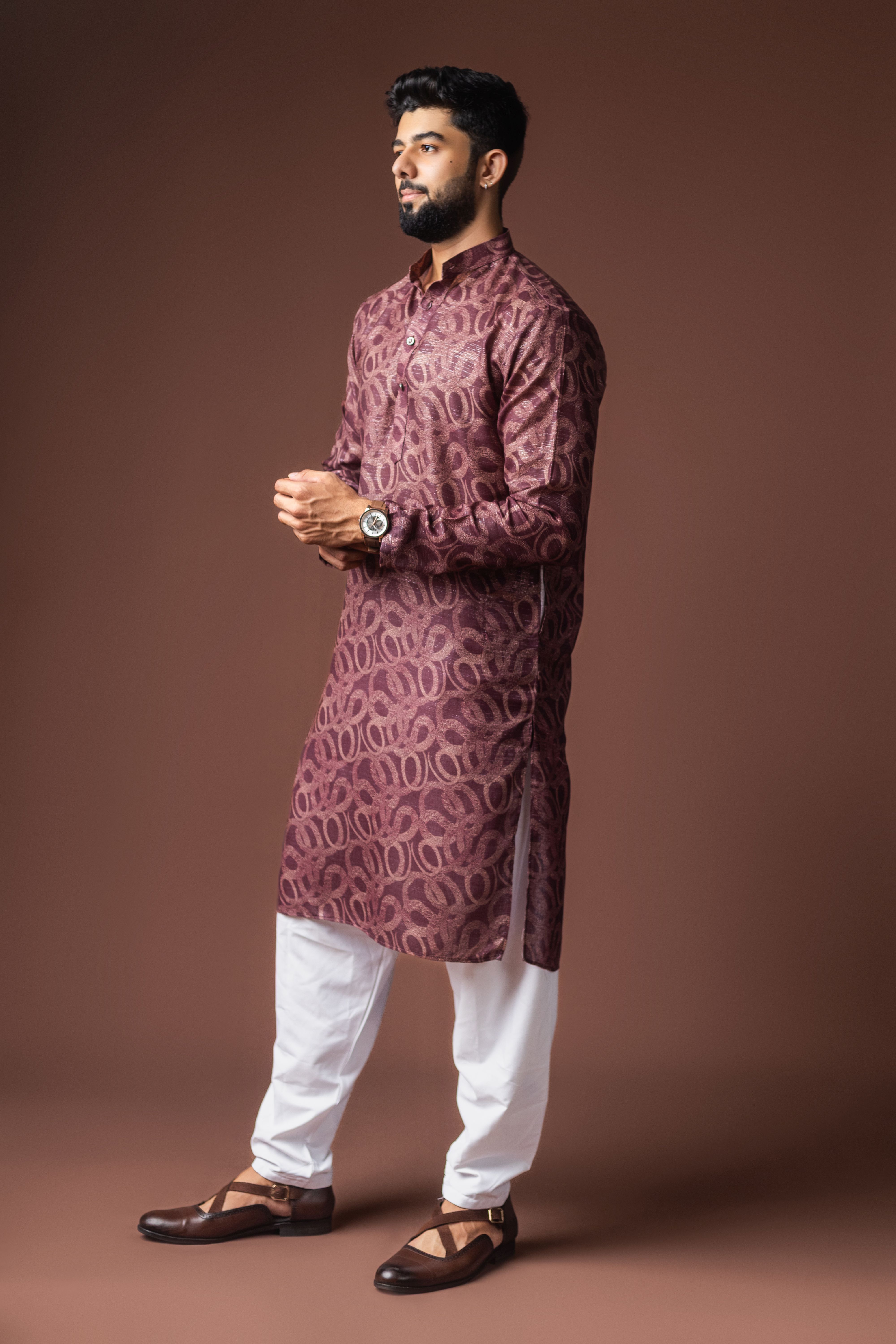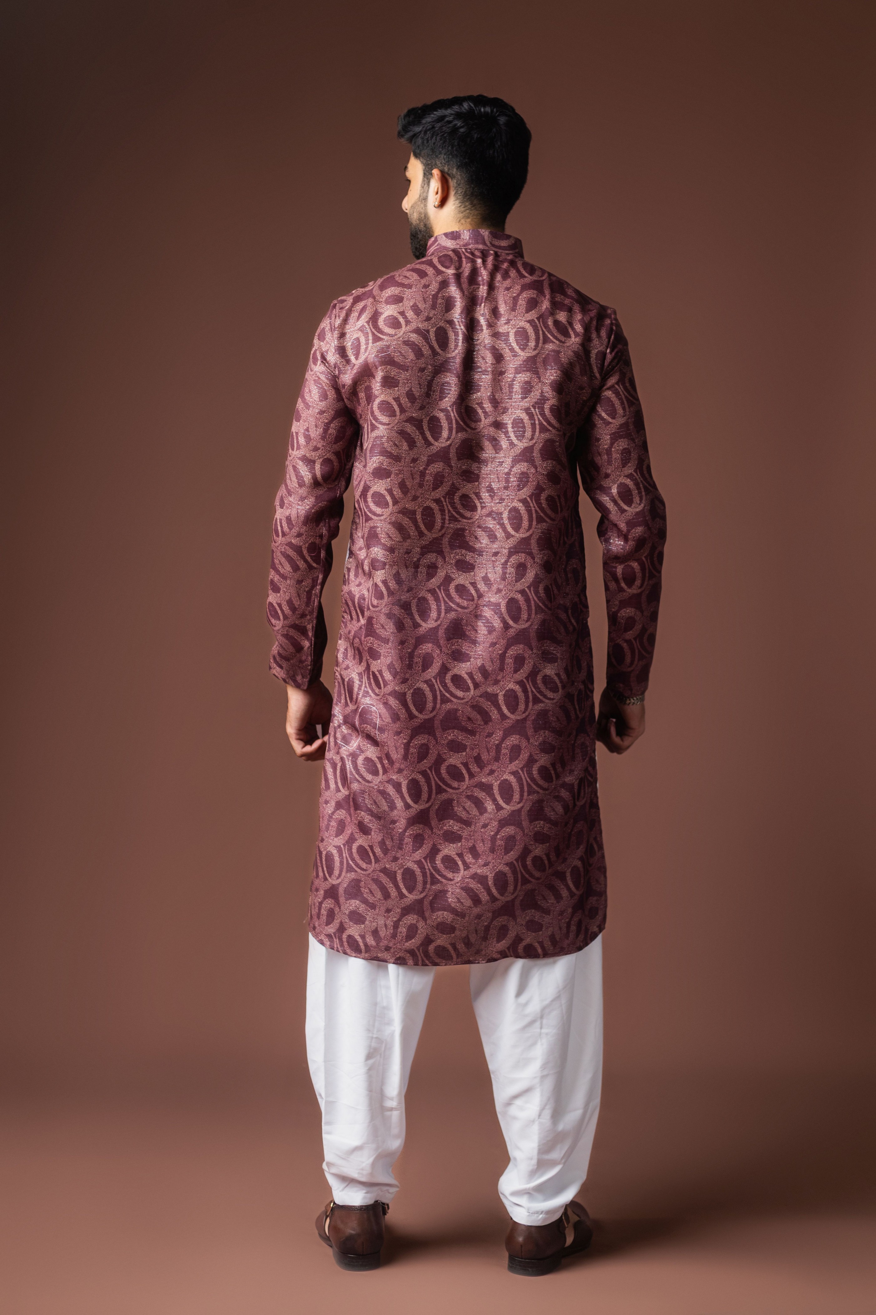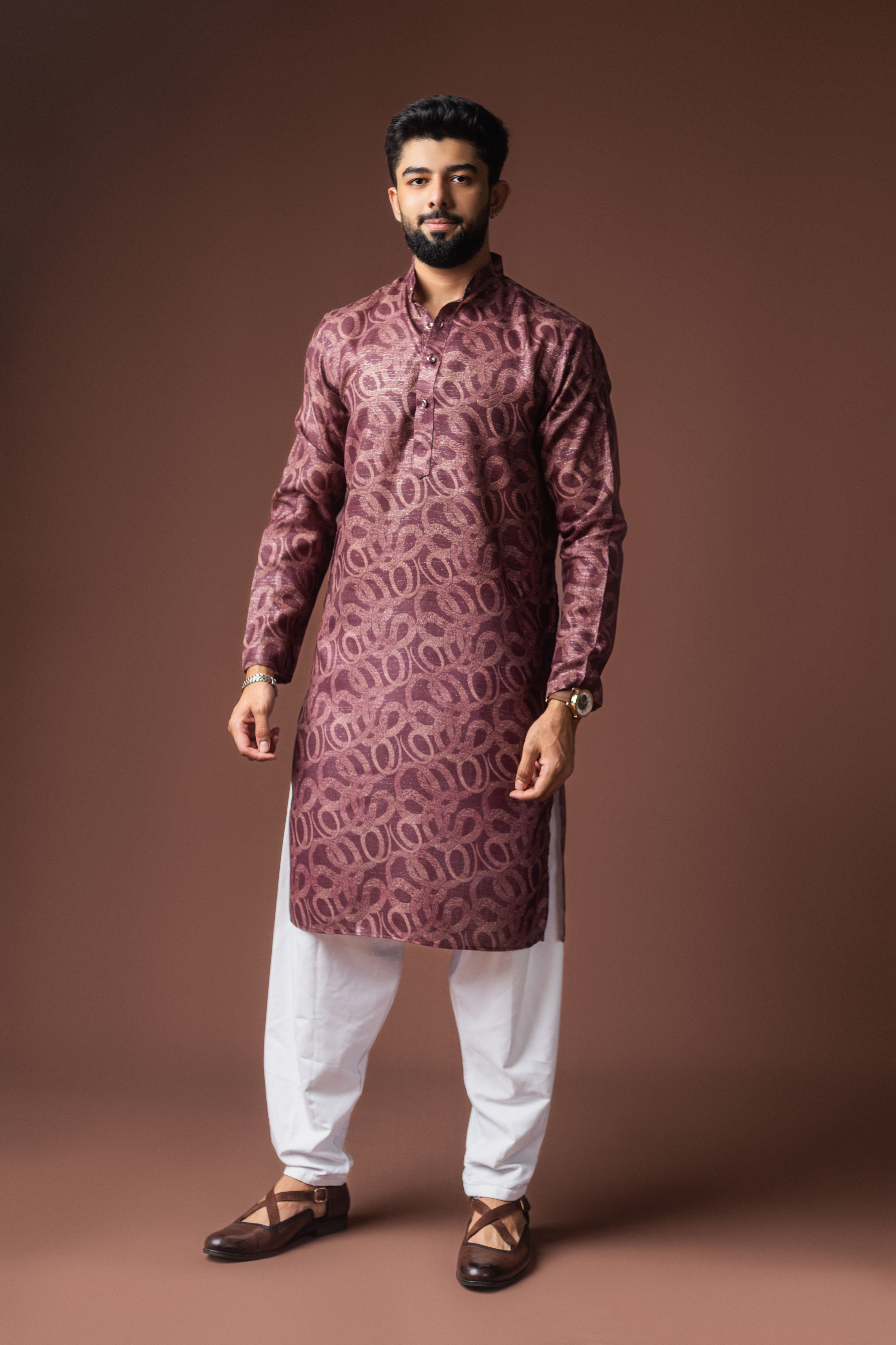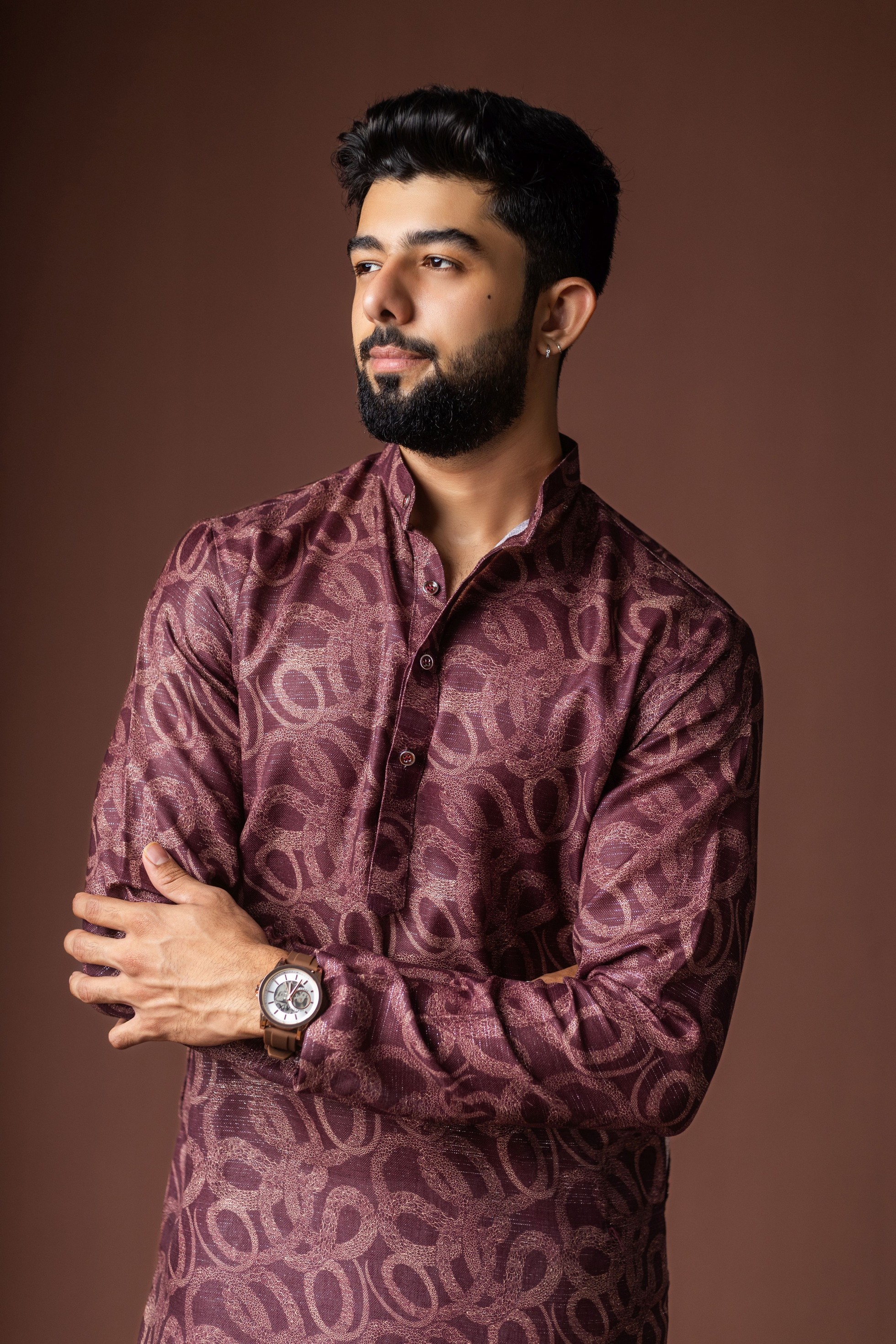 Wine Color Blended Linen Designer Printed Stylish Kurta Payjama For Mens'
