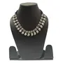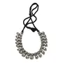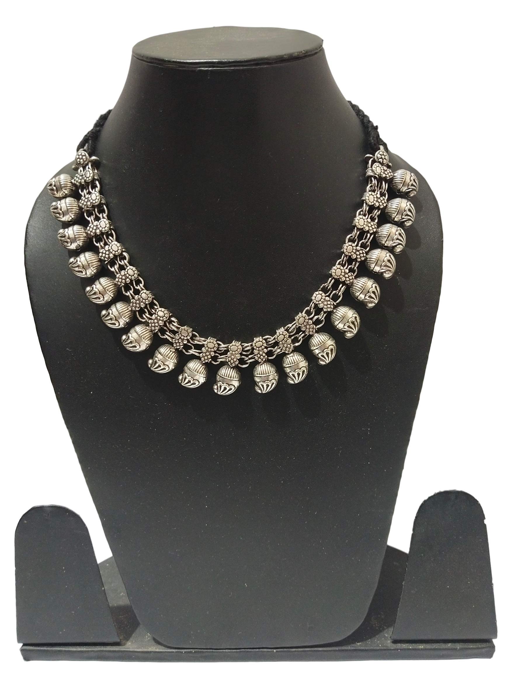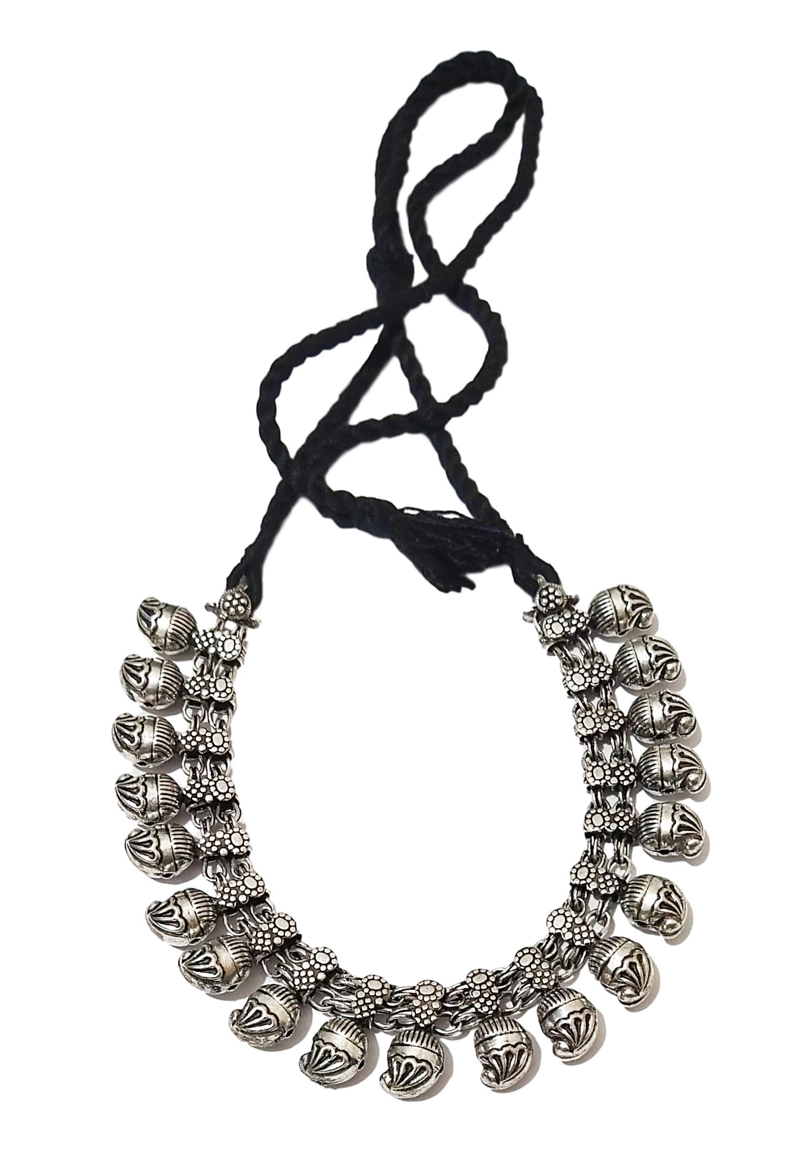 Oxidised silver single line beaded choker with thin silk dori drawstring of Black colour. This necklace could wear as collar cum choker. As per you desire you can tight or loosed the drawstring to give it a look of collar or choker. Flaunt your looks with this traditional ethnic necklaces on festivals | weddings | poojan. It goes well with any dresses