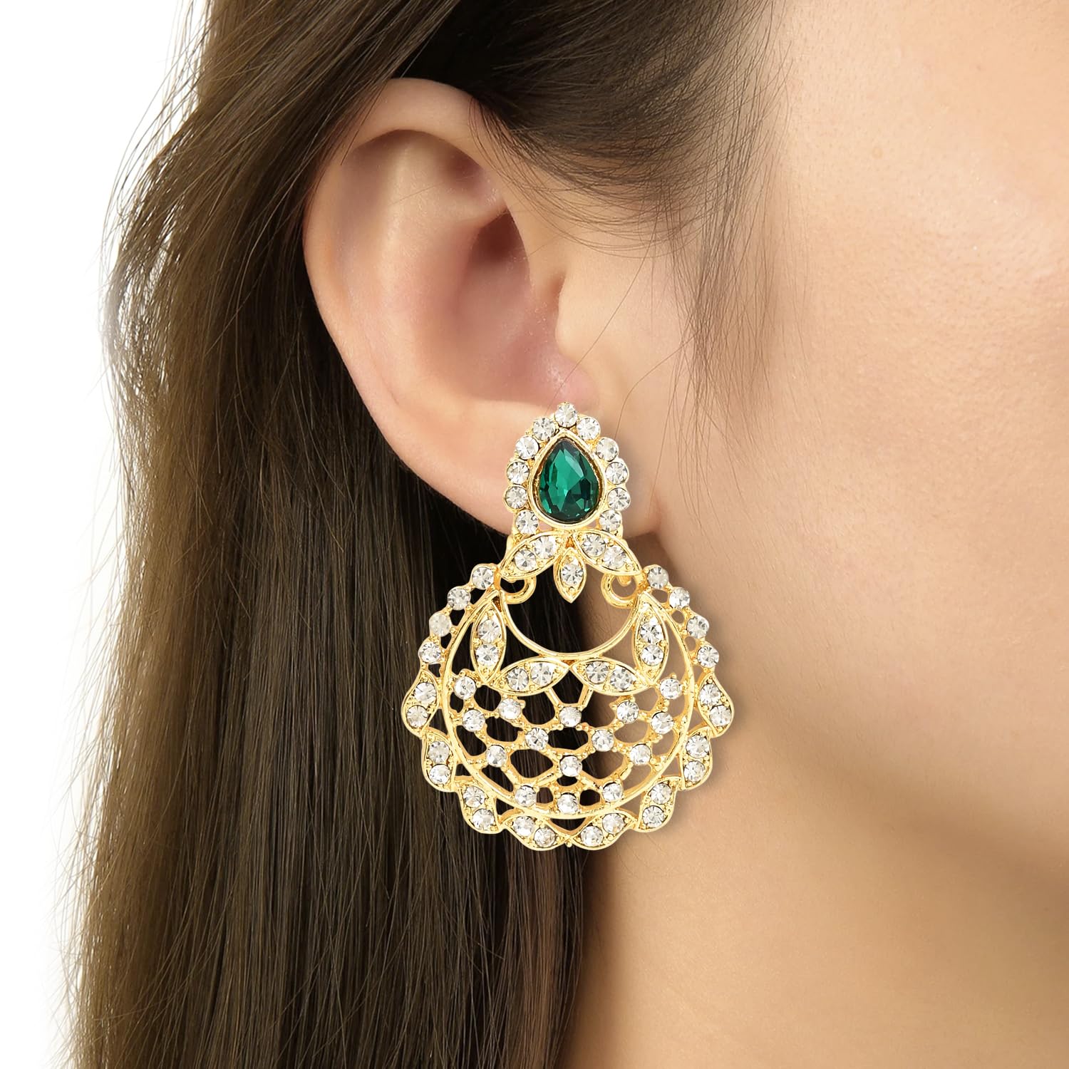 The gold-plated choker necklace set consists of a necklace a pair of earrings and a maang tikka. The necklace features kundan studded with pearl beaded in it giving it an elegant and traditional look. The stones and pearls are set in a beautiful pattern adding a touch of sophistication and grace to the necklace. The necklace is secured with drawstring closures which make it easy to adjust the size to fit comfortably around the neck. This is an important feature as it ensures that the necklace will be comfortable to wear for extended periods of time. The necklace is secured with drawstring closures which make it easy to adjust the size to fit comfortably around the neck. This is an important feature as it ensures that the necklace will be comfortable to wear for extended periods of time. The earrings and maang tikka are also adorned with stones and pearls which match the pattern of the necklace. The earrings have a beautiful design which makes them easy and comfortable to wear. The maang tikka is a traditional Indian hair accessory that can be worn with the necklace and earrings to complete the look.