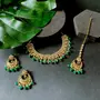 The gold-plated choker necklace set consists of a necklace a pair of earrings and a maang tikka. The necklace features kundan studded with pearl beaded in it giving it an elegant and traditional look. The stones and pearls are set in a beautiful pattern adding a touch of sophistication and grace to the necklace. The necklace is secured with drawstring closures which make it easy to adjust the size to fit comfortably around the neck. This is an important feature as it ensures that the necklace will be comfortable to wear for extended periods of time. The necklace is secured with drawstring closures which make it easy to adjust the size to fit comfortably around the neck. This is an important feature as it ensures that the necklace will be comfortable to wear for extended periods of time. The earrings and maang tikka are also adorned with stones and pearls which match the pattern of the necklace. The earrings have a beautiful design which makes them easy and comfortable to wear. The maang tikka is a traditional Indian hair accessory that can be worn with the necklace and earrings to complete the look.