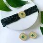This stunning jewelry set is gold plating and includes a choker necklace and a pair of earrings. The choker necklace is adorned with intricate bead and pearl detailing adding a touch of elegance to the design. It is secured with drawstring closures allowing for a comfortable and adjustable fit. The versatile nature of this jewelry set makes it the perfect accessory to complement a variety of traditional outfits. Whether you choose to wear it with a saree or a salwar suit this necklace set will elevate your overall look and add a glamorous touch to your ensemble. The combination of beads pearls and gold plating creates a captivating visual appeal that effortlessly enhances your style.