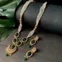 The gold-plated choker necklace set consists of a necklace a pair of earrings and a maang tikka. The necklace features kundan studded with pearl beaded in it giving it an elegant and traditional look. The stones and pearls are set in a beautiful pattern adding a touch of sophistication and grace to the necklace. The necklace is secured with drawstring closures which make it easy to adjust the size to fit comfortably around the neck. This is an important feature as it ensures that the necklace will be comfortable to wear for extended periods of time. The necklace is secured with drawstring closures which make it easy to adjust the size to fit comfortably around the neck. This is an important feature as it ensures that the necklace will be comfortable to wear for extended periods of time. The earrings and maang tikka are also adorned with stones and pearls which match the pattern of the necklace. The earrings have a beautiful design which makes them easy and comfortable to wear. The maang tikka is a traditional Indian hair accessory that can be worn with the necklace and earrings to complete the look.