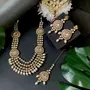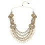 The gold-plated choker necklace set consists of a necklace a pair of earrings and a maang tikka. The necklace features kundan studded with pearl beaded in it giving it an elegant and traditional look. The stones and pearls are set in a beautiful pattern adding a touch of sophistication and grace to the necklace. The necklace is secured with drawstring closures which make it easy to adjust the size to fit comfortably around the neck. This is an important feature as it ensures that the necklace will be comfortable to wear for extended periods of time. The necklace is secured with drawstring closures which make it easy to adjust the size to fit comfortably around the neck. This is an important feature as it ensures that the necklace will be comfortable to wear for extended periods of time. The earrings and maang tikka are also adorned with stones and pearls which match the pattern of the necklace. The earrings have a beautiful design which makes them easy and comfortable to wear. The maang tikka is a traditional Indian hair accessory that can be worn with the necklace and earrings to complete the look.
