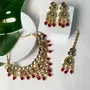 Elevate your traditional look with the included maang tikka. The delicate design combined with the radiant Kundan and pearl elements adds a touch of royalty to your hairstyle making you the center of attention at any event. The choker necklace features a statement design that gracefully encircles the neck creating a striking focal point. The gold-plated finish adds a touch of luxury making it the perfect accessory for weddings festivals or any special celebration.