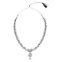 DIMENSION: Necklace Length - 27 cm x Width - 1 cm Earring Height - 5 cm x Width - 1.7 cm Maang Tikka Height - 15 cm x Width - 1.7 cm. Embrace the festive spirit with this exquisite jewelry set featuring a beautiful floral design and delicate ghungroos (small bells). This set includes a stylish long necklace and matching jhumka earrings. The necklace complements various necklines draping gracefully around your neck. The pendant boasts intricate floral detailing making it a noticeable centerpiece. The accompanying earrings are a perfect match striking the right balance between size and comfort. The oxidized silver finish adds a rustic charm to the set making it a timeless addition to your collection. Celebrate Navratri in style and grace with this jewelry set that truly embodies the spirit of the season.