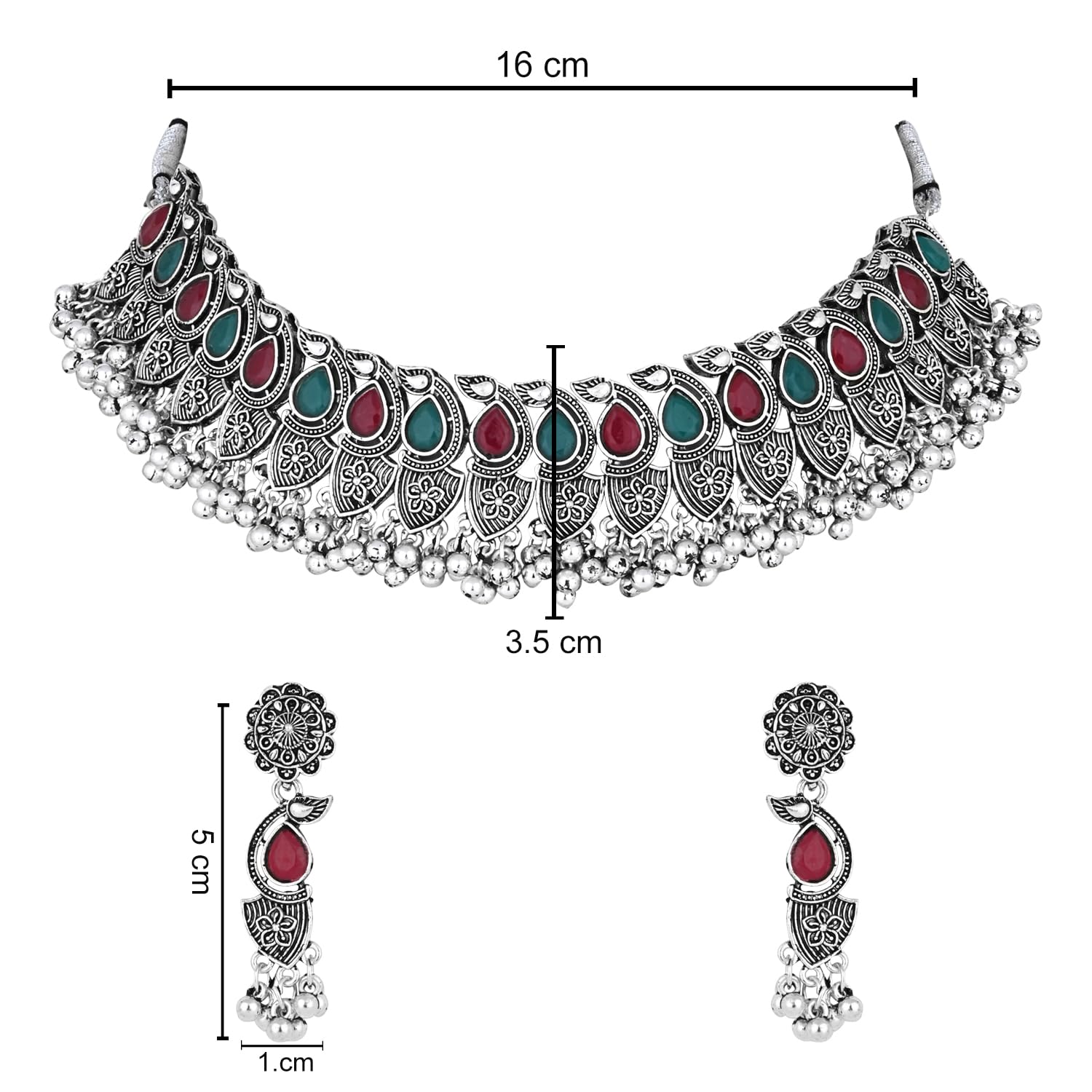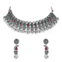 The silver oxidised choker necklace set consists of a necklace and a pair of earrings This stunning necklace set embodies the beauty of the ages with its oxidized metal finish that gives it a sense of timeless elegance. The intricately designed pendant tell a story of craftsmanship and artistry while the long chain drapes gracefully adding a touch of sophistication to any outfit The dark antiqued finish of the metal adds a touch of mystique echoing the aura of the festival's traditional rituals.. Paired with matching earrings this set is a masterpiece that transcends trends making you the center of attention wherever you go.The long chain adds a contemporary twist to the set while the earrings capture the same adventurous essence. Wear this set as a testament to your adventurous soul and your ability to find beauty in every corner of the world.