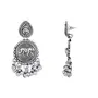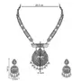 The silver oxidised choker necklace set consists of a necklace and a pair of earrings This stunning necklace set embodies the beauty of the ages with its oxidized metal finish that gives it a sense of timeless elegance. The intricately designed pendant tell a story of craftsmanship and artistry while the long chain drapes gracefully adding a touch of sophistication to any outfit The dark antiqued finish of the metal adds a touch of mystique echoing the aura of the festival's traditional rituals.. Paired with matching earrings this set is a masterpiece that transcends trends making you the center of attention wherever you go.The long chain adds a contemporary twist to the set while the earrings capture the same adventurous essence. Wear this set as a testament to your adventurous soul and your ability to find beauty in every corner of the world.
