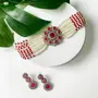 The silver-plated choker necklace set consists of a necklace a pair of earrings. The necklace features kundan studded with pearl beaded in it giving it an elegant and traditional look. The stones and pearls are set in a beautiful pattern adding a touch of sophistication and grace to the necklace. The necklace is secured with drawstring closures which make it easy to adjust the size to fit comfortably around the neck. This is an important feature as it ensures that the necklace will be comfortable to wear for extended periods of time. The necklace is secured with drawstring closures which make it easy to adjust the size to fit comfortably around the neck. This is an important feature as it ensures that the necklace will be comfortable to wear for extended periods of time. The earrings and maang tikka are also adorned with stones and pearls which match the pattern of the necklace. The earrings have a beautiful design which makes them easy and comfortable to wear. The maang tikka is a traditional Indian hair accessory that can be worn with the necklace and earrings to complete the look.