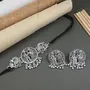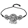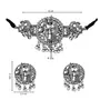 The silver oxidised choker necklace set consists of a necklace and a pair of earrings This stunning necklace set embodies the beauty of the ages with its oxidized metal finish that gives it a sense of timeless elegance. The intricately designed pendant tell a story of craftsmanship and artistry while the long chain drapes gracefully adding a touch of sophistication to any outfit The dark antiqued finish of the metal adds a touch of mystique echoing the aura of the festival's traditional rituals.. Paired with matching earrings this set is a masterpiece that transcends trends making you the center of attention wherever you go.The long chain adds a contemporary twist to the set while the earrings capture the same adventurous essence. Wear this set as a testament to your adventurous soul and your ability to find beauty in every corner of the world.
