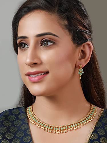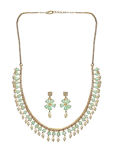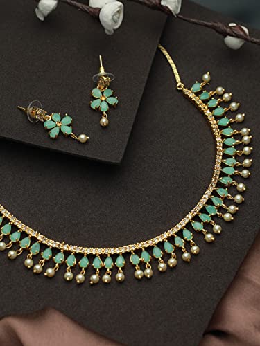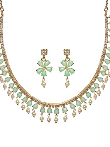 HomeFashionNecklacePriyaasi Mint Green Stone-Studded American Diamond Jewellery Set for Women | Floral Leaf Design | Pearl Drop | Gold-Plated | Indian Jewelry Set - For Wedding Festivals & Party