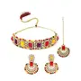 Sukkhi Affordable Squared Style Multi Kundan & Beads Studded Choker Necklace Set For Women. Make a bold fashion statement with the Sukkhi Multi Gold Plated Kundan & Beads Collar Necklace Set. This stunning jewelry set features a gold-plated collar necklace adorned with beautiful Kundan stones and beads in a captivating multi-color design. The combination of vibrant colors adds a playful and eye-catching element to your look making it a perfect accessory for festive occasions and celebrations. The collar design exudes elegance and charm enhancing your neckline and creating a focal point for your ensemble. With its impeccable craftsmanship and attention to detail this necklace set is a must-have addition to your jewelry collection. Embrace the beauty of tradition and showcase your unique style with the Sukkhi Multi Gold Plated Kundan & Beads Collar Necklace Set.