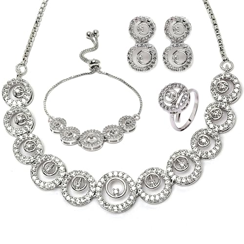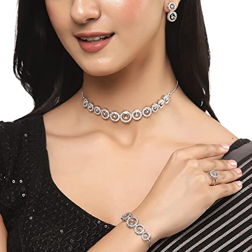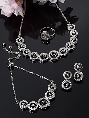 What You Get:- This jewellery set consists of a necklace a pair of earrings bracelet and ring. Rhodium-Plated Silver Toned Necklace has White American Diamond studded detail secured with S-Hook closure. A pair of matching Star Shaped Drop Earrings each secured with a Post and Back Closure. A matching Star Shaped Bracelet secured with Drawstring closure. A matching Star Shaped Ring secured with Adjustable closure. LUXURY GIFTING IDEA:- Give a meaningful and luxurious gift with Zeneme Jewellery. A favourite gift choice each Zeneme jewellery for women comes with a Signature gift box and makes excellent gift choice for birthdays wedding anniversaries Valentine's Day Mother's Day Diwali Christmas and all your special occasions. MATERIAL CRAFTSMANSHIP:- Finest quality stones and environmentally friendly nonprecious Metals are used for making the jewelry set. It is safe for wearing for long hours. Exquisite handwork is required since some crystals are too small to pick my fingers really hard and time-consuming. JEWELLERY CARE:- Keep the jewellery away from direct heat water perfumes deodorants and other strong chemicals as they may react with the metal or plating. Store the jewellry when not in use in a storage box or a cloth pouch to retain its shine. Nickel free and Lead free as per International Standards that makes it very skin friendly. The plating is non-allergic and safe for all environments.