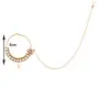 This traditional nose pin is crafted in gold-plating and features Pearl beaded clip-on nose ring with chain connecting to a hook closure. Style this nose pin with your ethnic attires for festive ready look. No piercing required. Perfect Accessory for every jewelry box!